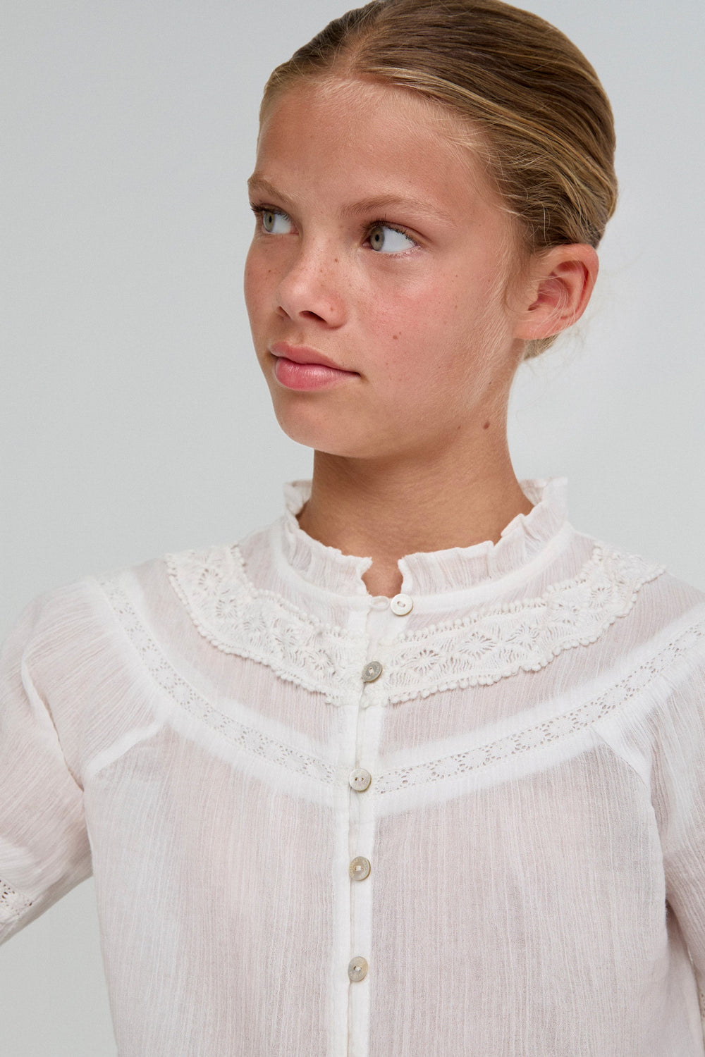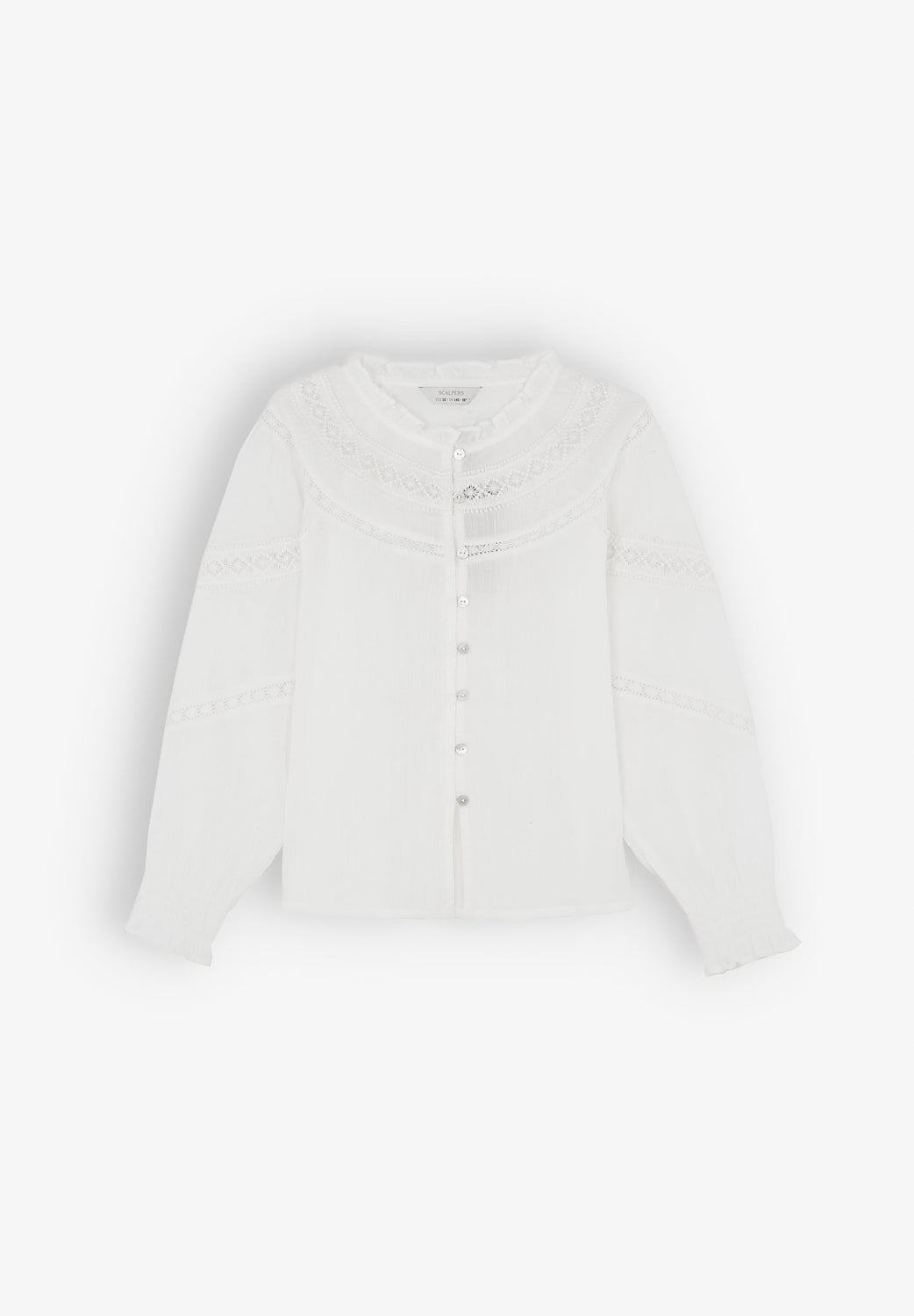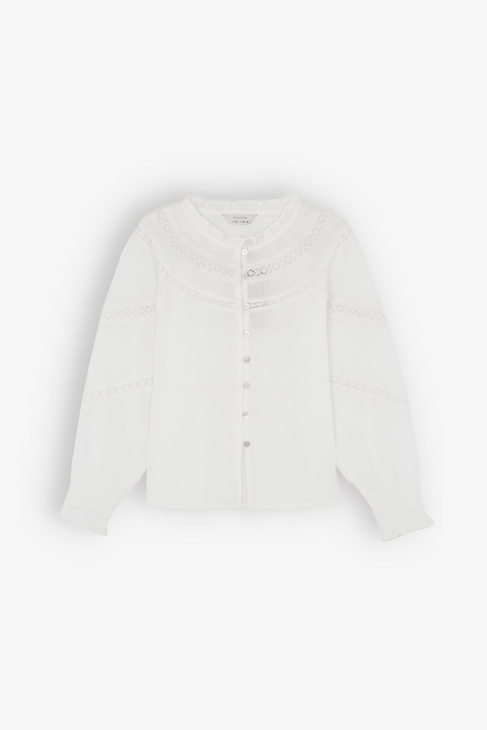 Blouse made of 100% BCI cotton. Regular fit, high ruffled collar, lace trim and button fastening. Long sleeves with ruffled cuffs.