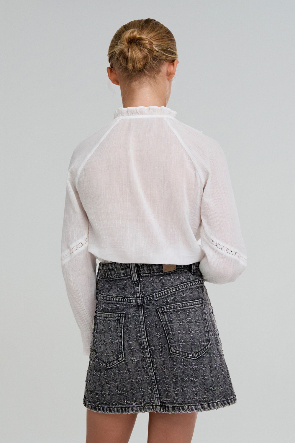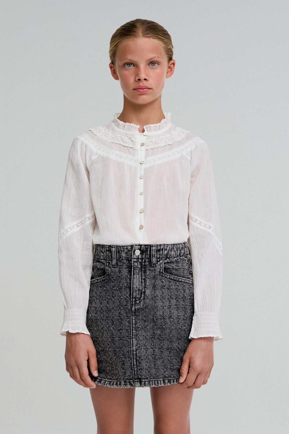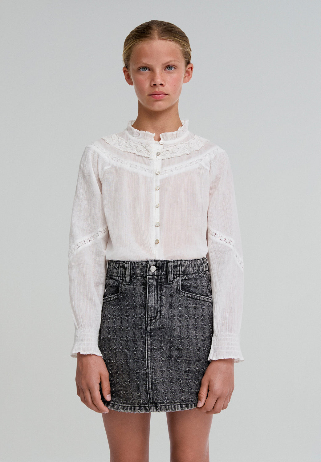 Blouse made of 100% BCI cotton. Regular fit, high ruffled collar, lace trim and button fastening. Long sleeves with ruffled cuffs.