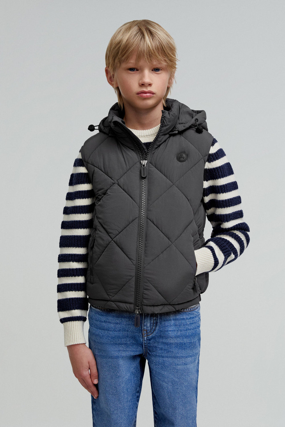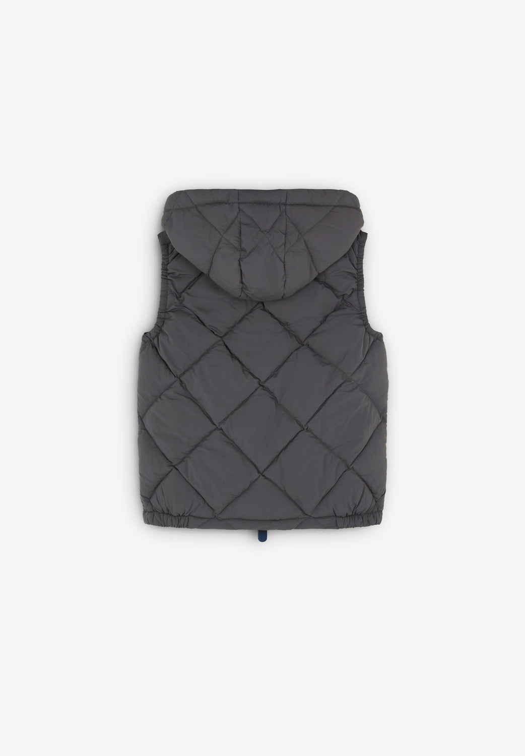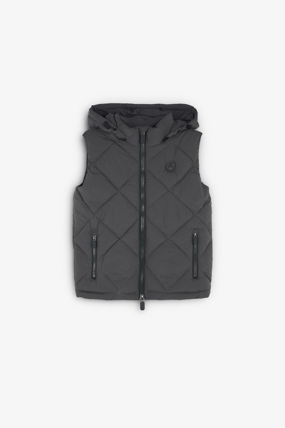 Quilted gilet with detachable hood and adjusters. Made of technical fabric. Regular fit. High collar with chin guard and hood. Double slider zip fastening. Sleeveless design. Side zip pocket and an inner pocket. Matching rubber patch detail on the chest.