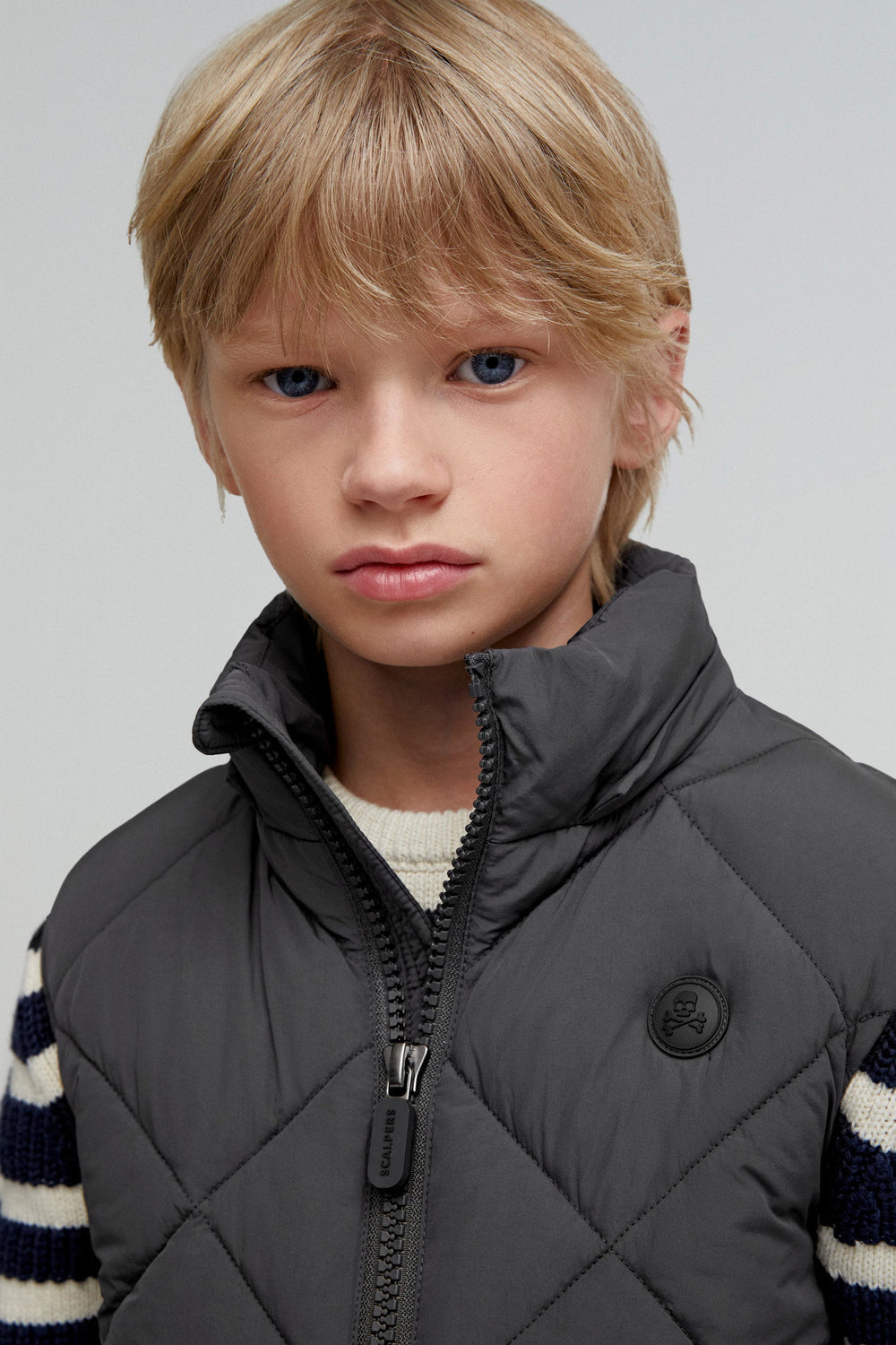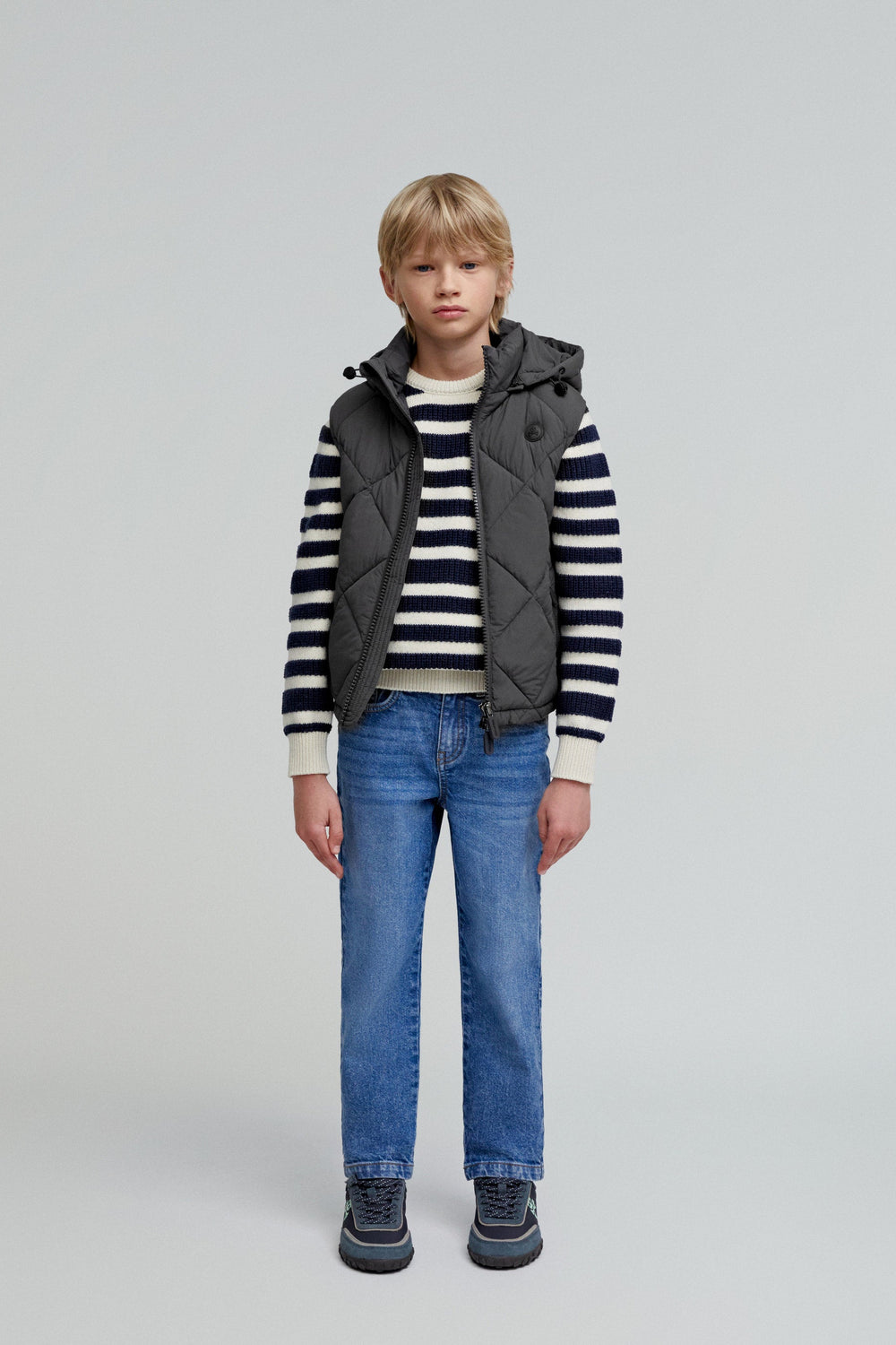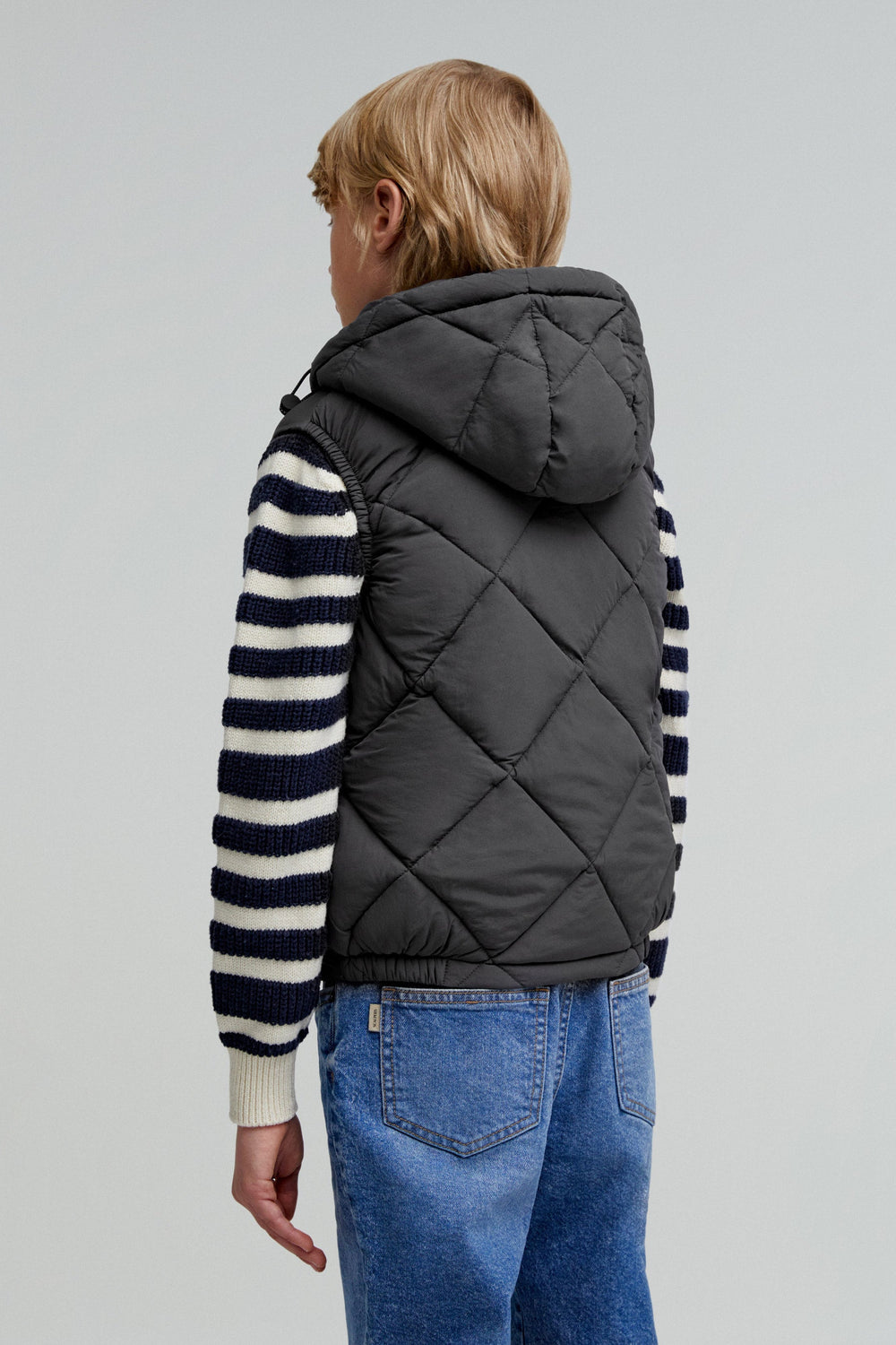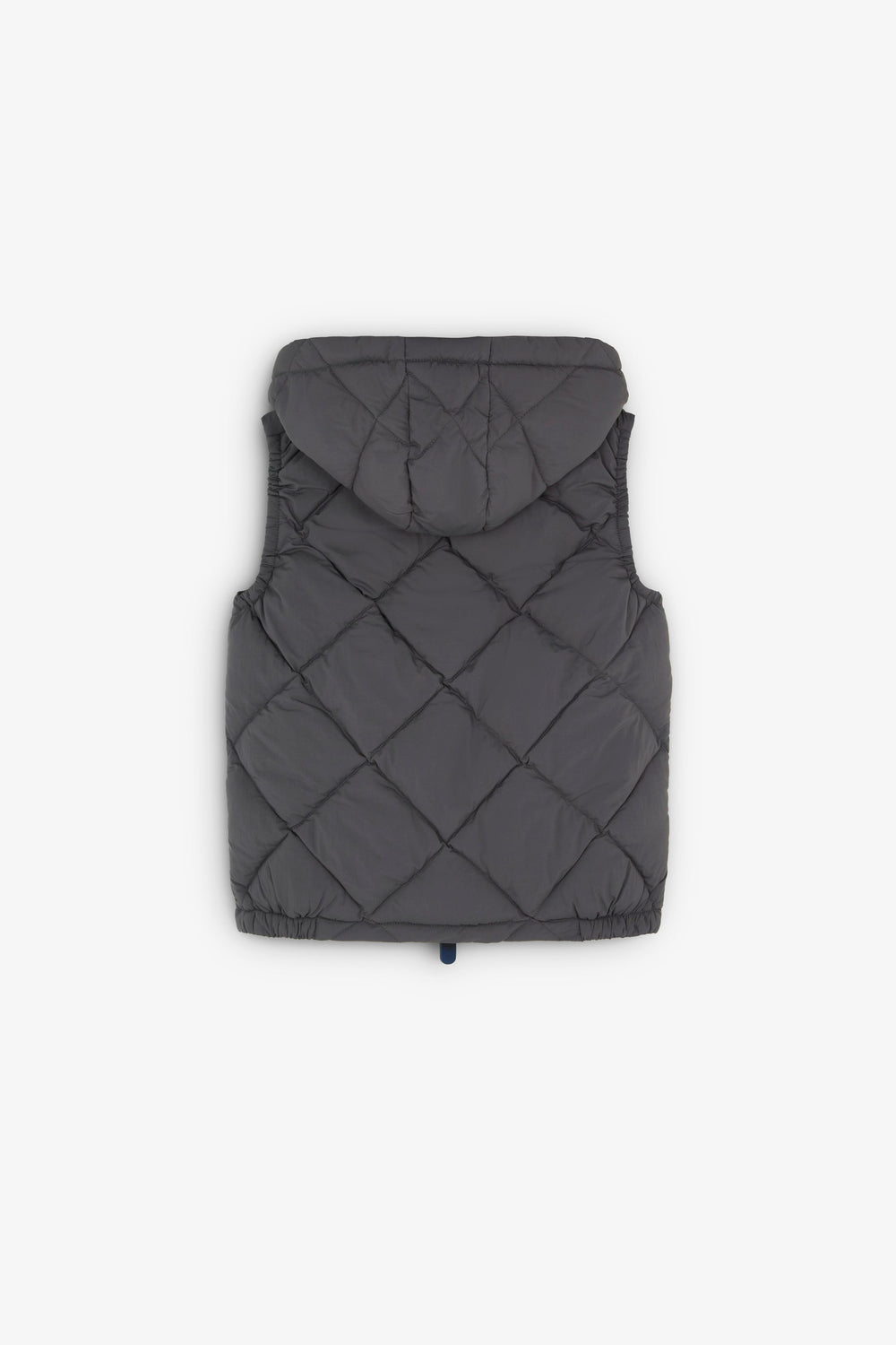Quilted gilet with detachable hood and adjusters. Made of technical fabric. Regular fit. High collar with chin guard and hood. Double slider zip fastening. Sleeveless design. Side zip pocket and an inner pocket. Matching rubber patch detail on the chest.