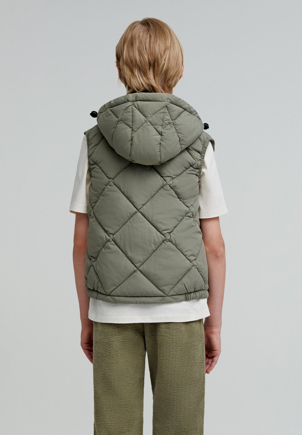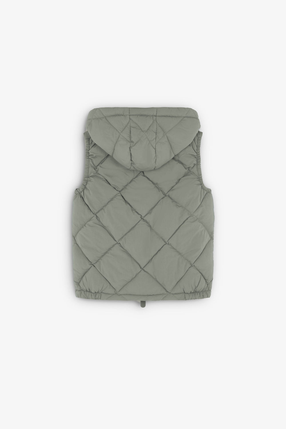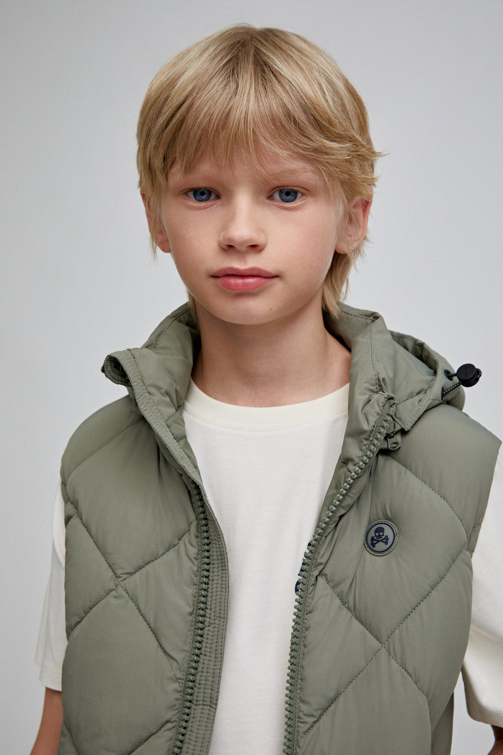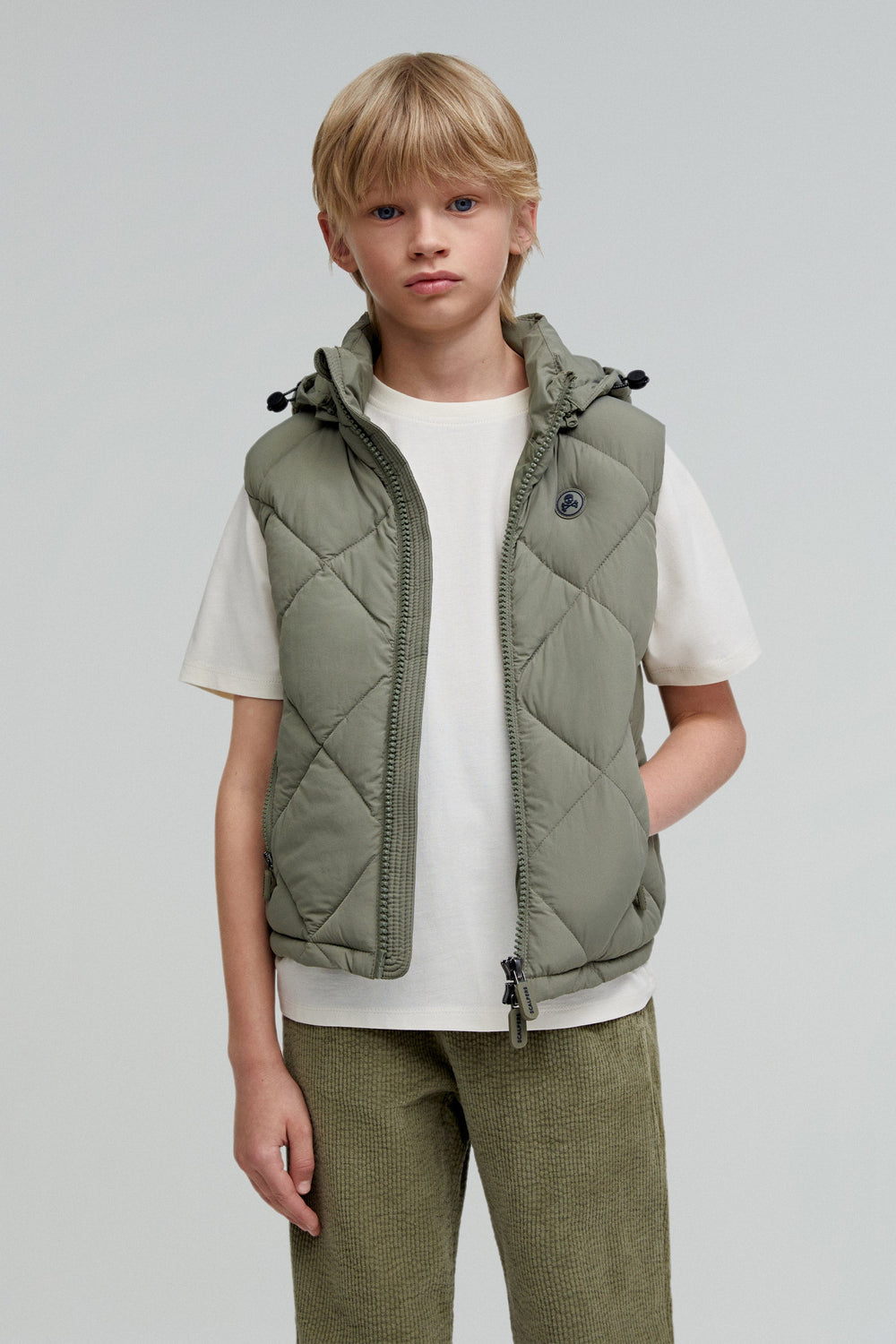 Quilted gilet with detachable hood and adjusters. Made of technical fabric. Regular fit. High collar with chin guard and hood. Double slider zip fastening. Sleeveless design. Side zip pocket and an inner pocket. Matching rubber patch detail on the chest.