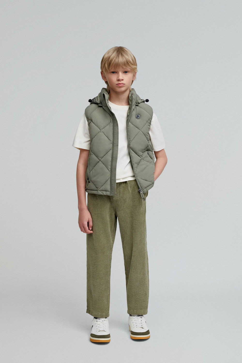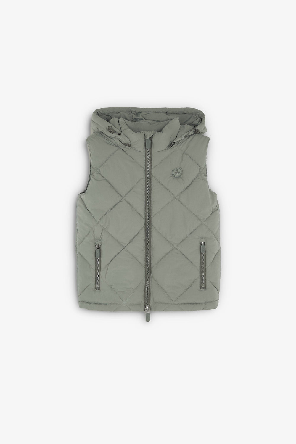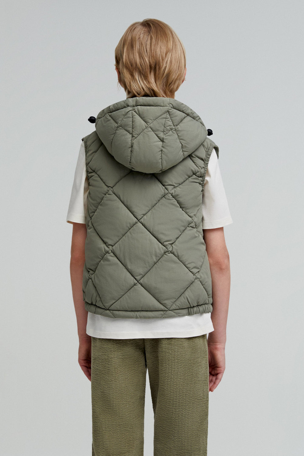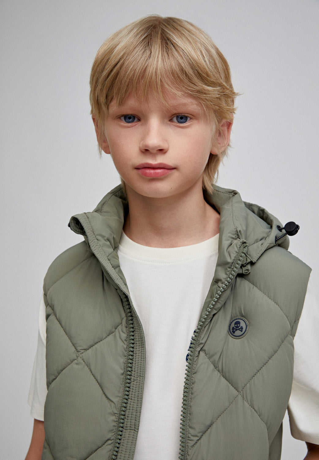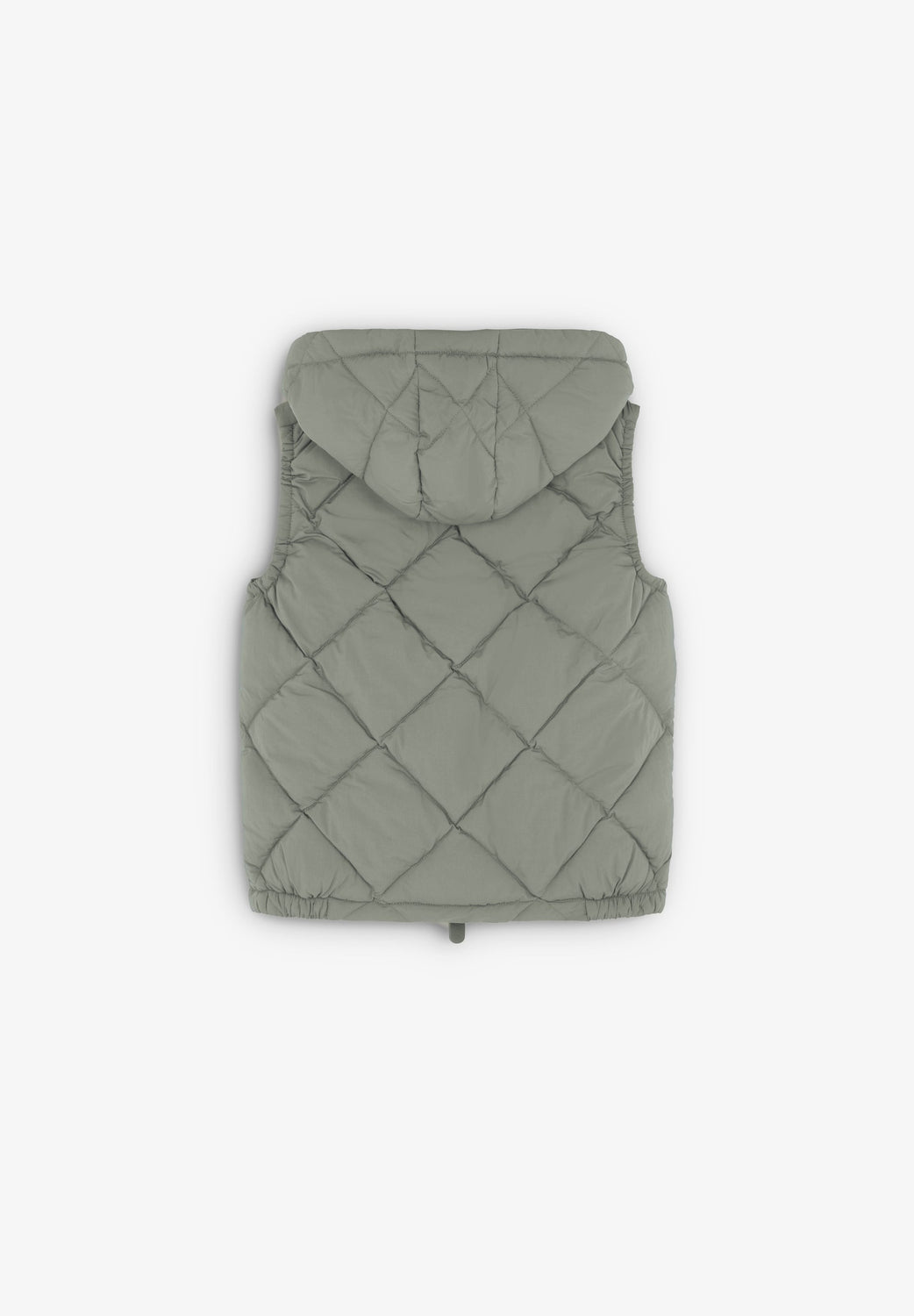 Quilted gilet with detachable hood and adjusters. Made of technical fabric. Regular fit. High collar with chin guard and hood. Double slider zip fastening. Sleeveless design. Side zip pocket and an inner pocket. Matching rubber patch detail on the chest.