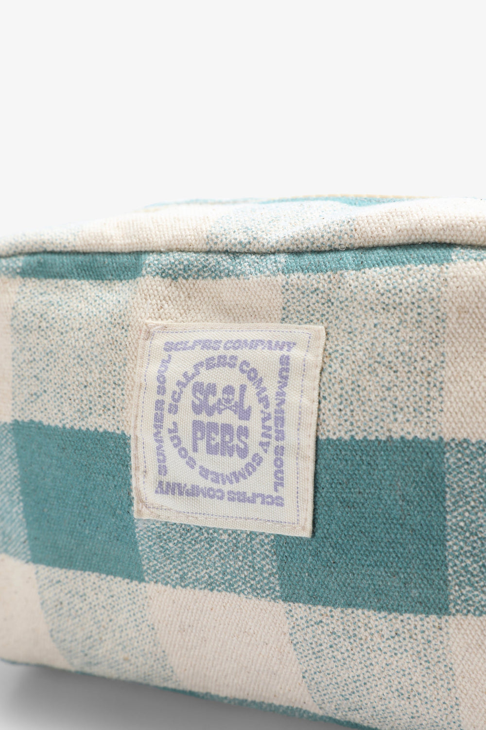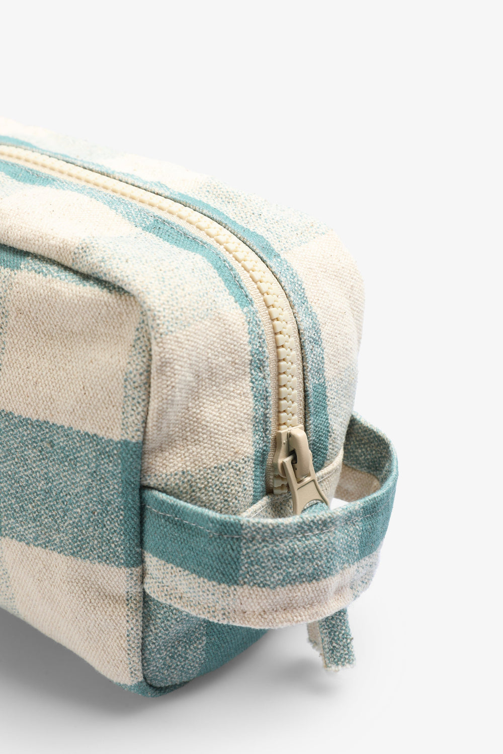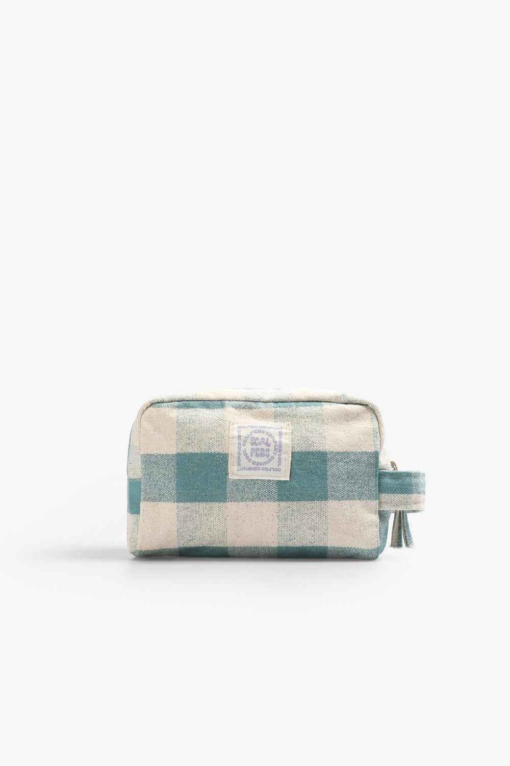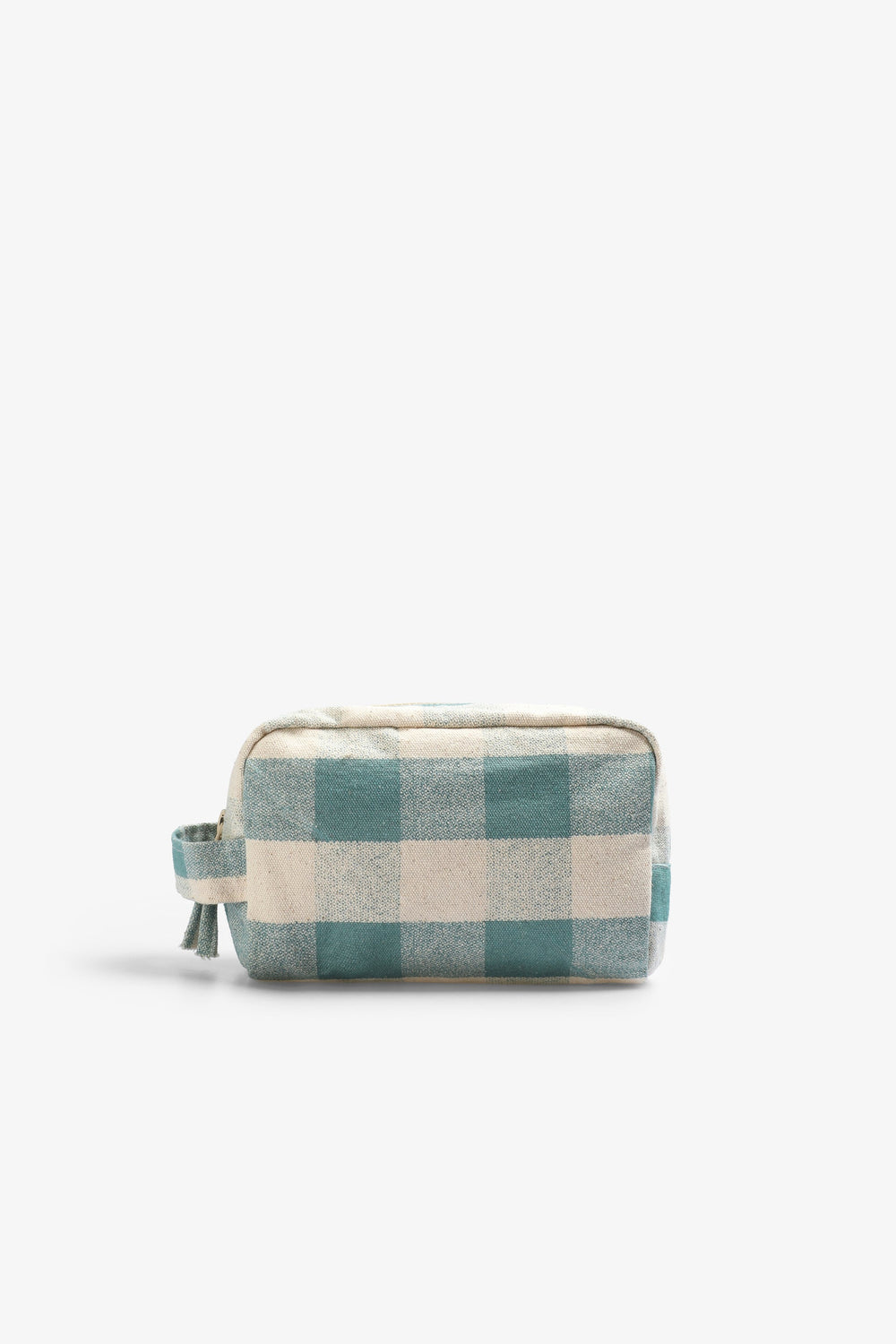 Check toiletry bag made of a cotton blend. Zip closure and side handle. Front label.