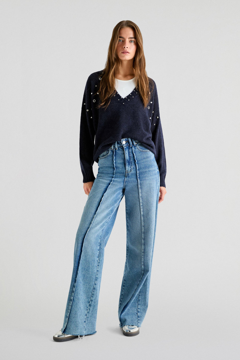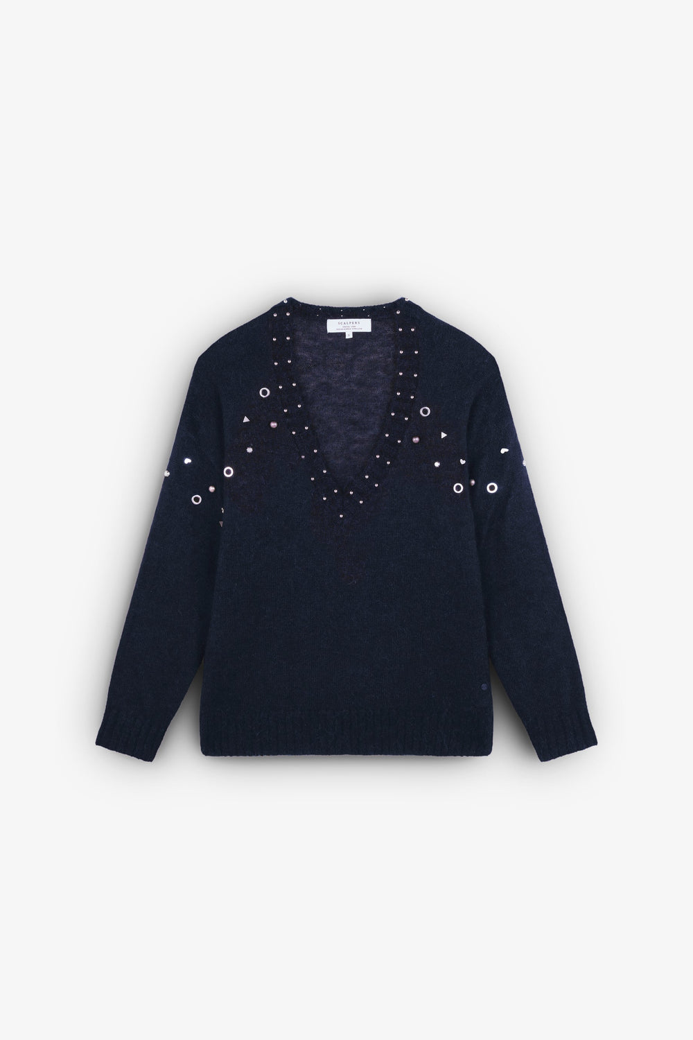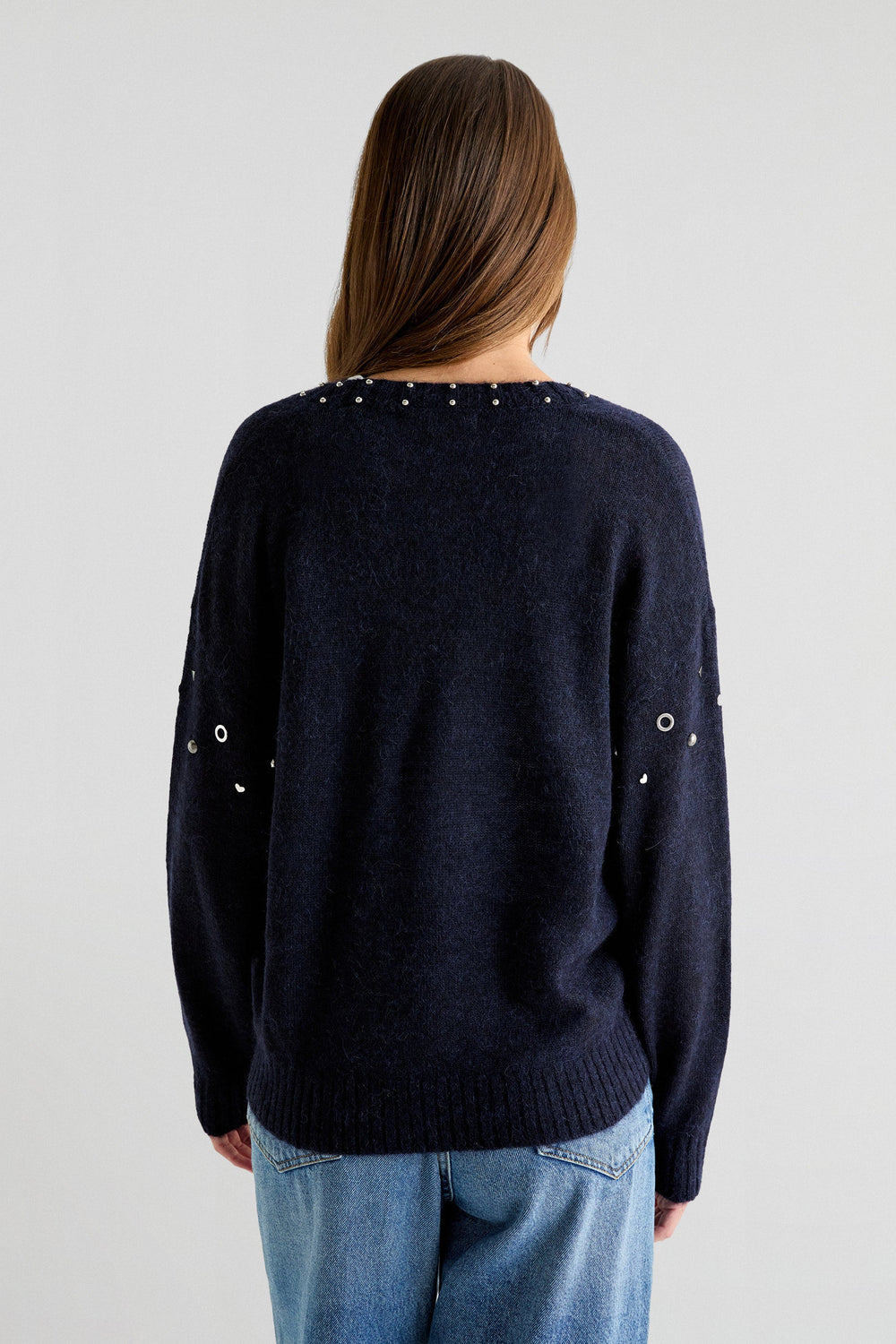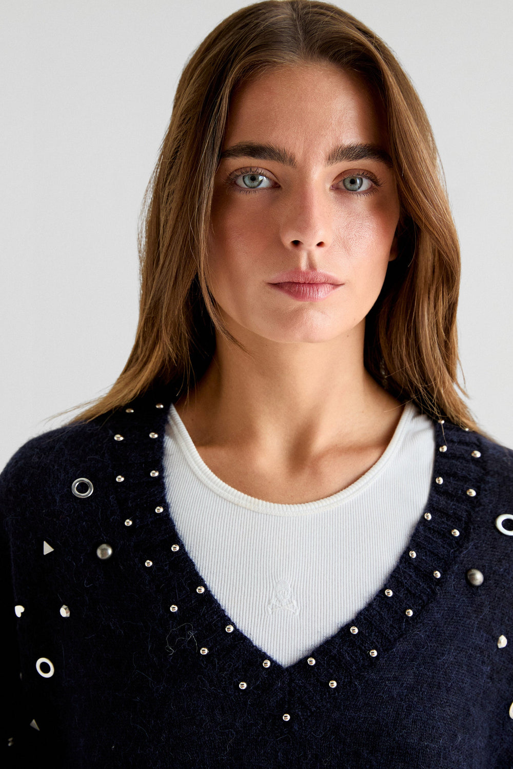 Jumper made of wool and alpaca blend. Regular fit, V-neck and long sleeves. Stud detail.
