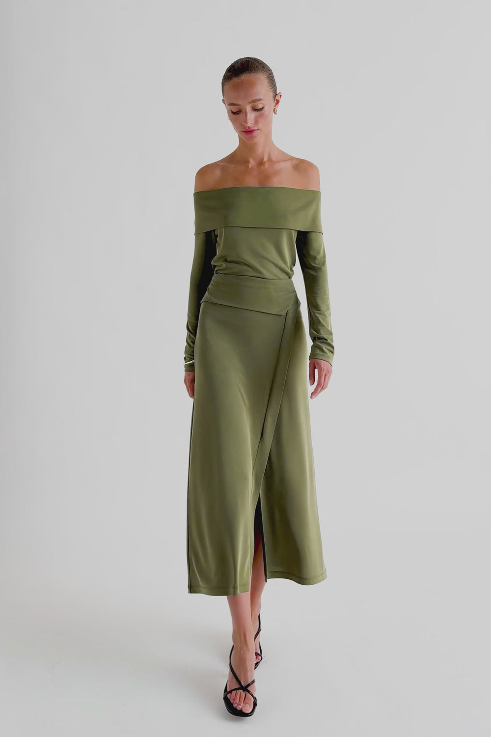 Top with a straight turn-up neckline. Made of flowing fabric. Long sleeves. Slim fit.