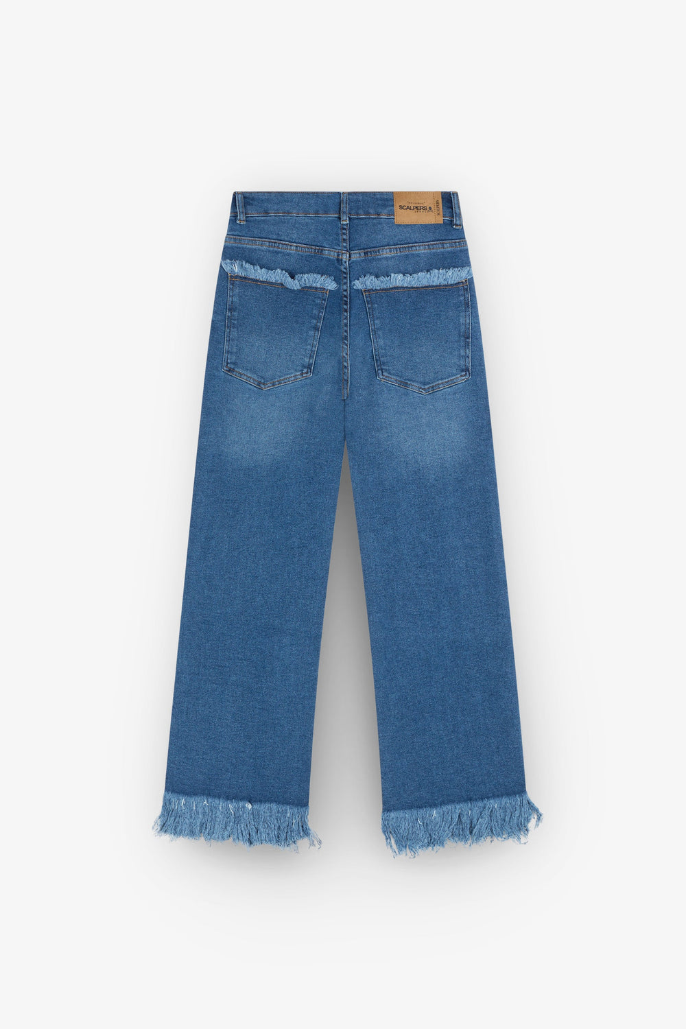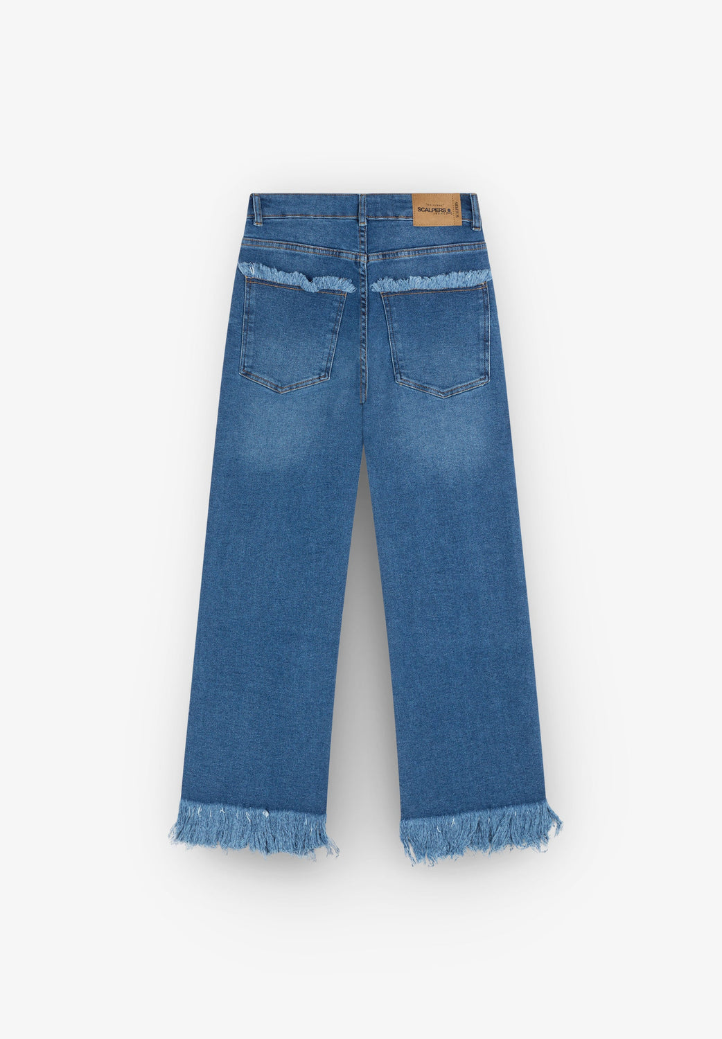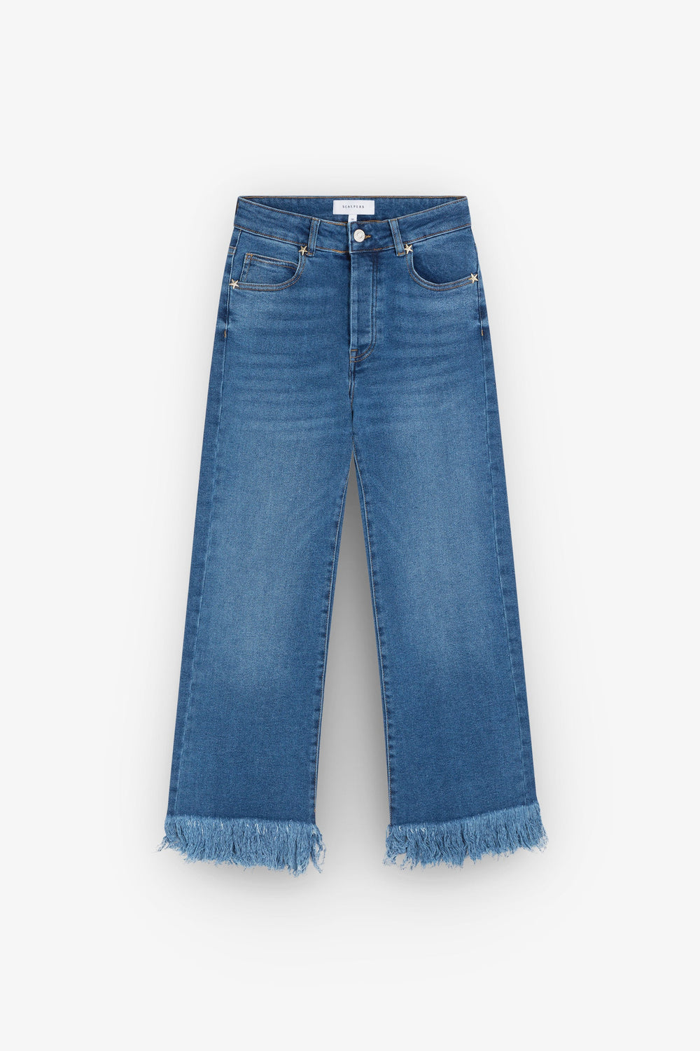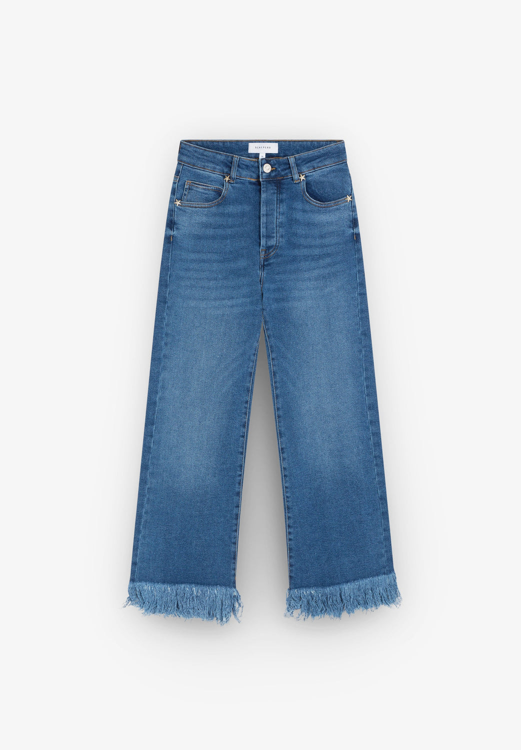 Culotte jeans. Button and zip fly fastening pockets and frayed edge hems. Features belt loops.