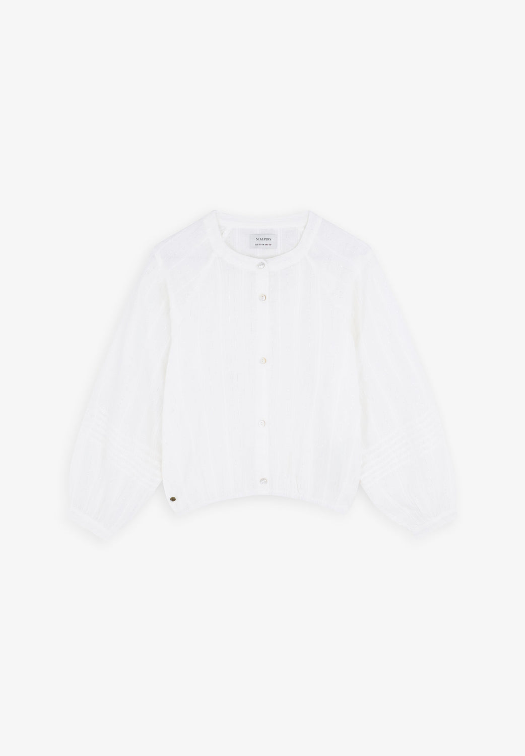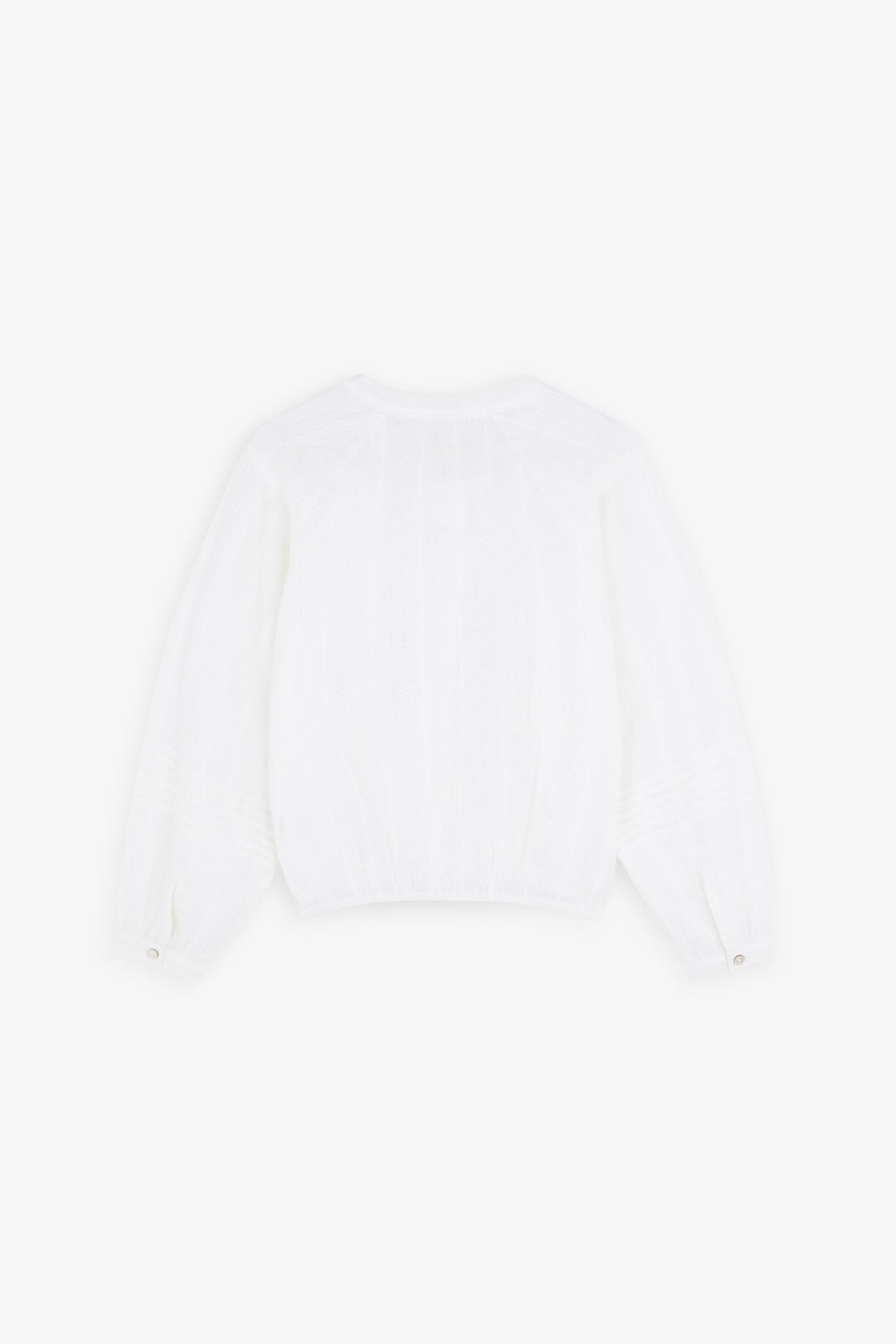 Cotton shirt with stand-up collar. Elasticated detail on hem and cuffs. Embroidered details on sleeves. Front button fastening.
