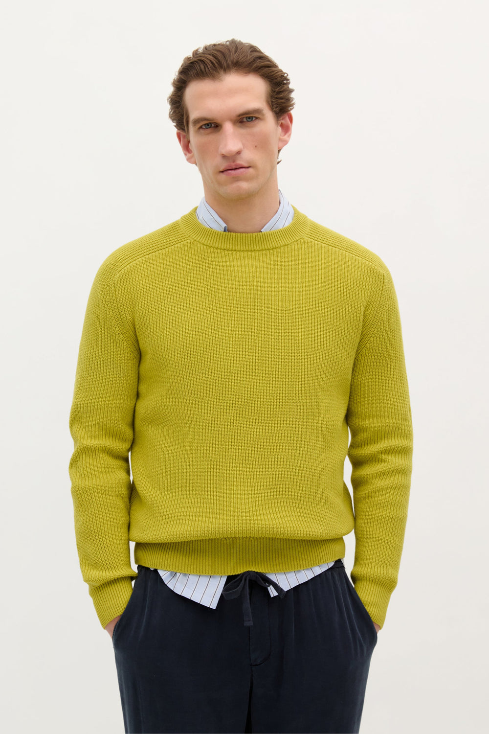 Purl knit sweater. Made of 100% BCI Cotton. Regular fit. Round neck. Long raglan sleeves, Ribbed trim.
