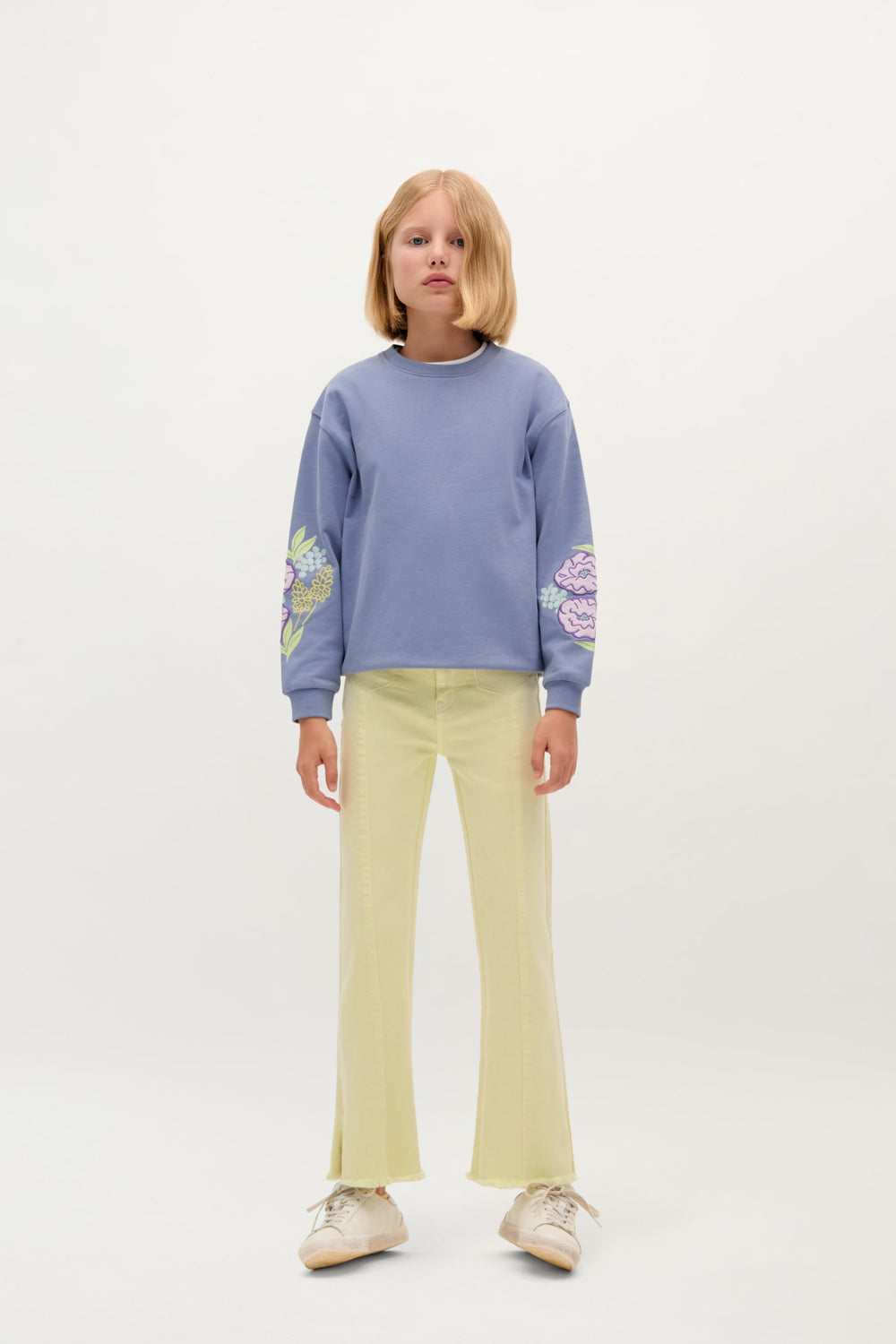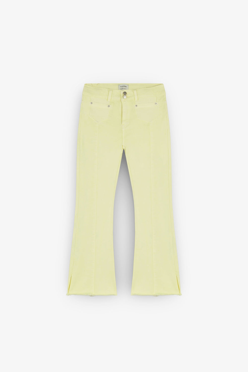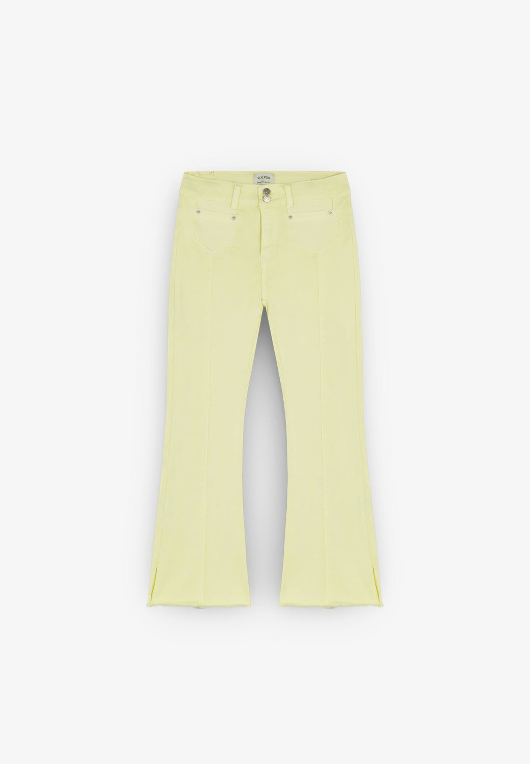 Trousers made of slightly stretchy cotton. Flared. Two button and zip fastening. Front and back pockets. Seam detail on the front. Side slit and frayed hems.