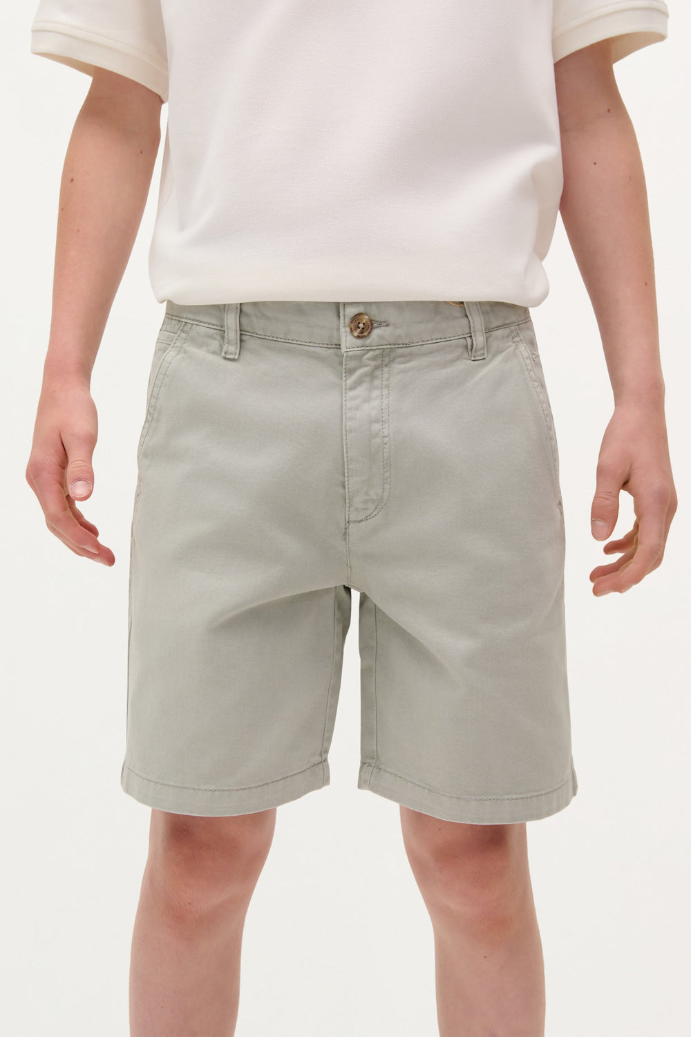 Bermuda shorts made of 100% organic cotton. Front button and zip fastening. Belt loops at the waist. Two front pockets and two buttoned back pockets. Logo label detail.