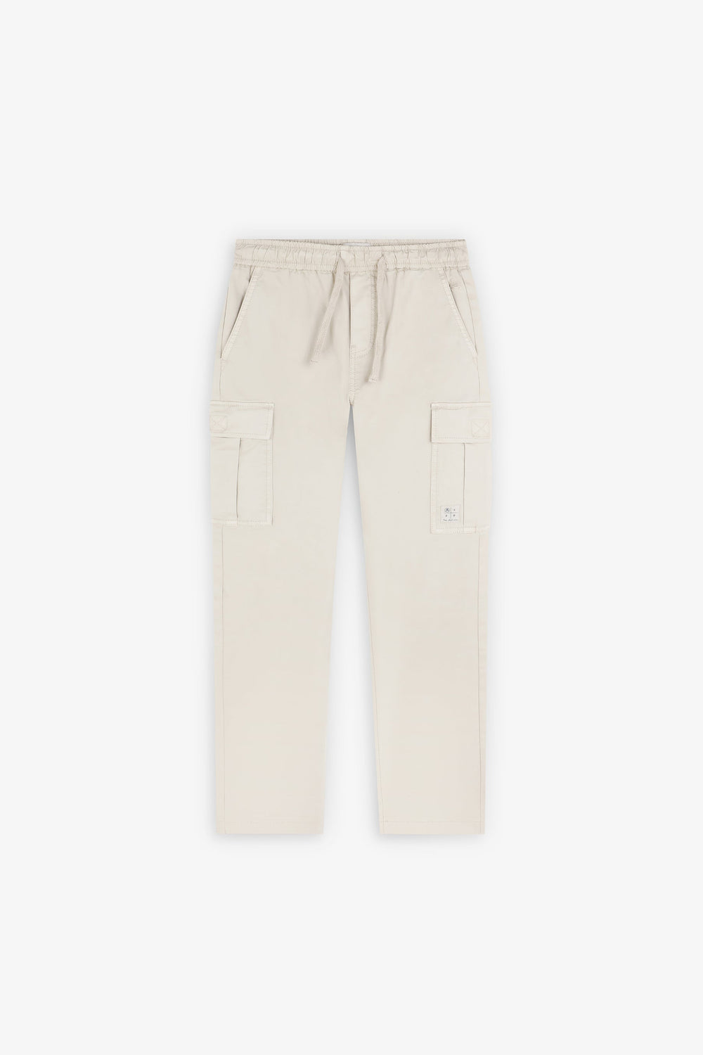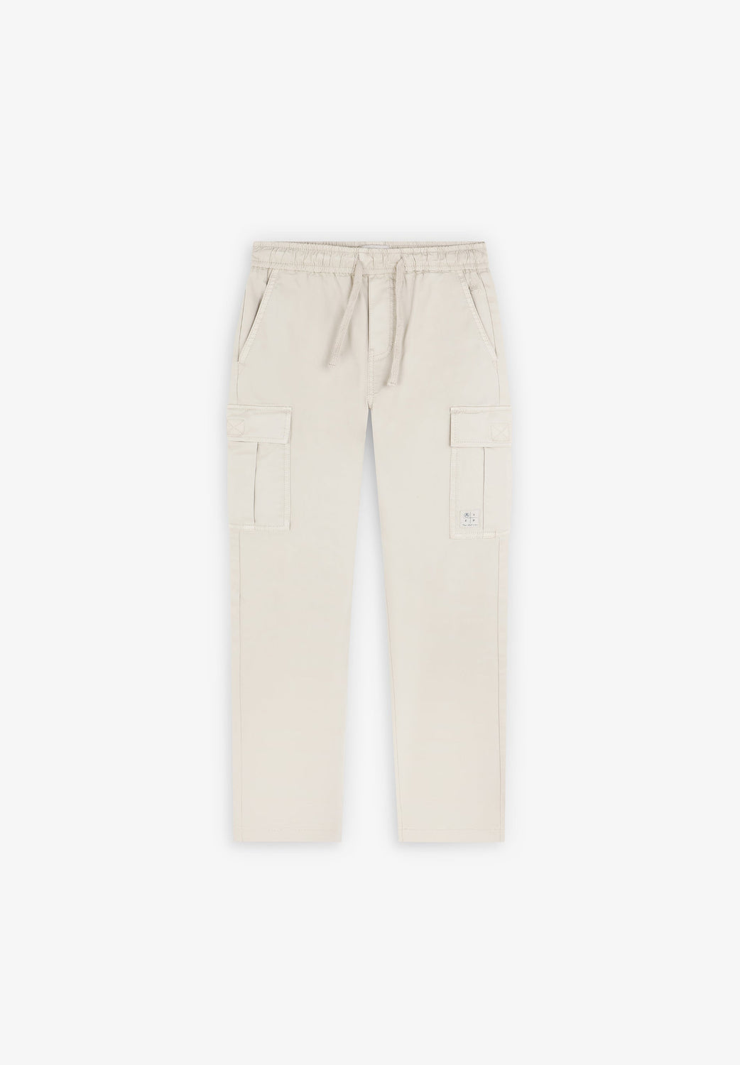 Cargo trousers made of slightly stretch BCI cotton. Regular fit, adjustable waist and side leg pockets with flap and Velcro fastening. Embroidered logo on waistband and label detail on lower left pocket.