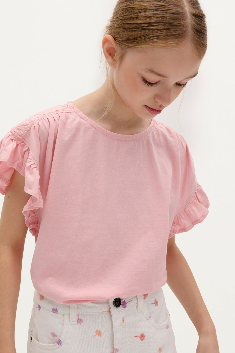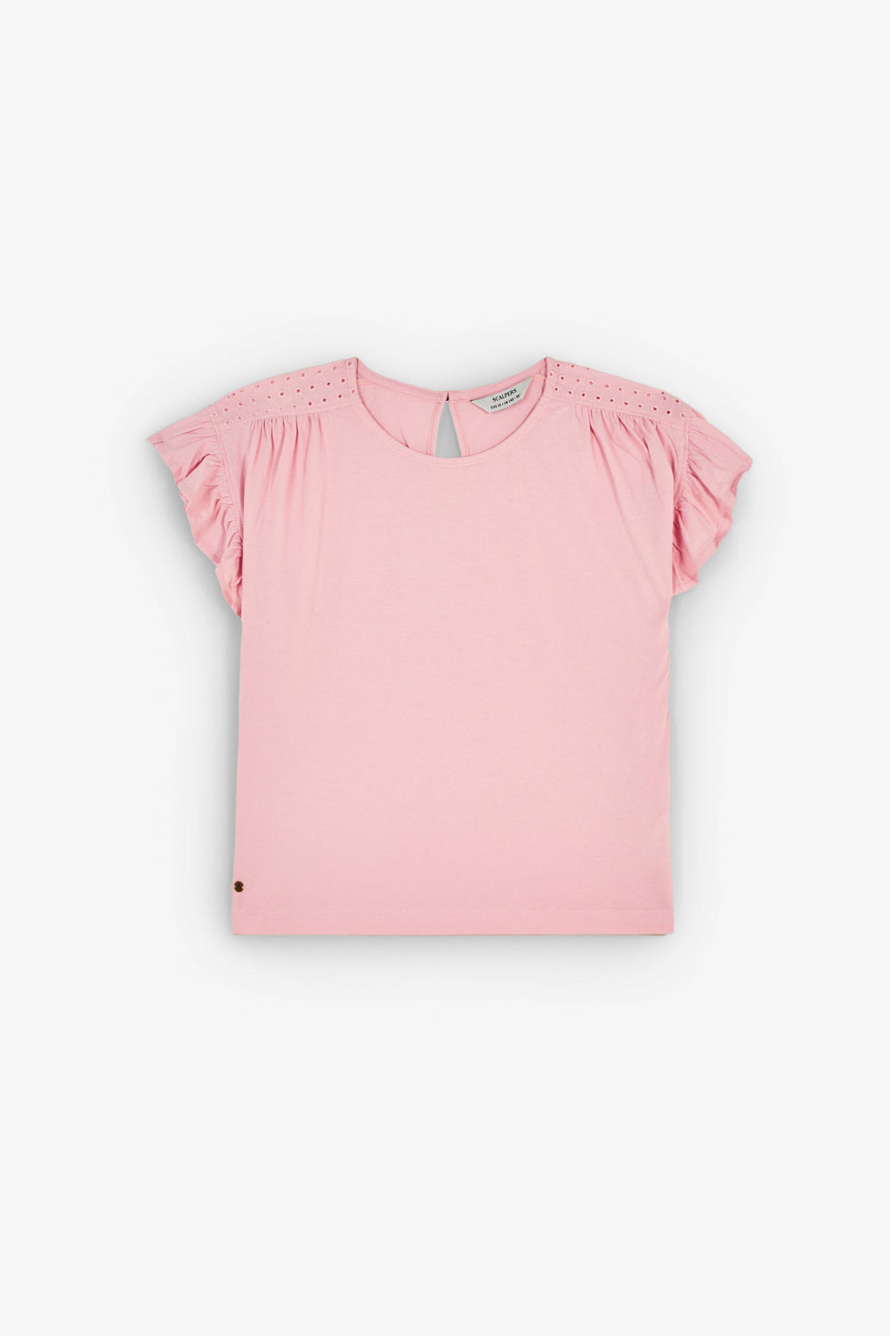 Shirt made of 100% BCI cotton with round neck and sleeveless with ruffle detail. Regular fit. Embroidered detail on shoulder pads and teardrop fastening on the back.