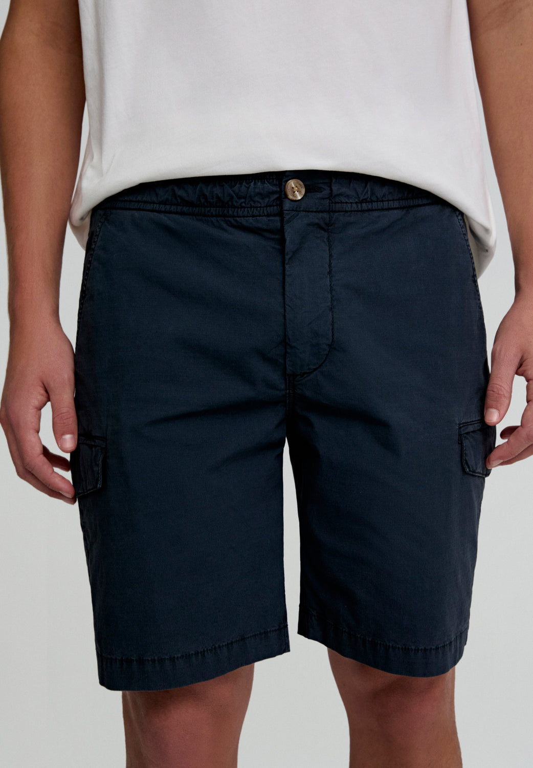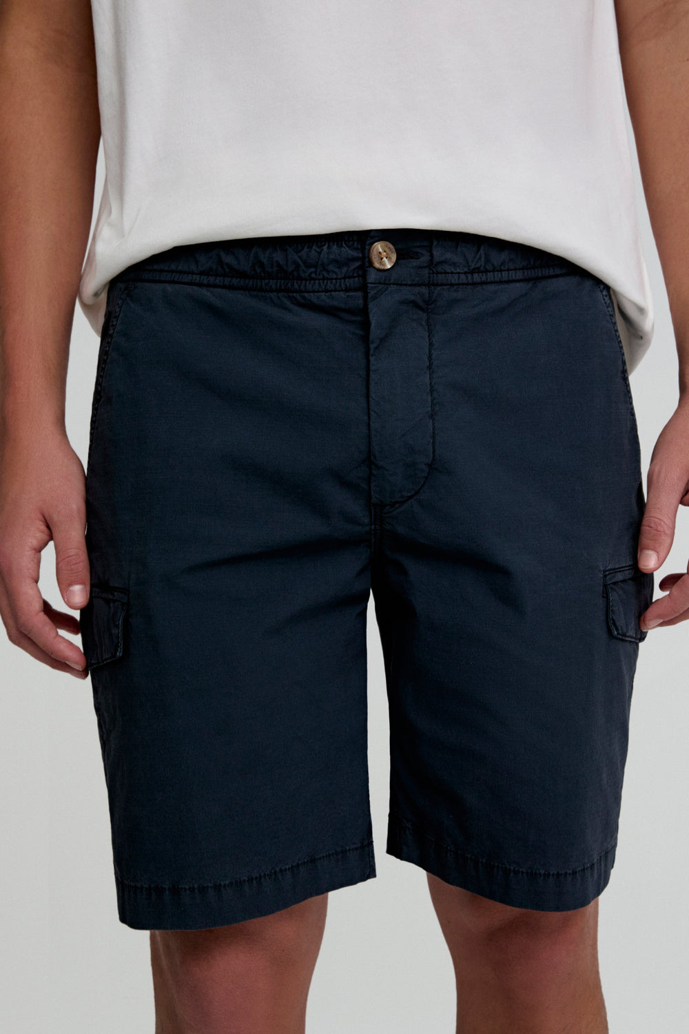 Bermuda cargo efecto lavado. Confeccionada en algodón orgánico. Corte Regular fit. Cierre con botón y cremallera. Bolsillos laterales. Bolsillos en pernera de parche con solapa y cierre con snaps. Bolsillos trasero de parche. Trabillas en cintura. Detalle de calavera bordada a tono.