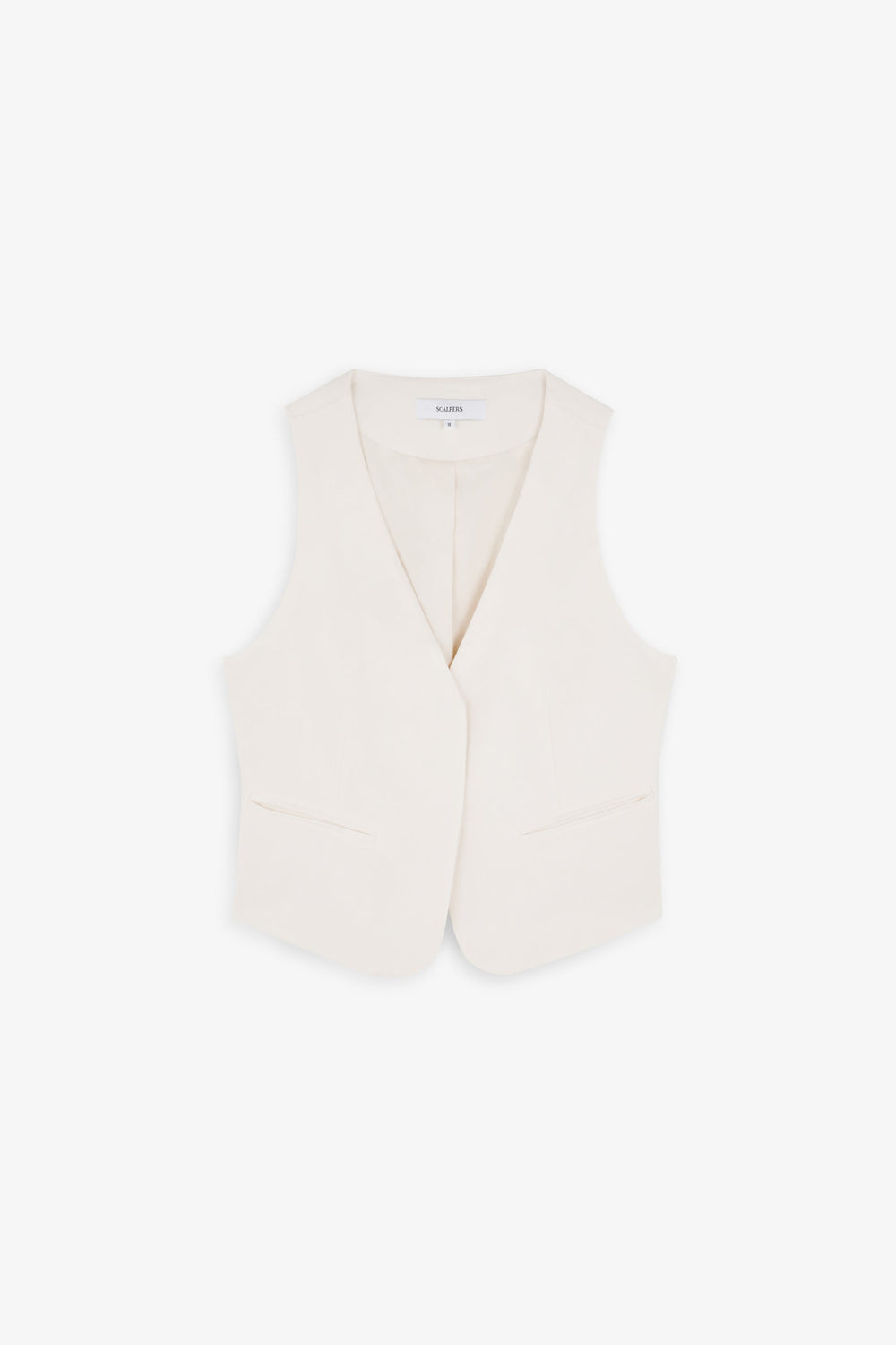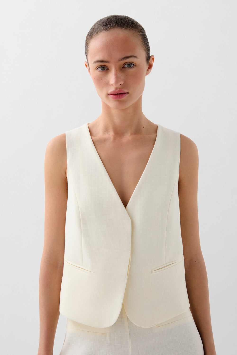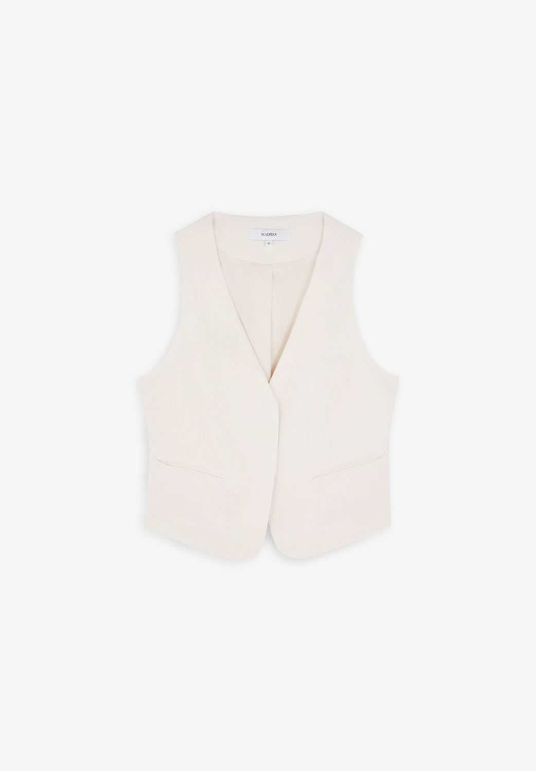 Waistcoat made of a cotton blend. Regular fit, V-neck and button fastening. Front pockets with piping and back tie.