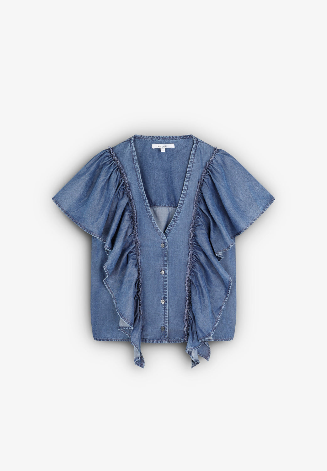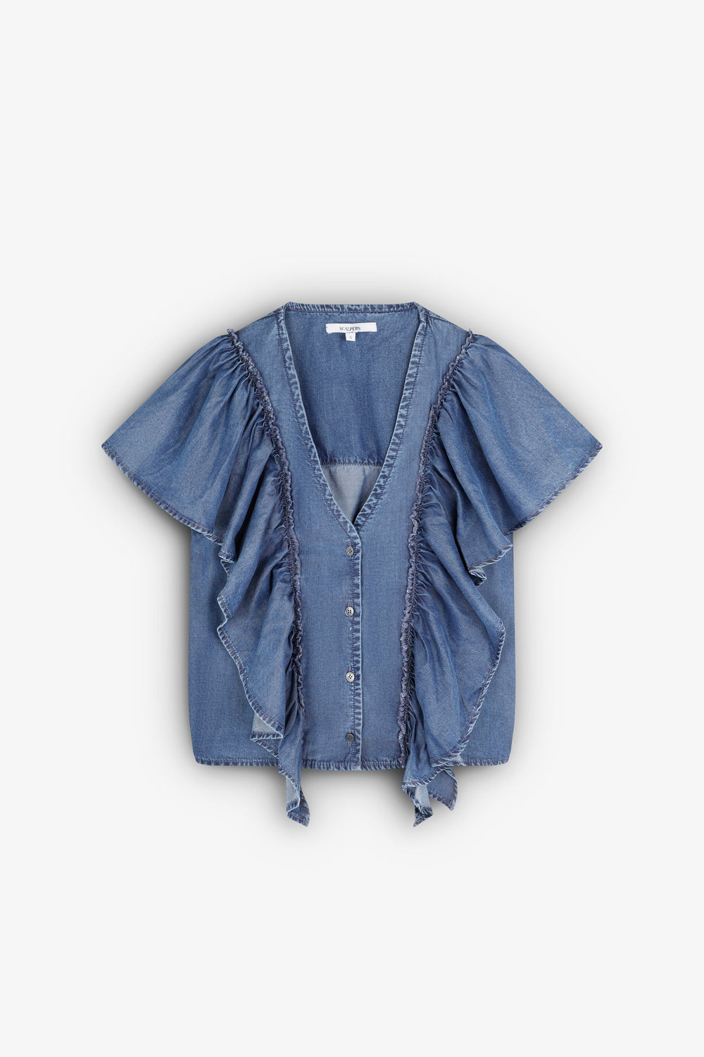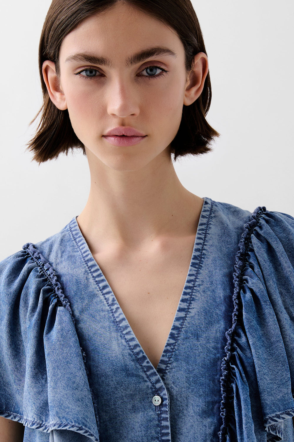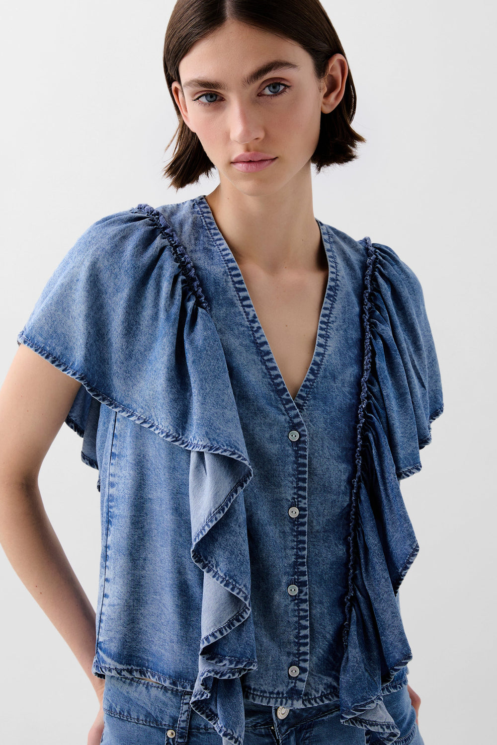 Fluid denim style shirt. Regular fit, V-neck, sleeveless design with ruffle on the shoulder that continues down the chest and back. Button fastening.