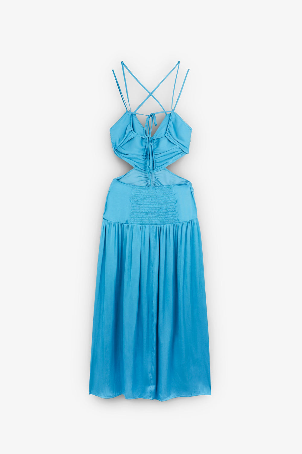 Dress made of slightly satiny fabric. Slim fit with adjustable tie fastening at the back. V-neck with ruching to the waist.