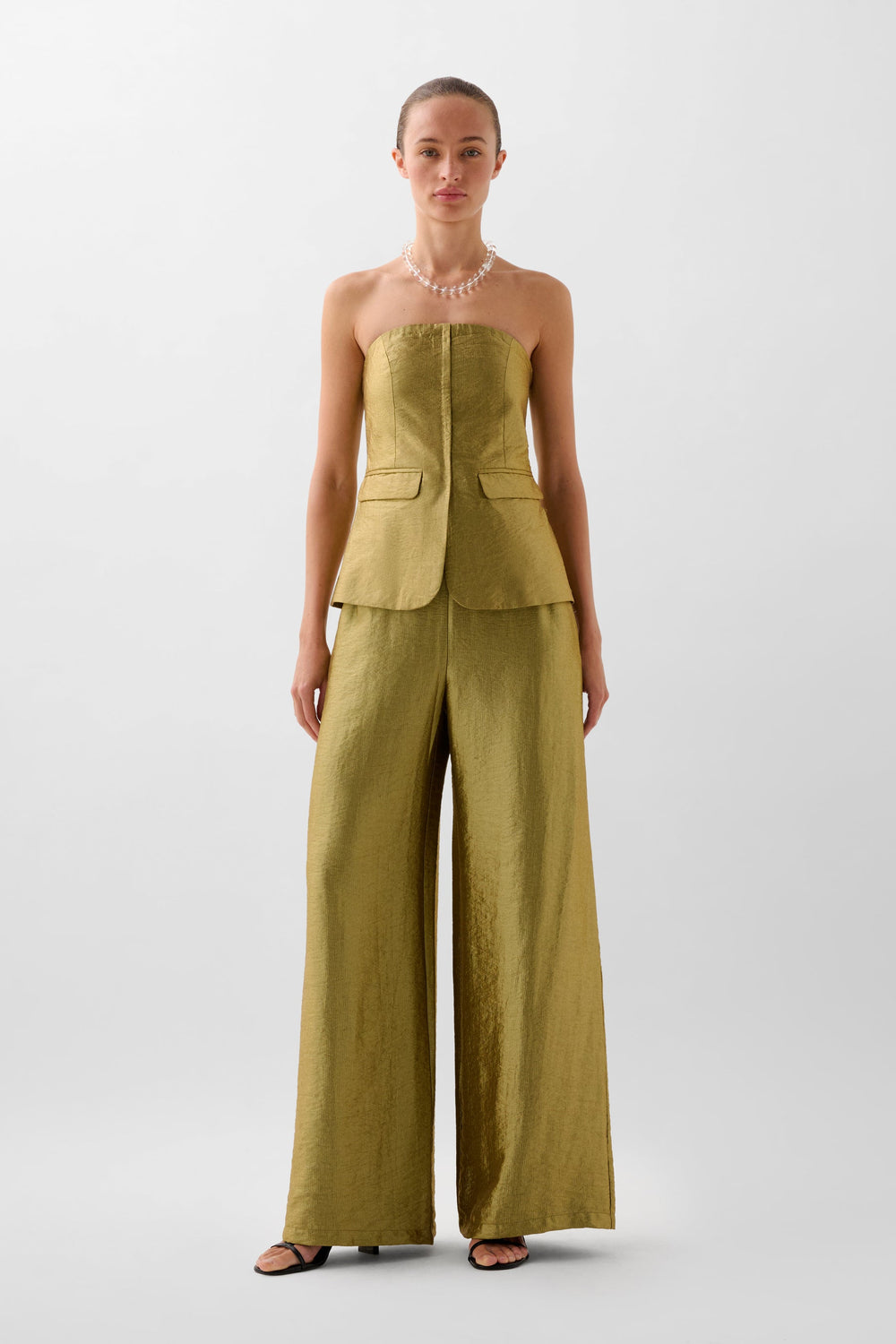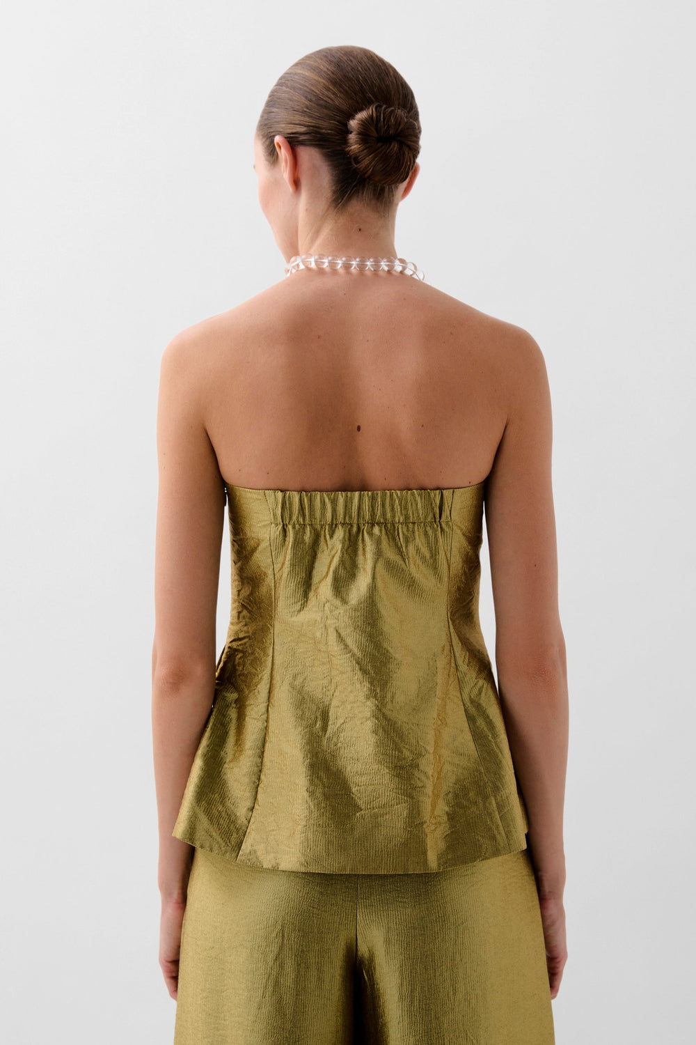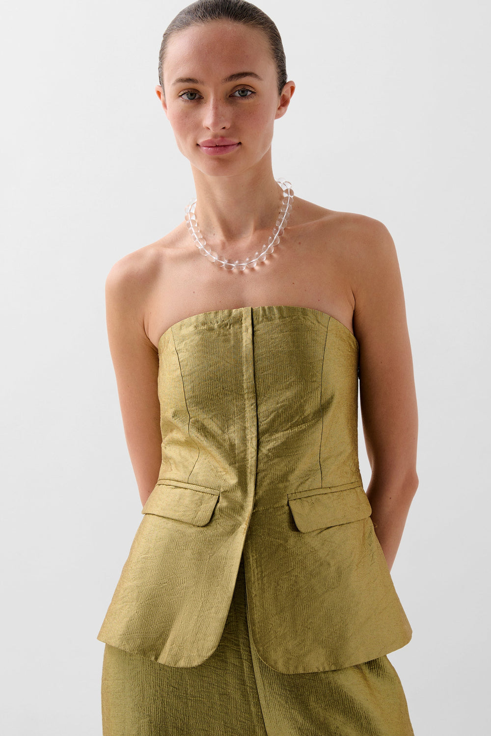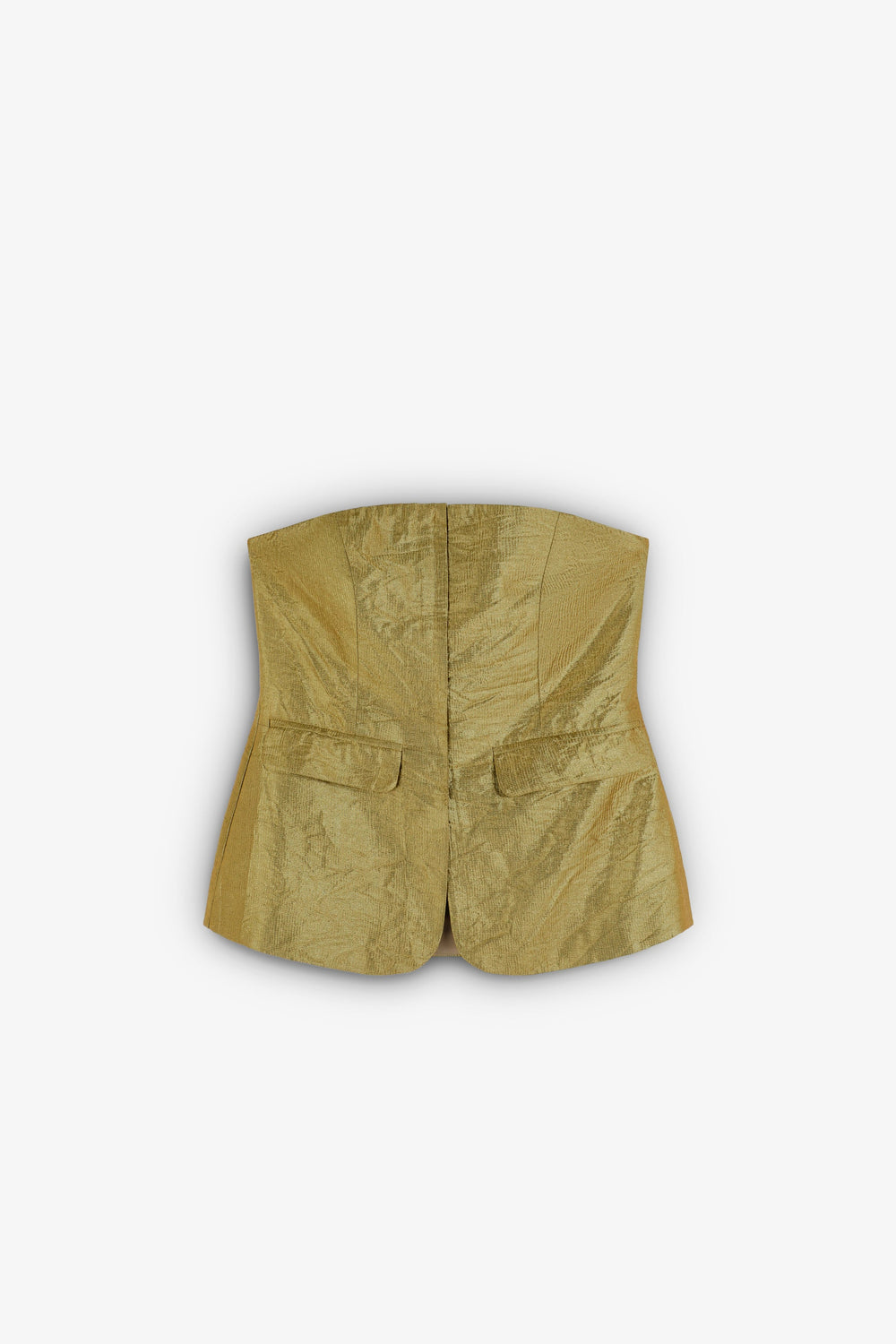 Metallic fabric top. Strapless with adjustable band at the back. Front darts, slightly peplum style and flap pockets.