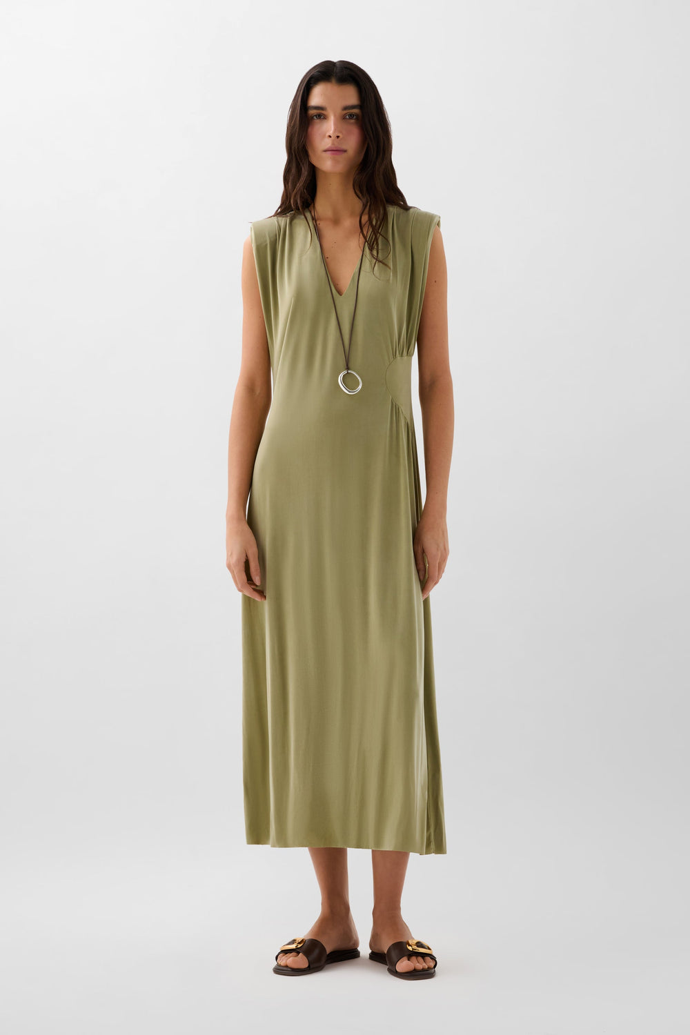Dress made of slightly stretchy cupro fabric. Regular fit, V-neck and sleeveless with ruching and slight shoulder padding. Gathered detail on waistband.