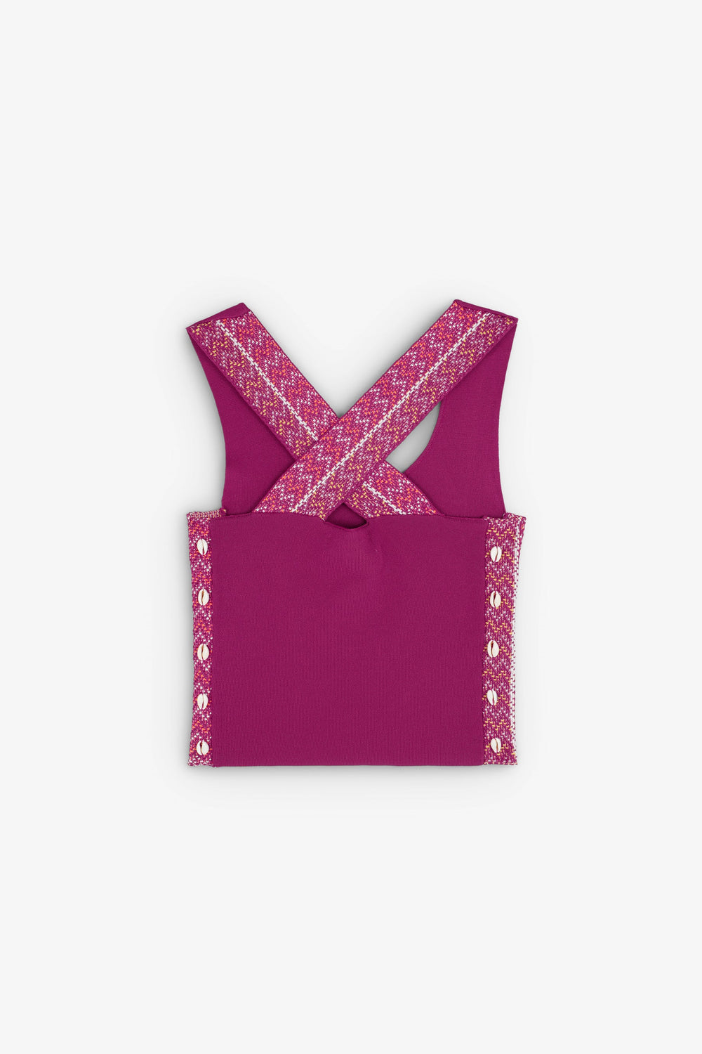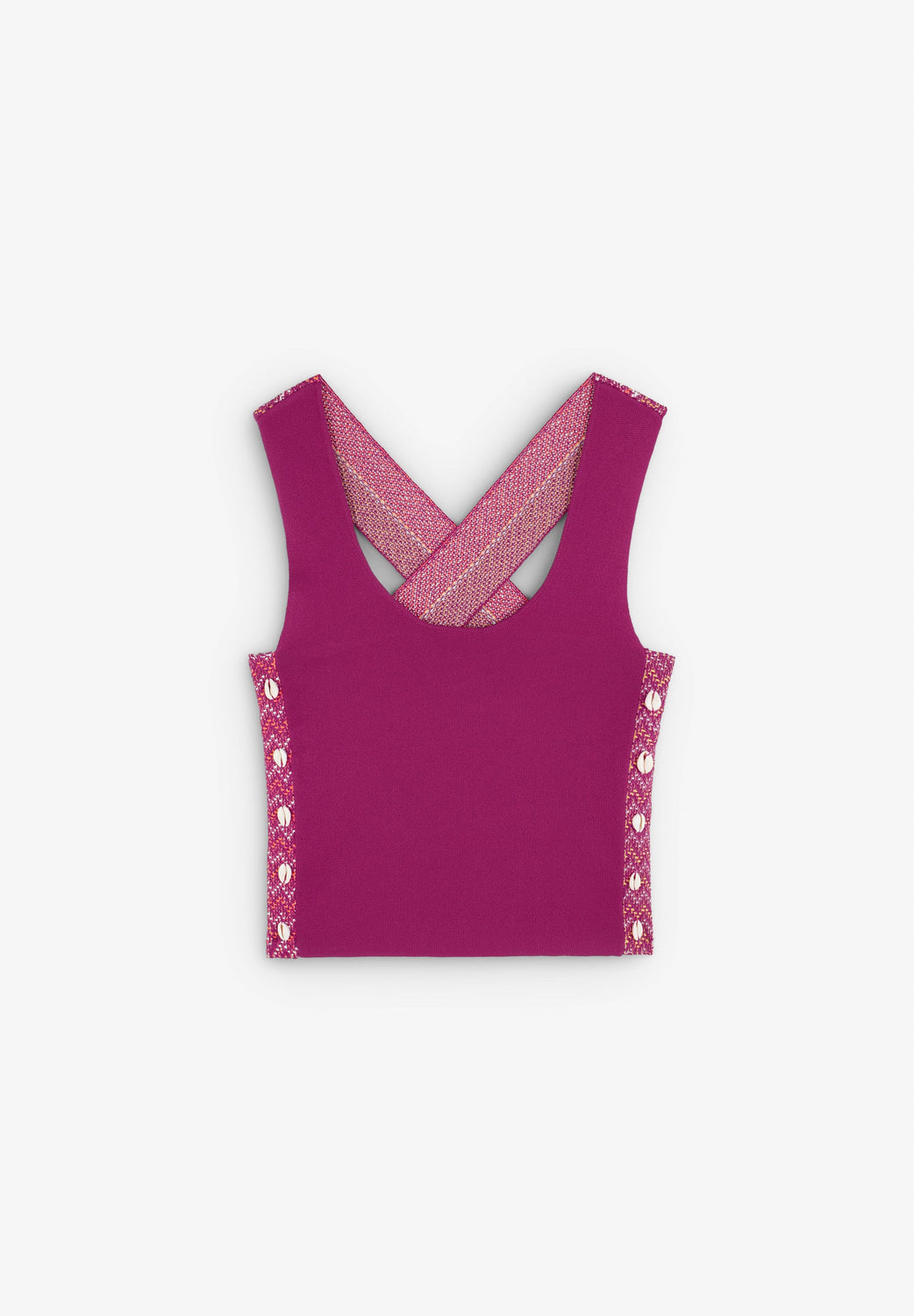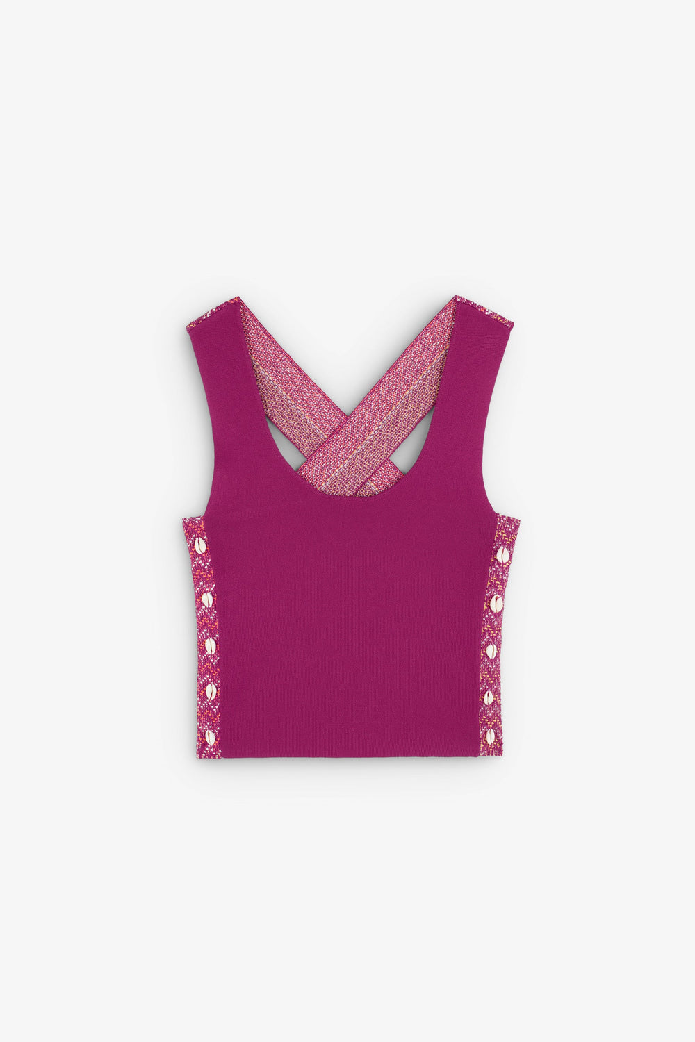 Top made of slightly stretchy knit fabric. Slim fit, round neck and sleeveless with wide printed crossed straps. Shell details on the sides.