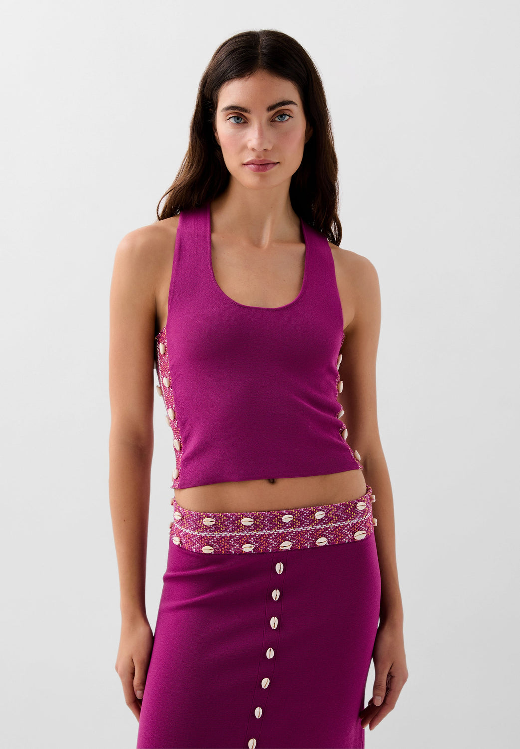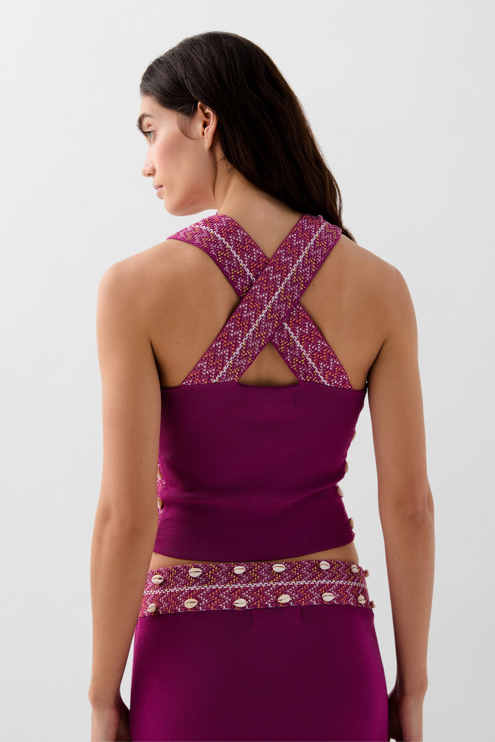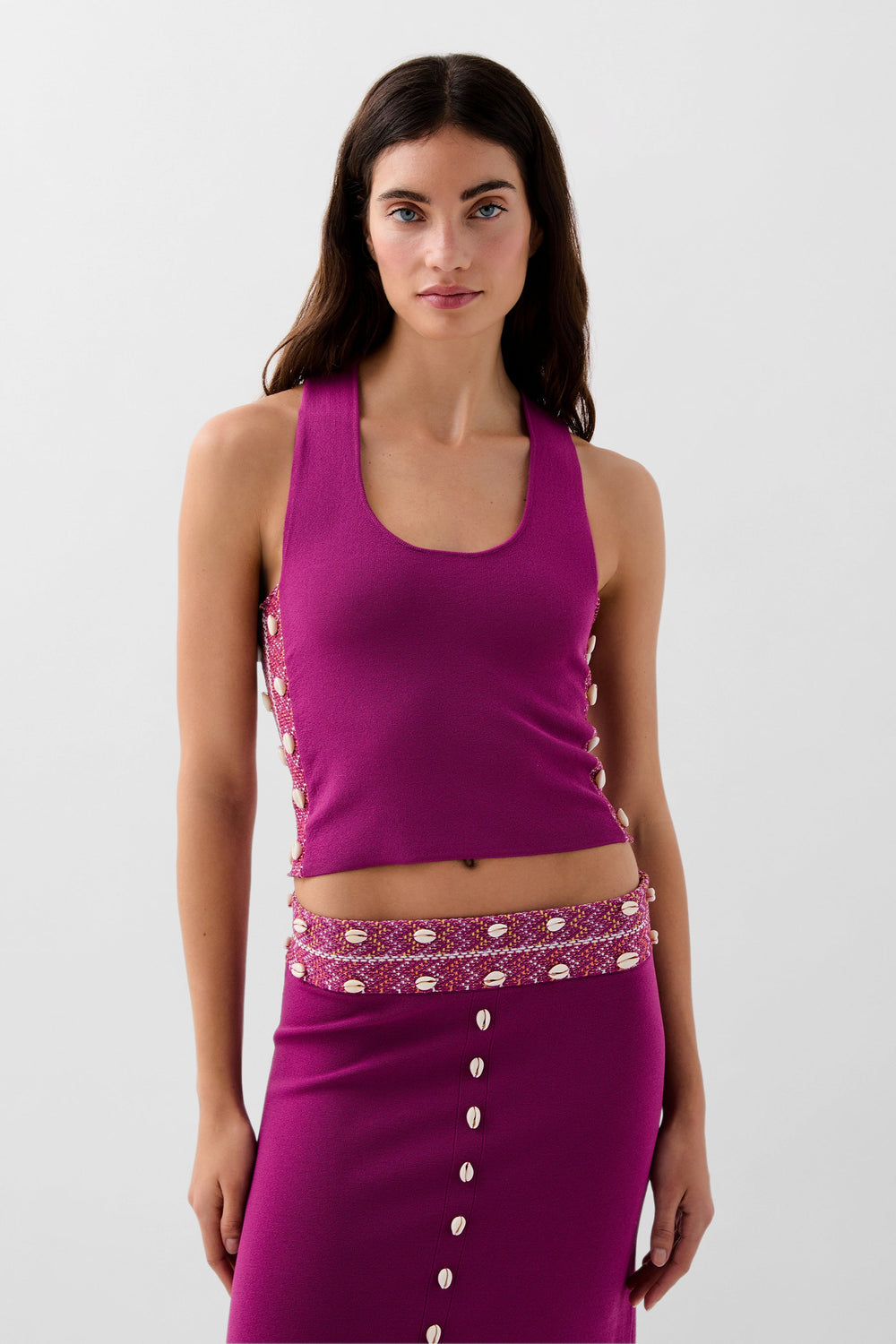 Top made of slightly stretchy knit fabric. Slim fit, round neck and sleeveless with wide printed crossed straps. Shell details on the sides.
