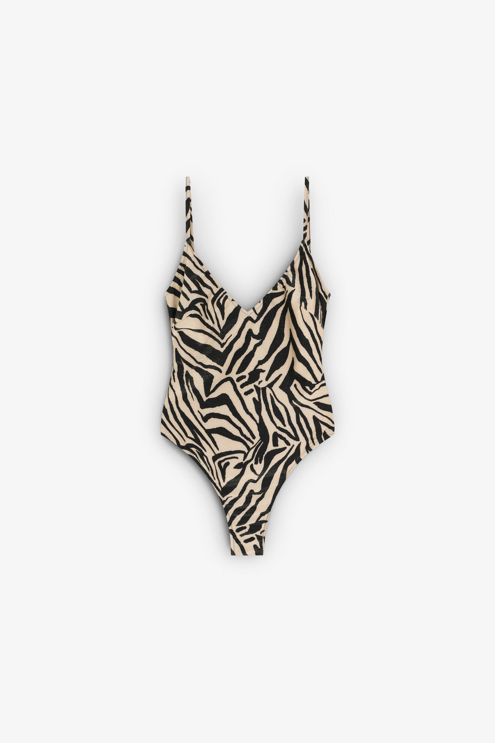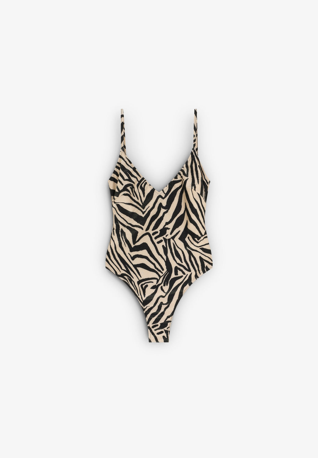 Swimsuit made of technical fabric with animal print. V-neck with straps and cut-out back.