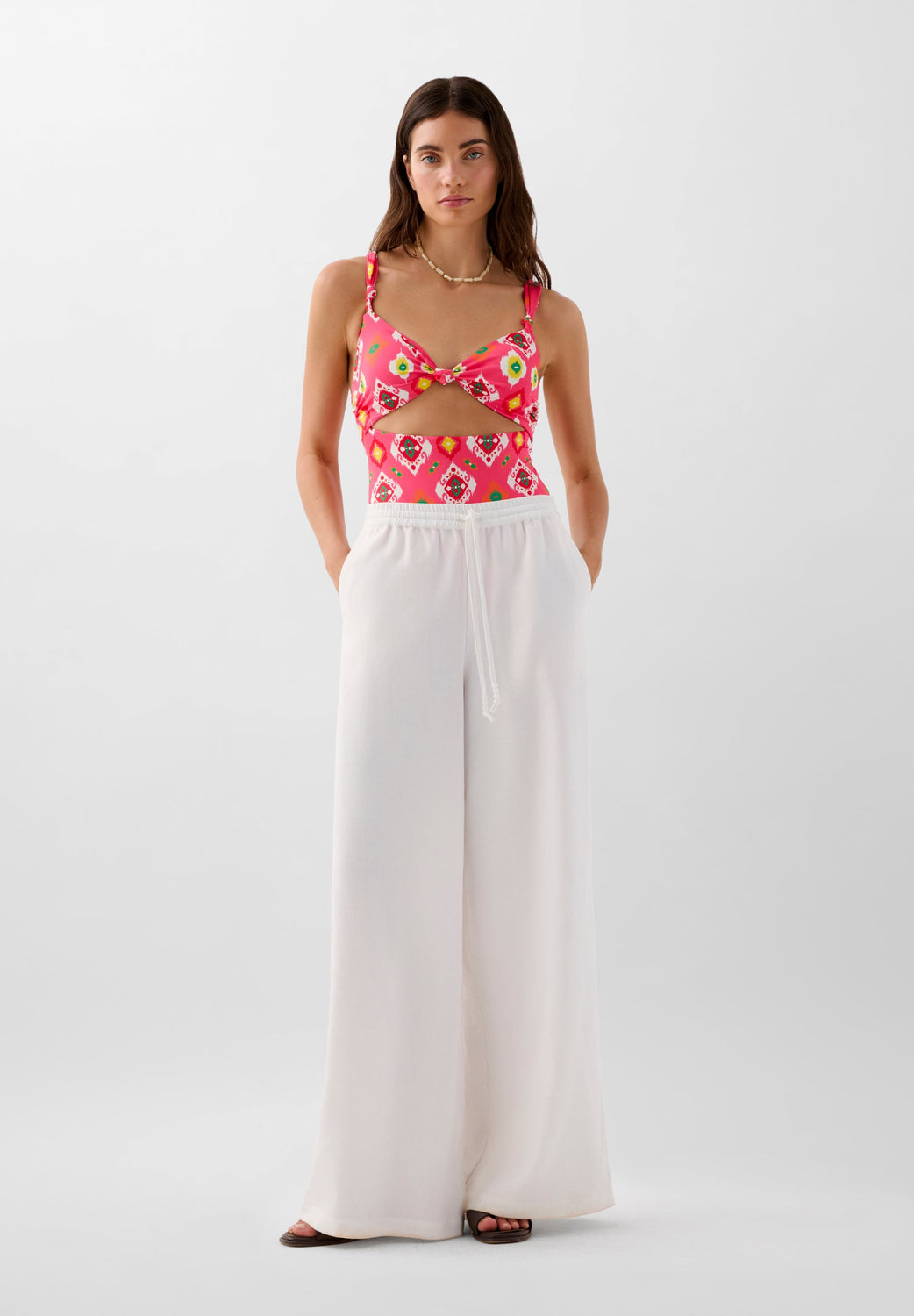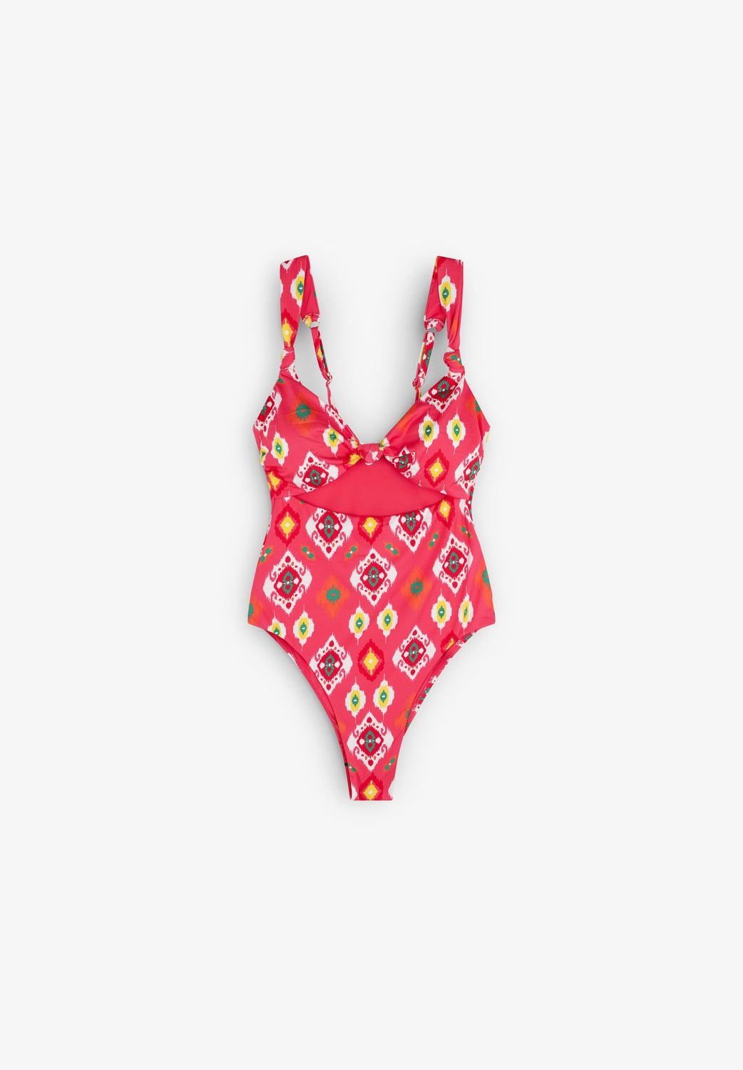 Swimsuit made of slightly stretchy technical fabric. Ethnic print with cut-out and knot at the chest. Adjustable straps.
