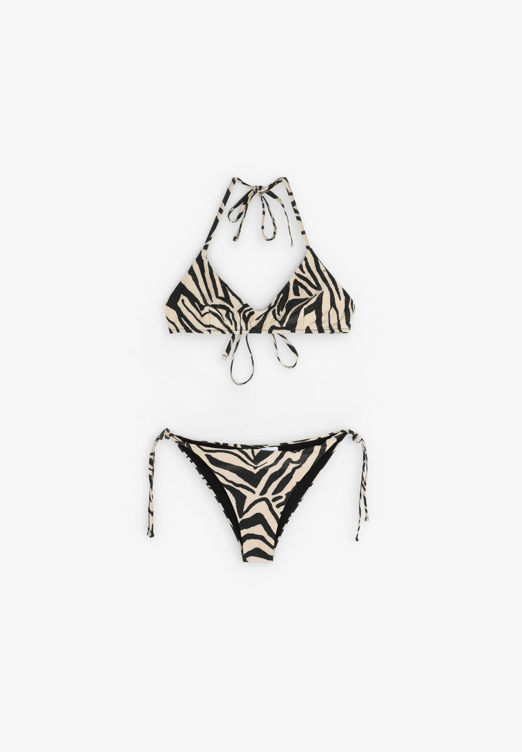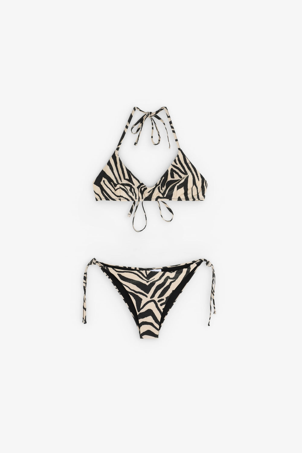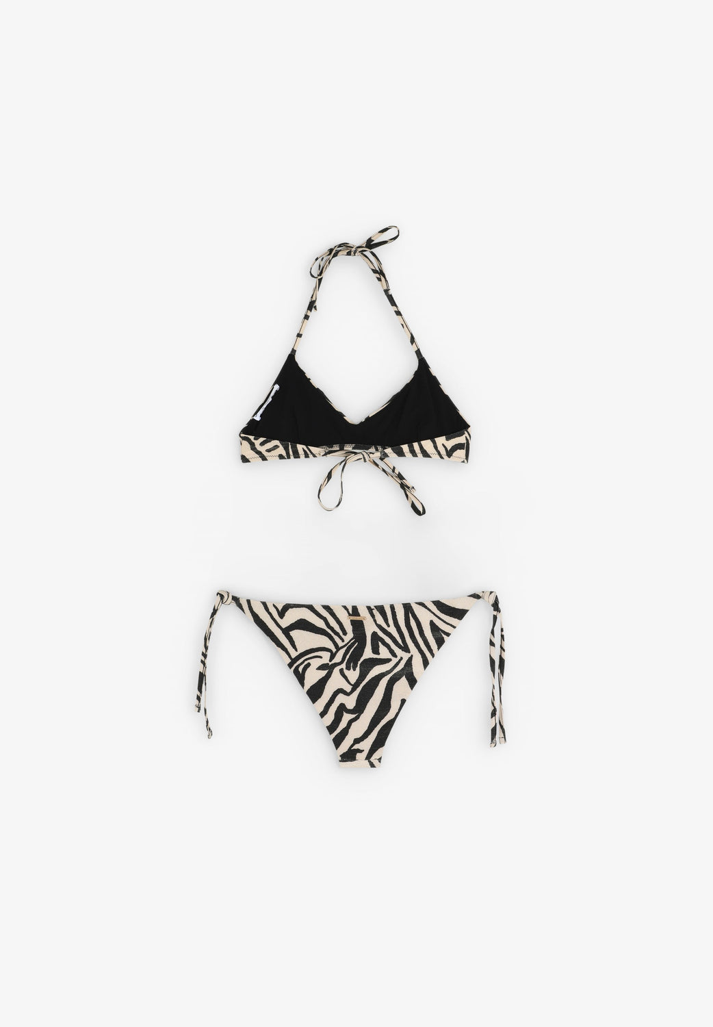Bikini made of slightly stretchy technical fabric. Triangle top with lacing at the neck and back. Classic bikini bottoms with side ties.