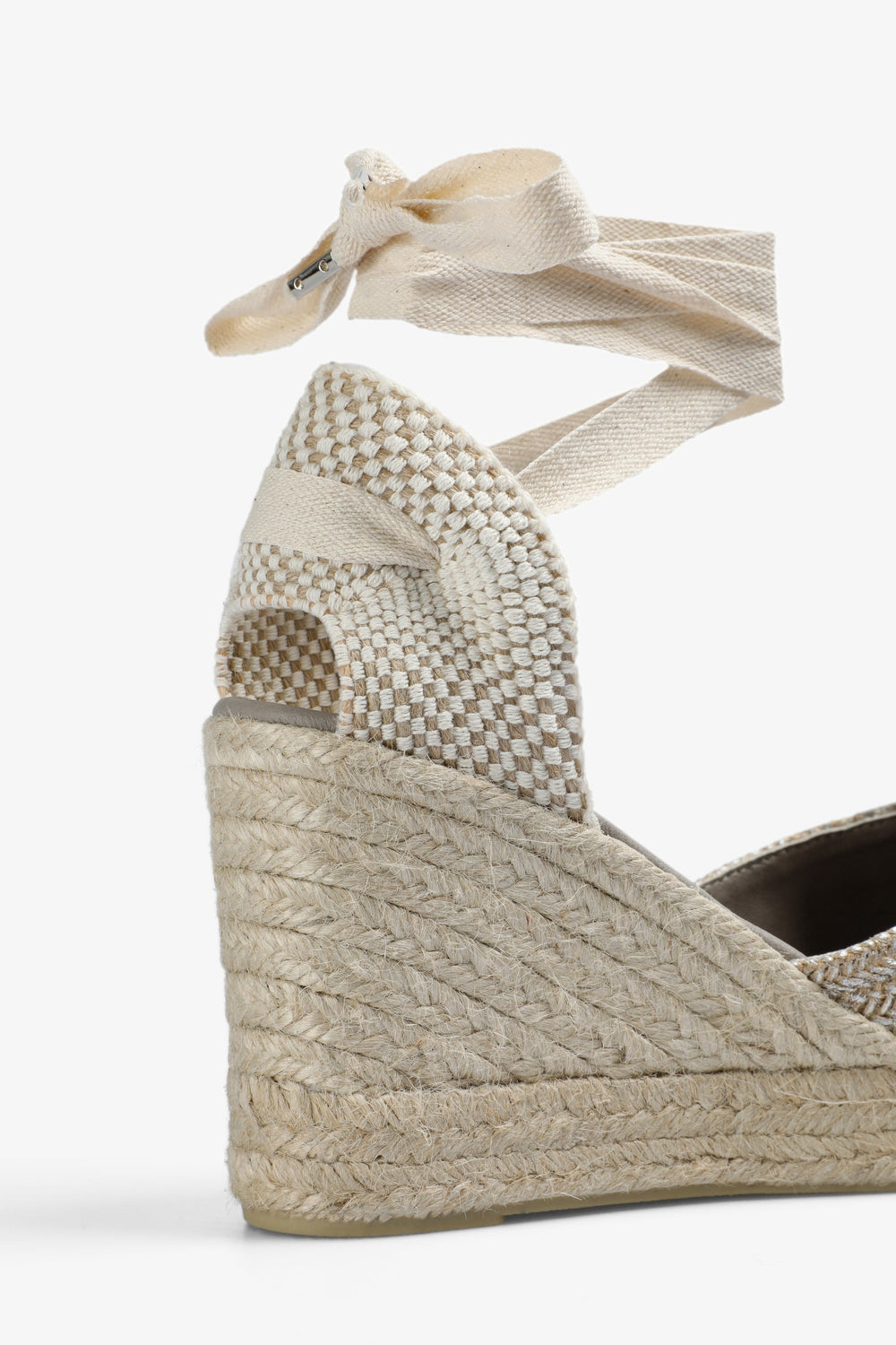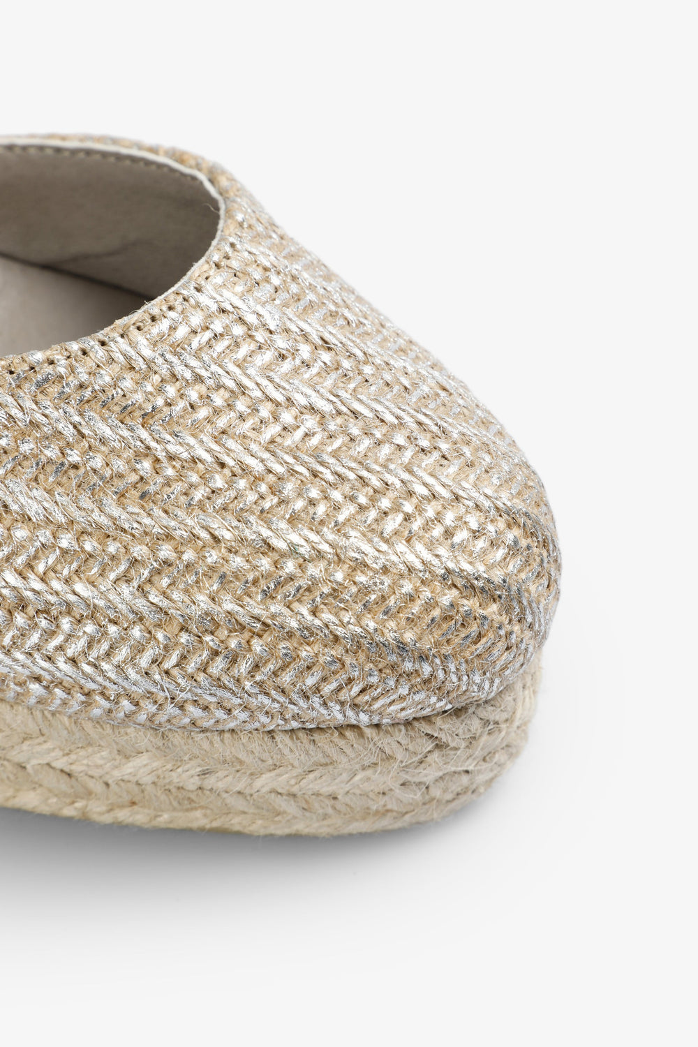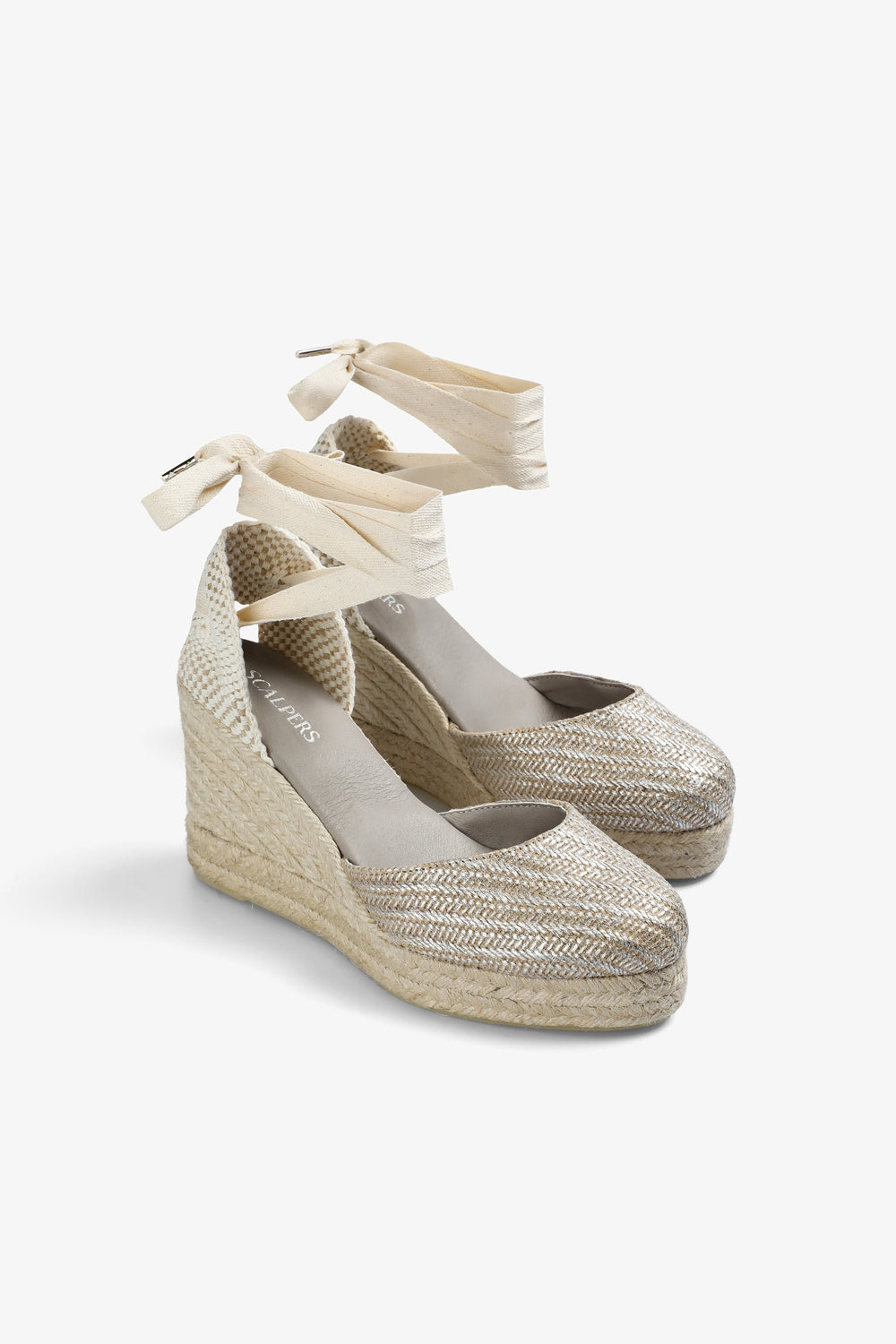 Wedge espadrilles made of 100% yute fabric with metallic thread. Rubber sole and bows at the ankle.