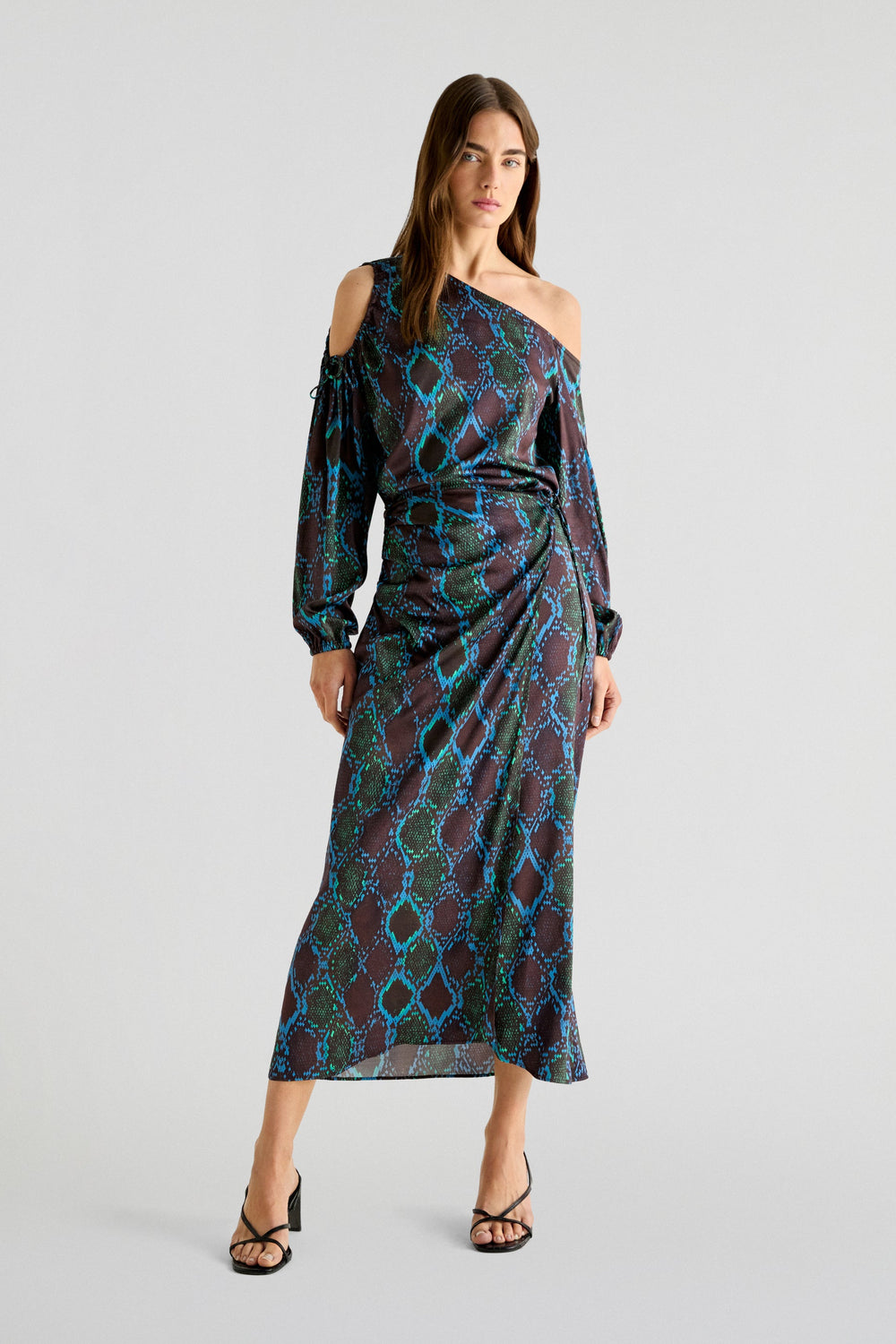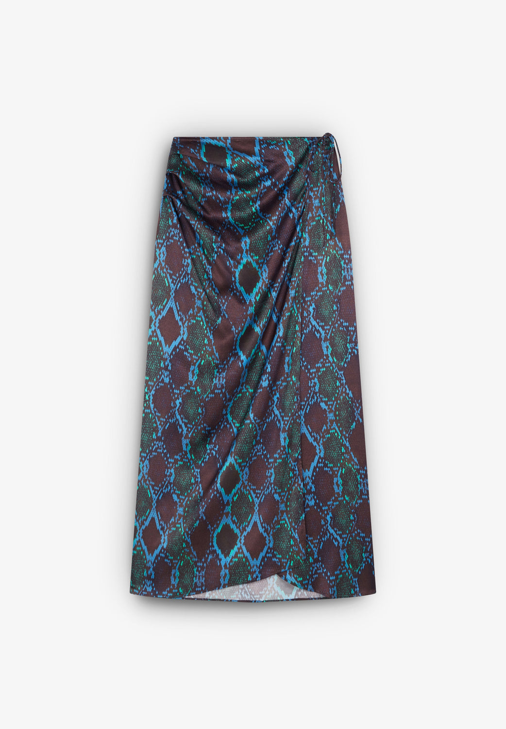 Midi sarong skirt with an animal print, made of slightly stretchy fabric. Regular fit, fastening with zip and side bow.