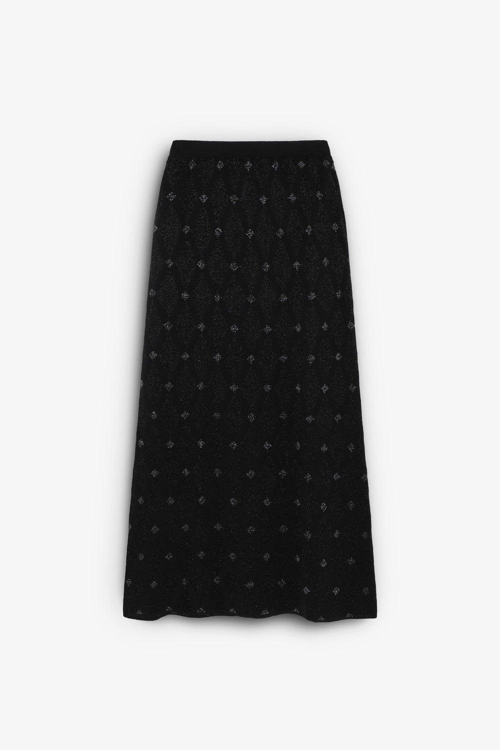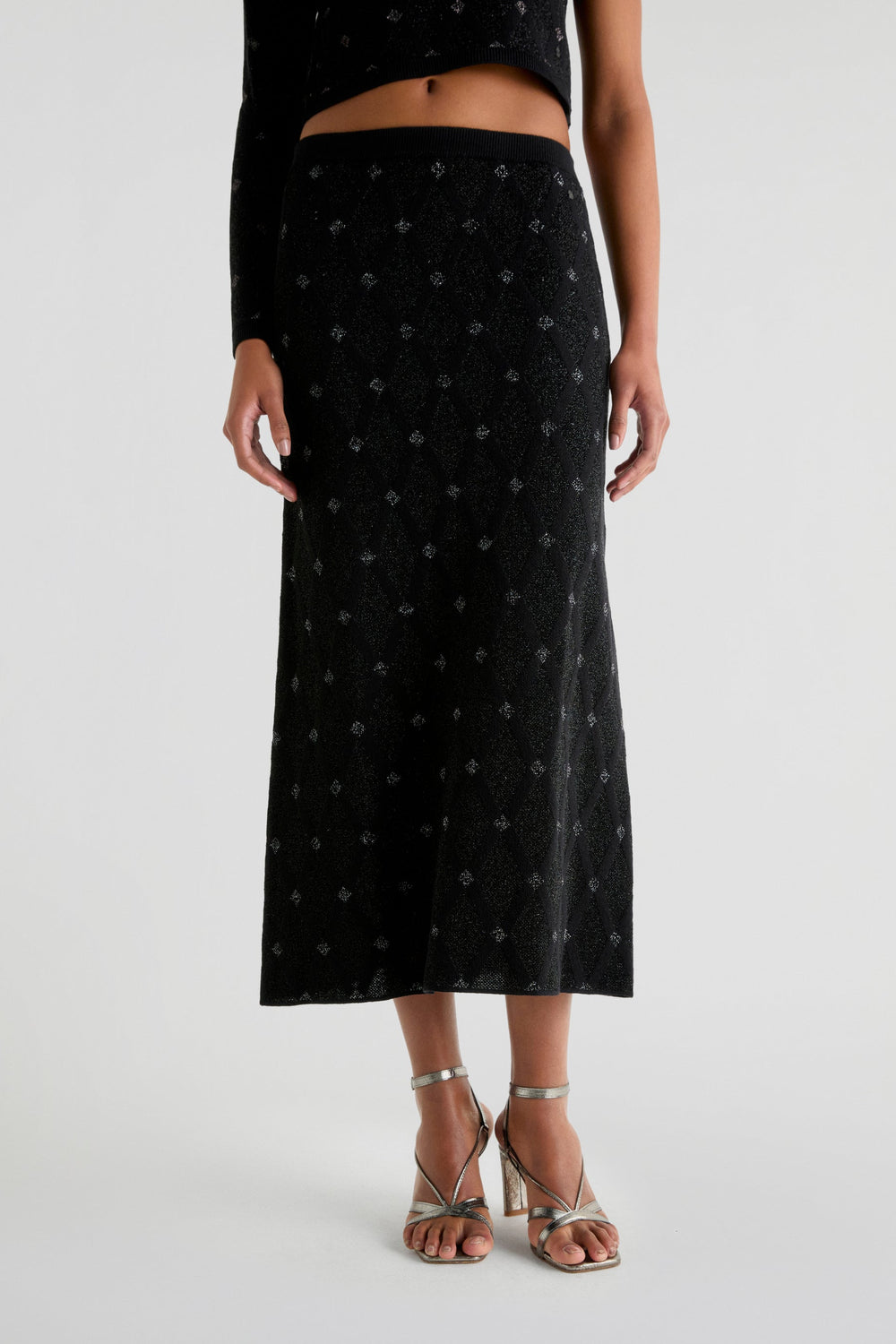 Knit midi skirt with a diamond textured weave, made of lurex. Slim fit, elasticated waistband.