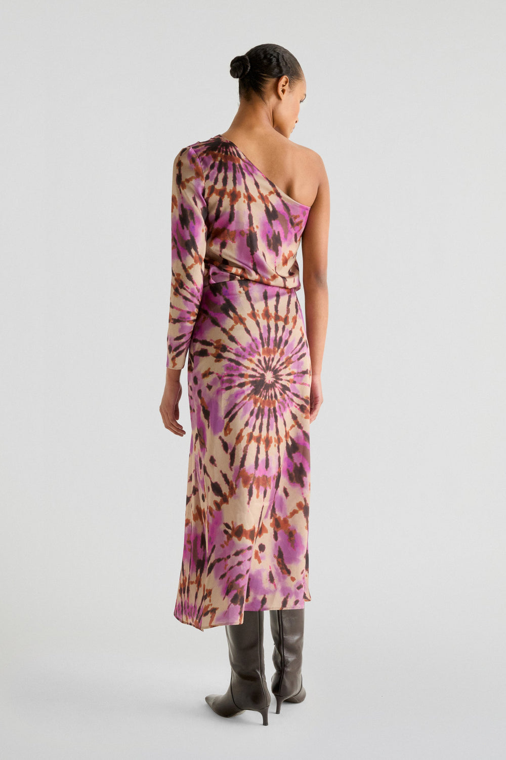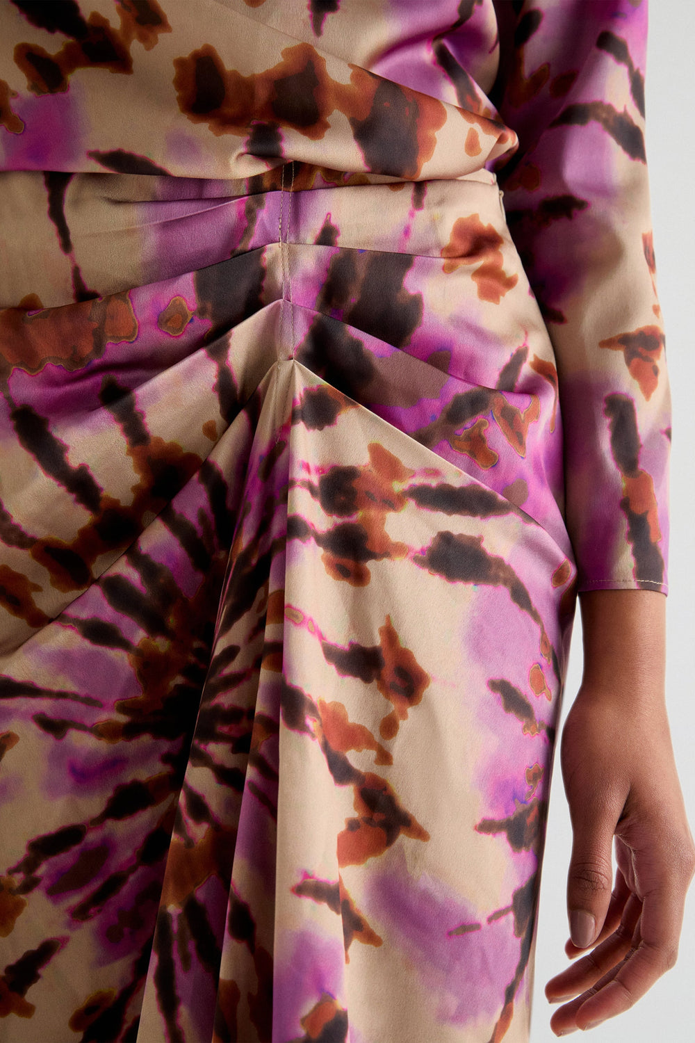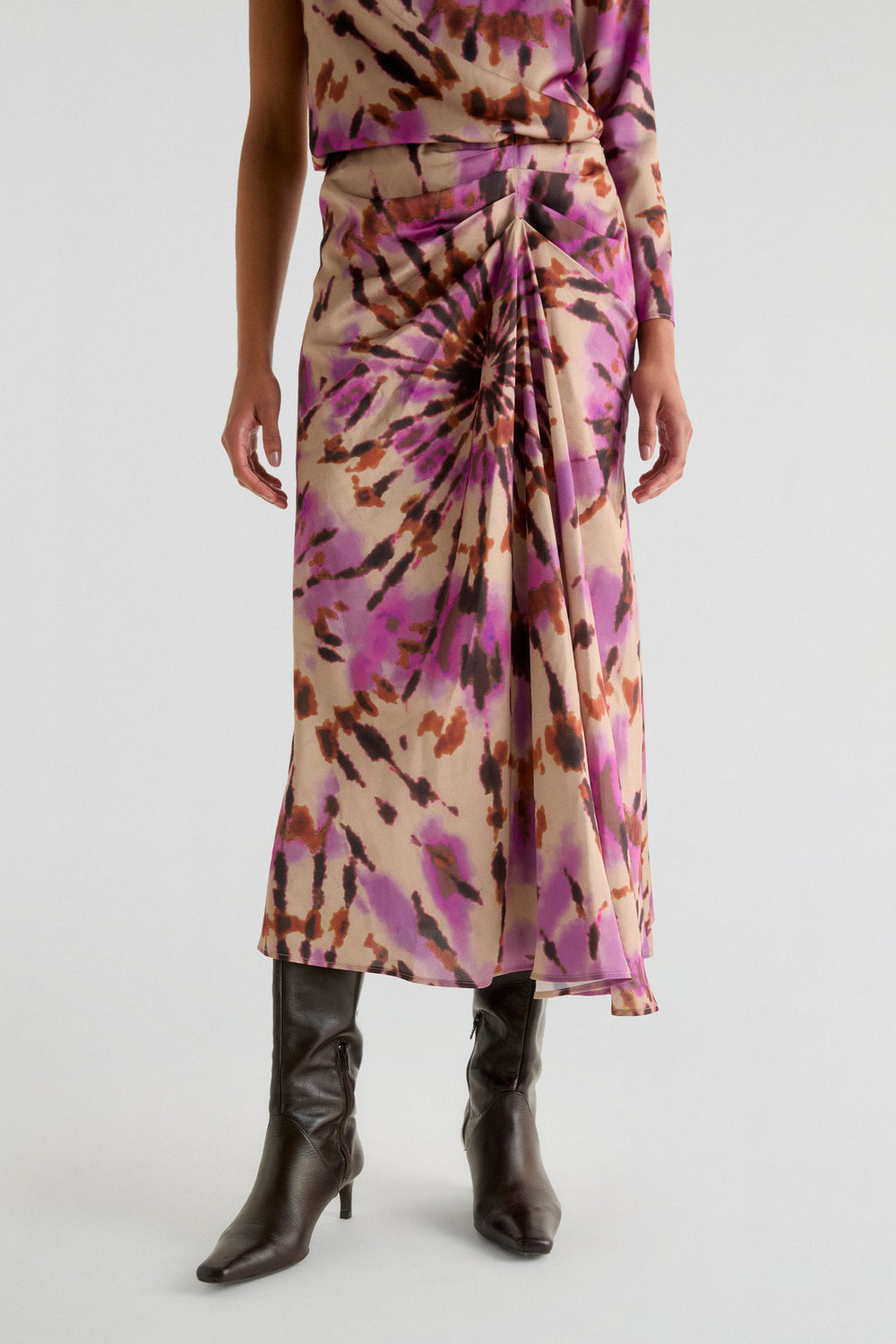 Midi skirt with a tie-dye print made of flowing fabric. Regular fit with front draping and back fastening.