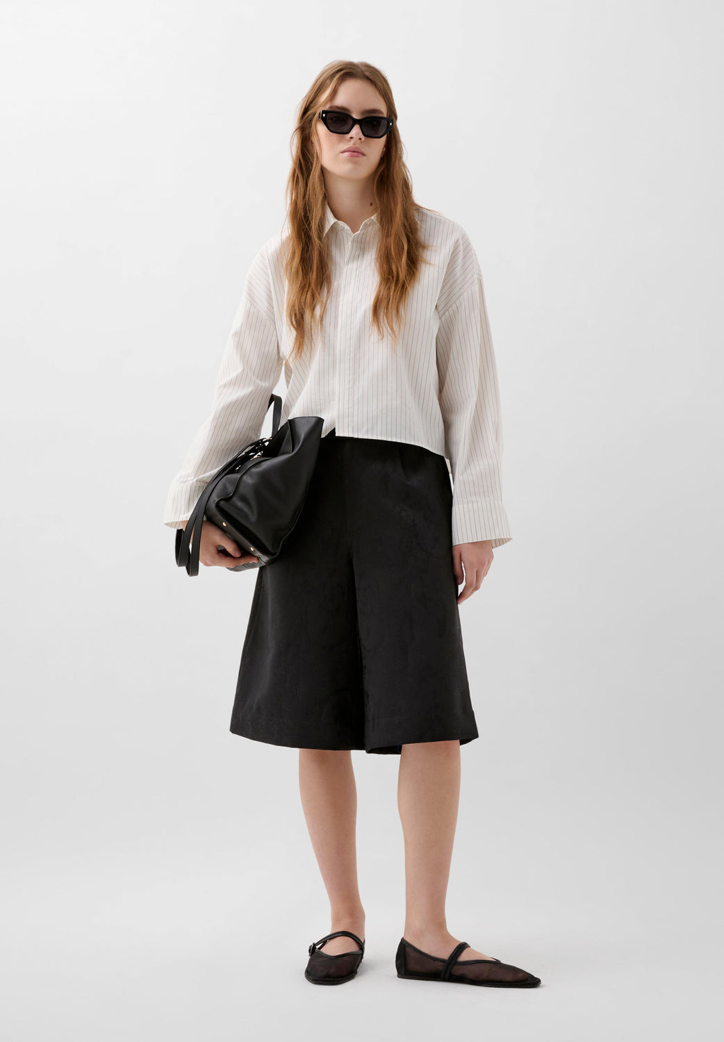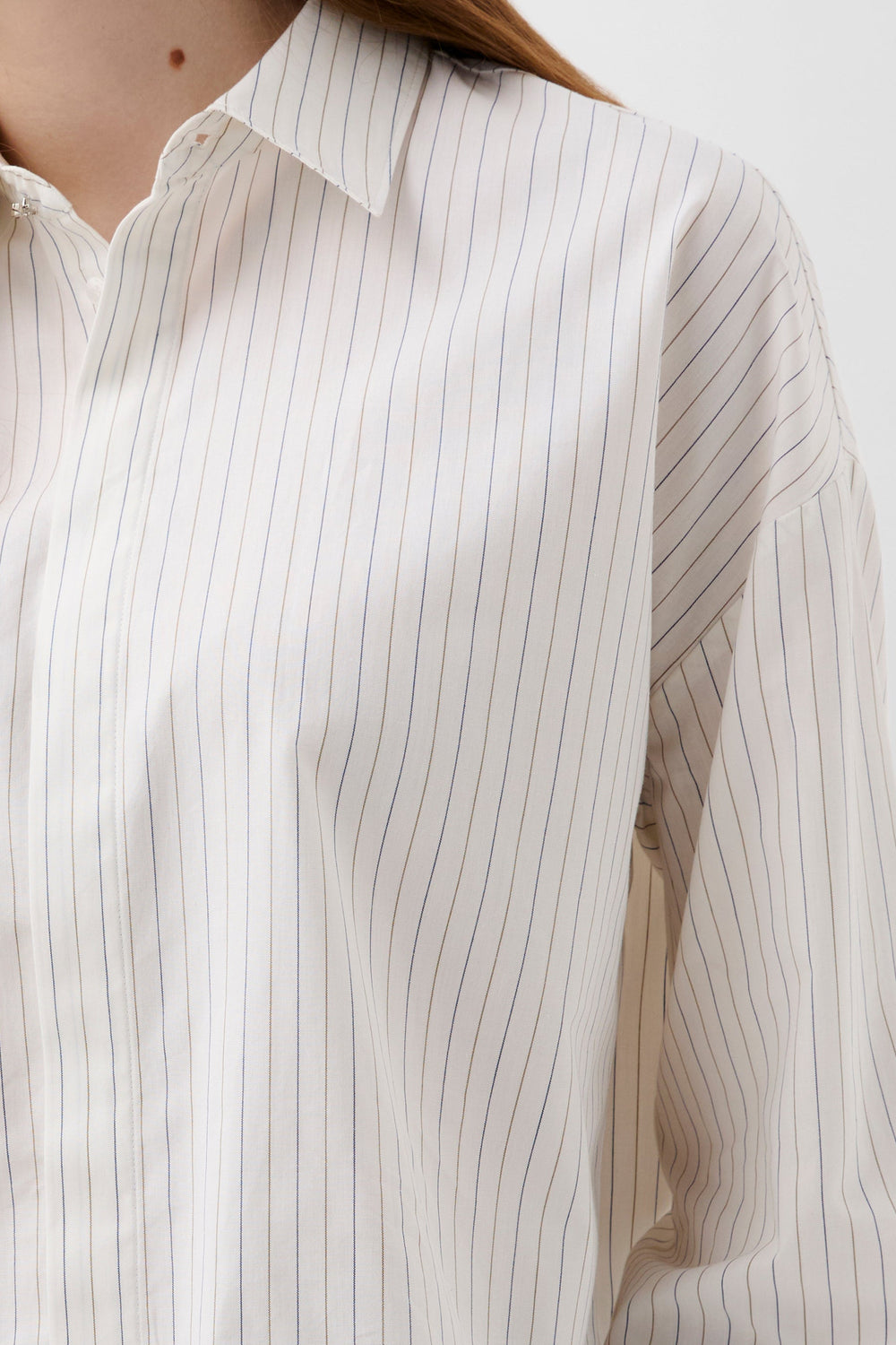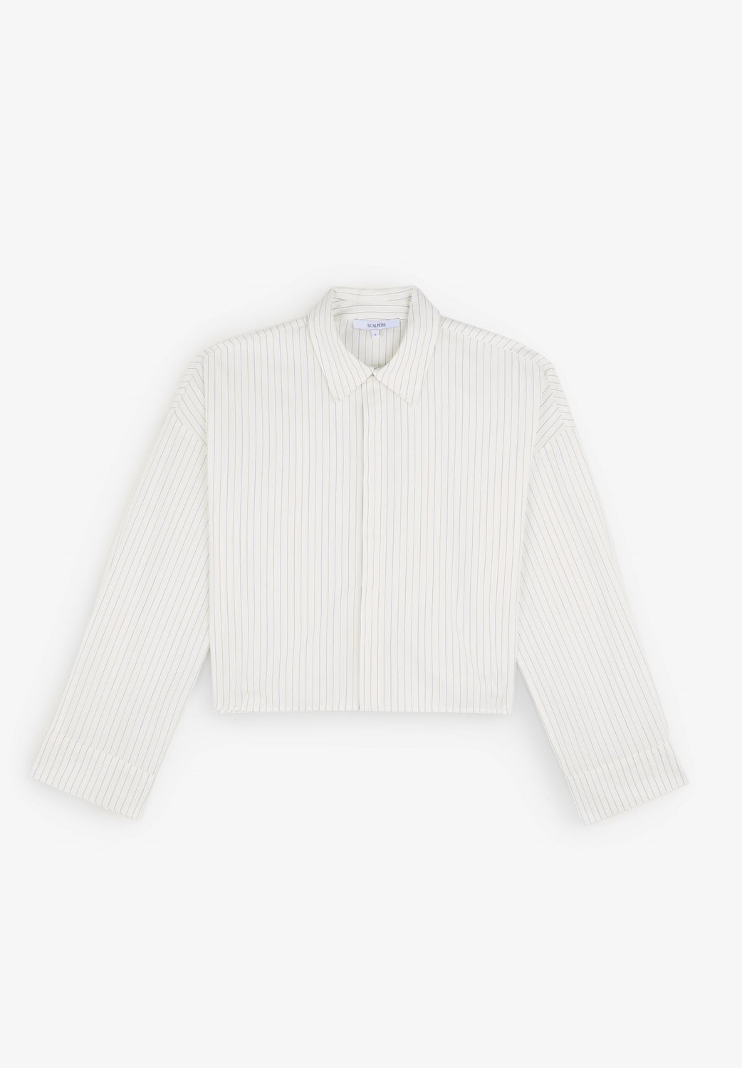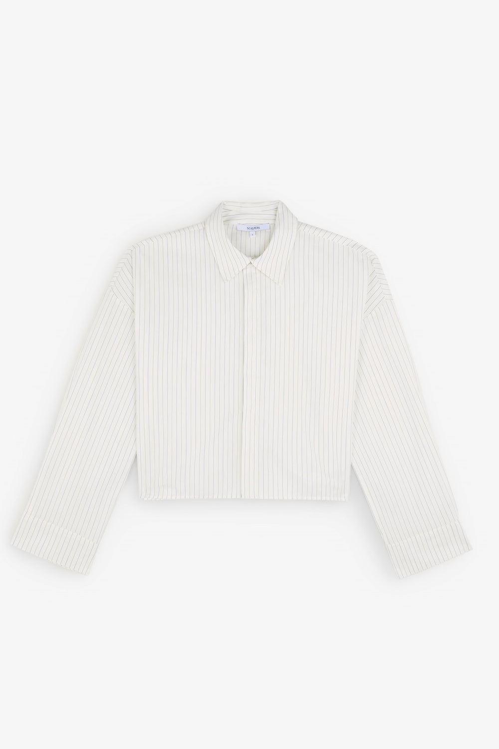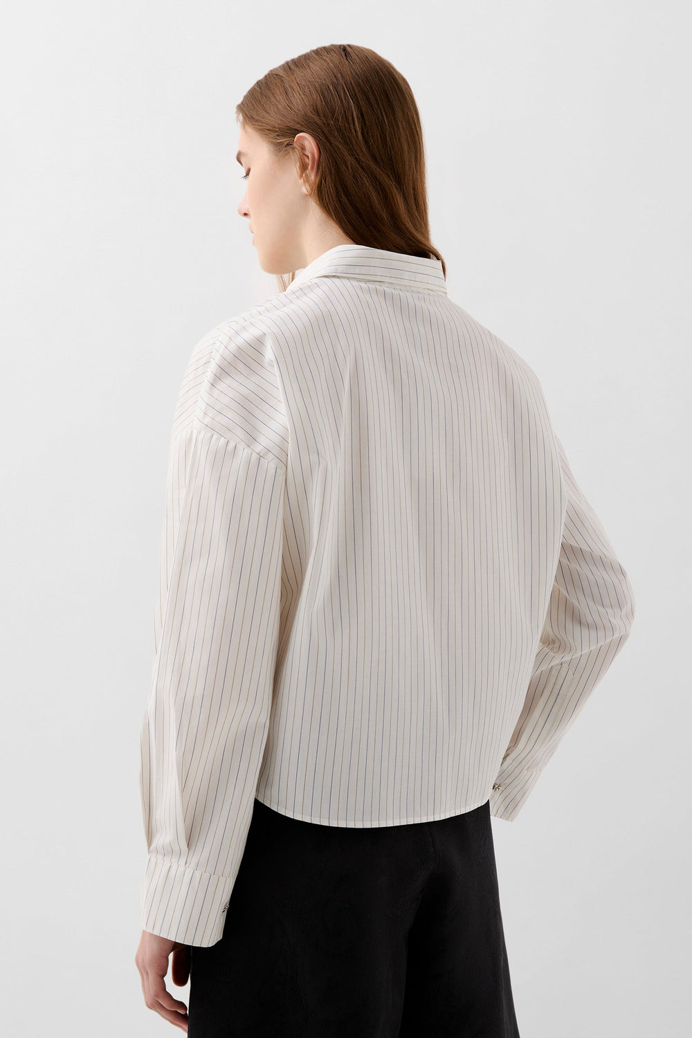 Striped shirt. Made of 100% cotton. Shirt collar, cropped and slightly oversized fit. Slightly dropped shoulder. Button fastening and buttoned cuff.