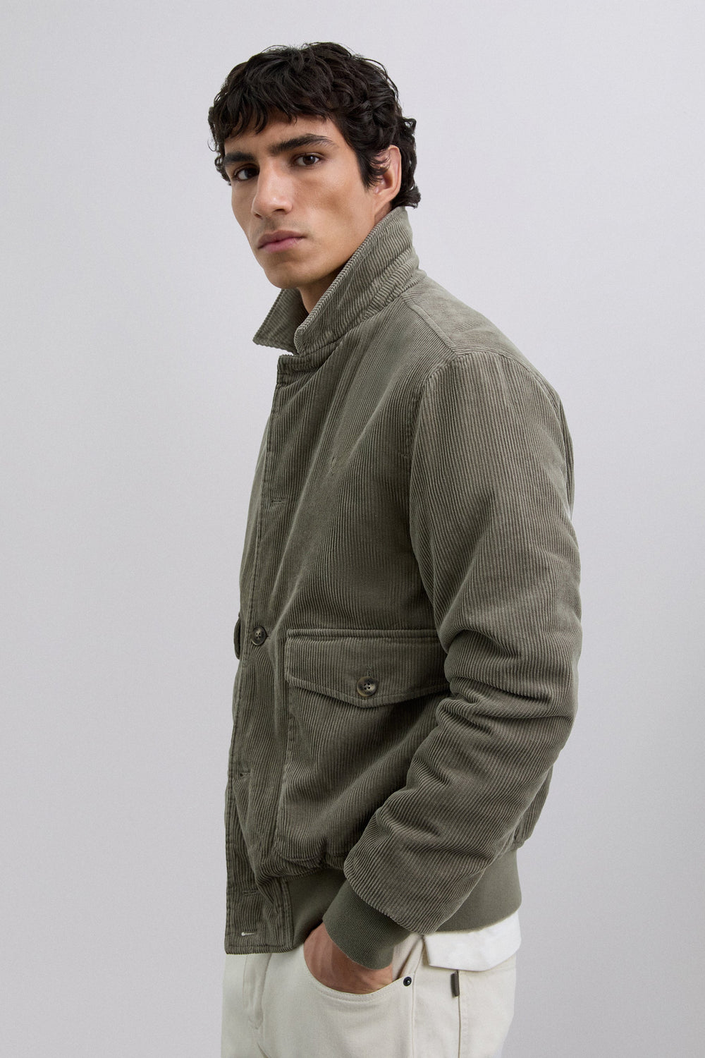 Corduroy bomber jacket made of 100% BCI cotton. Front button fastening. Double front pockets with button fastening. Ribbed cuffs and waistband. Matching embroidered logo detail on the chest.