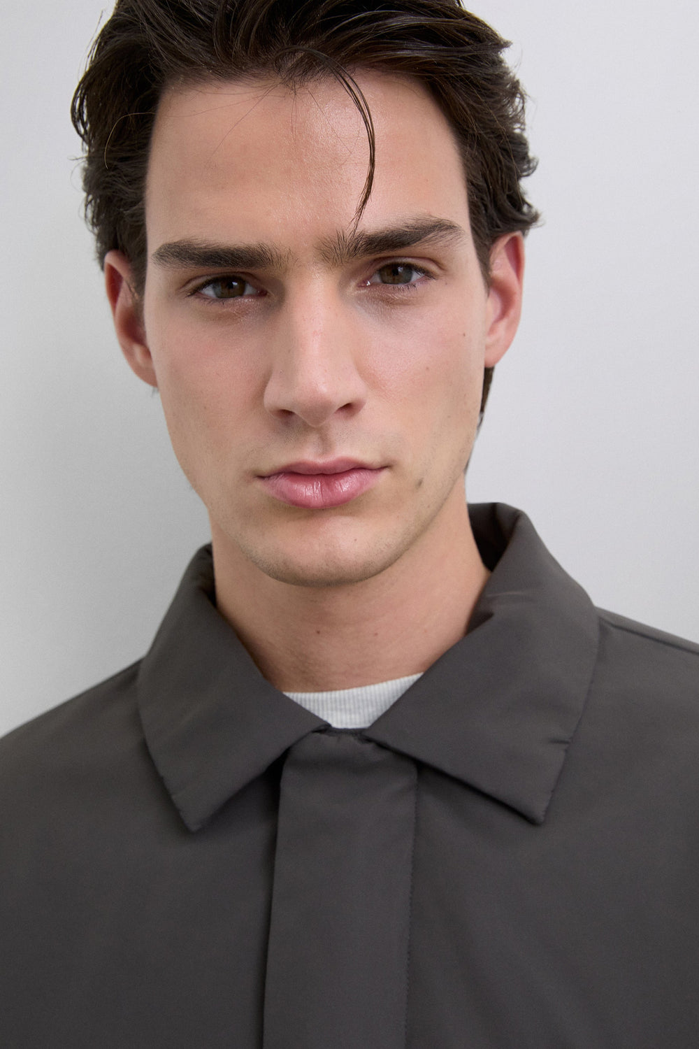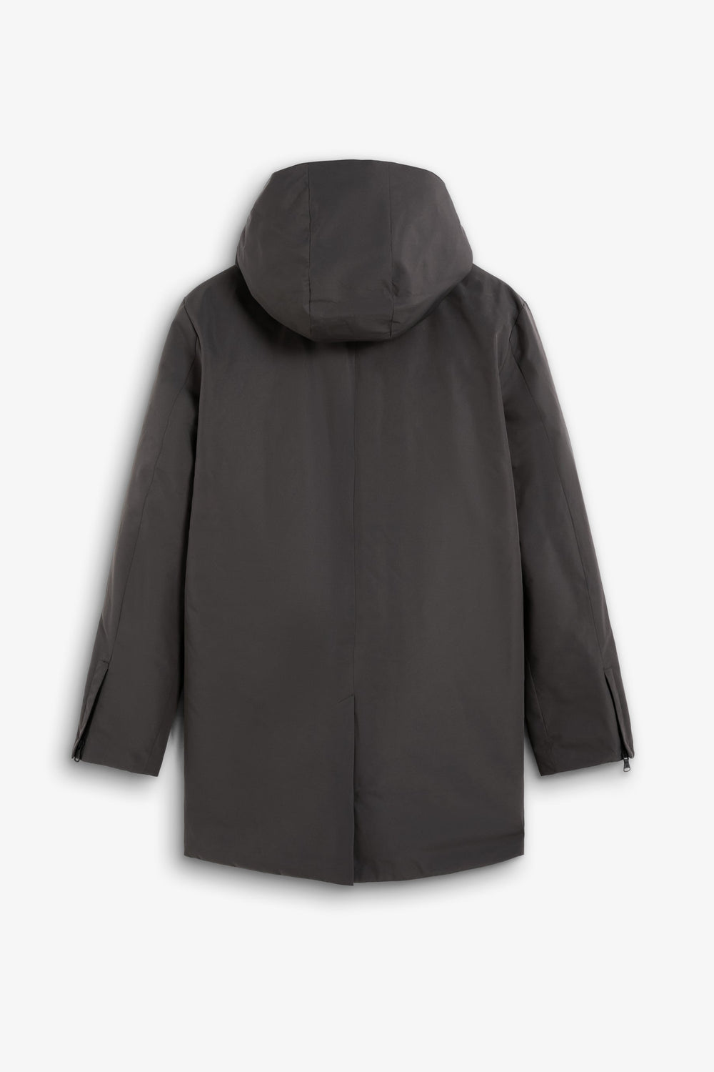 Hooded technical parka. Long sleeves. Four front pockets, two slanted top pockets and two lower flap pockets. Adjustable zip fastening on the cuffs.