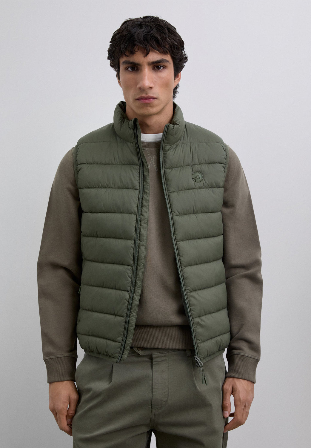 Puffer vest. Water repellent. Inner lining made of technical fabric. Concealed side pockets with fleece lining. Engraved double slider zip fastening. Rubberised patch with matching logo on chest.