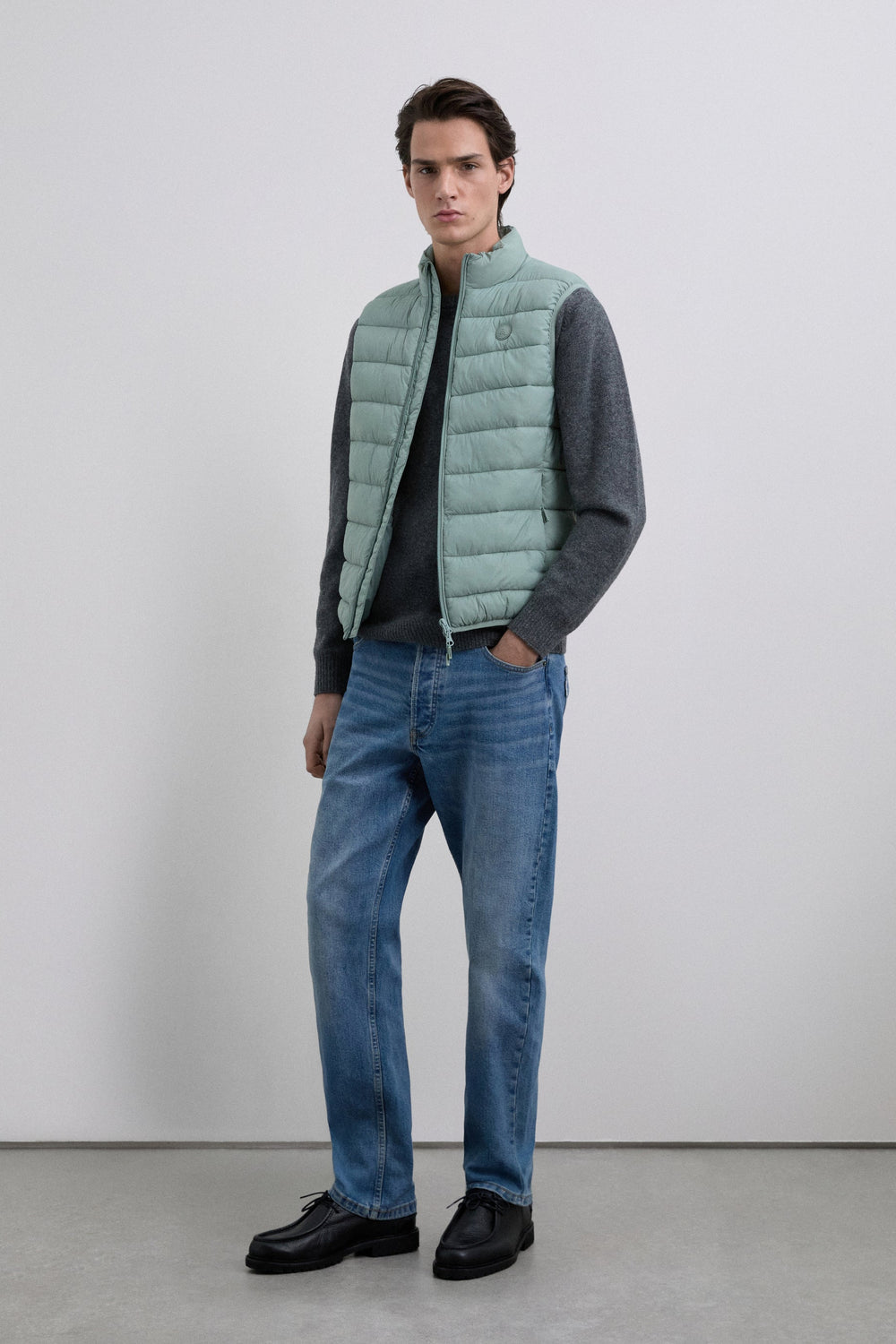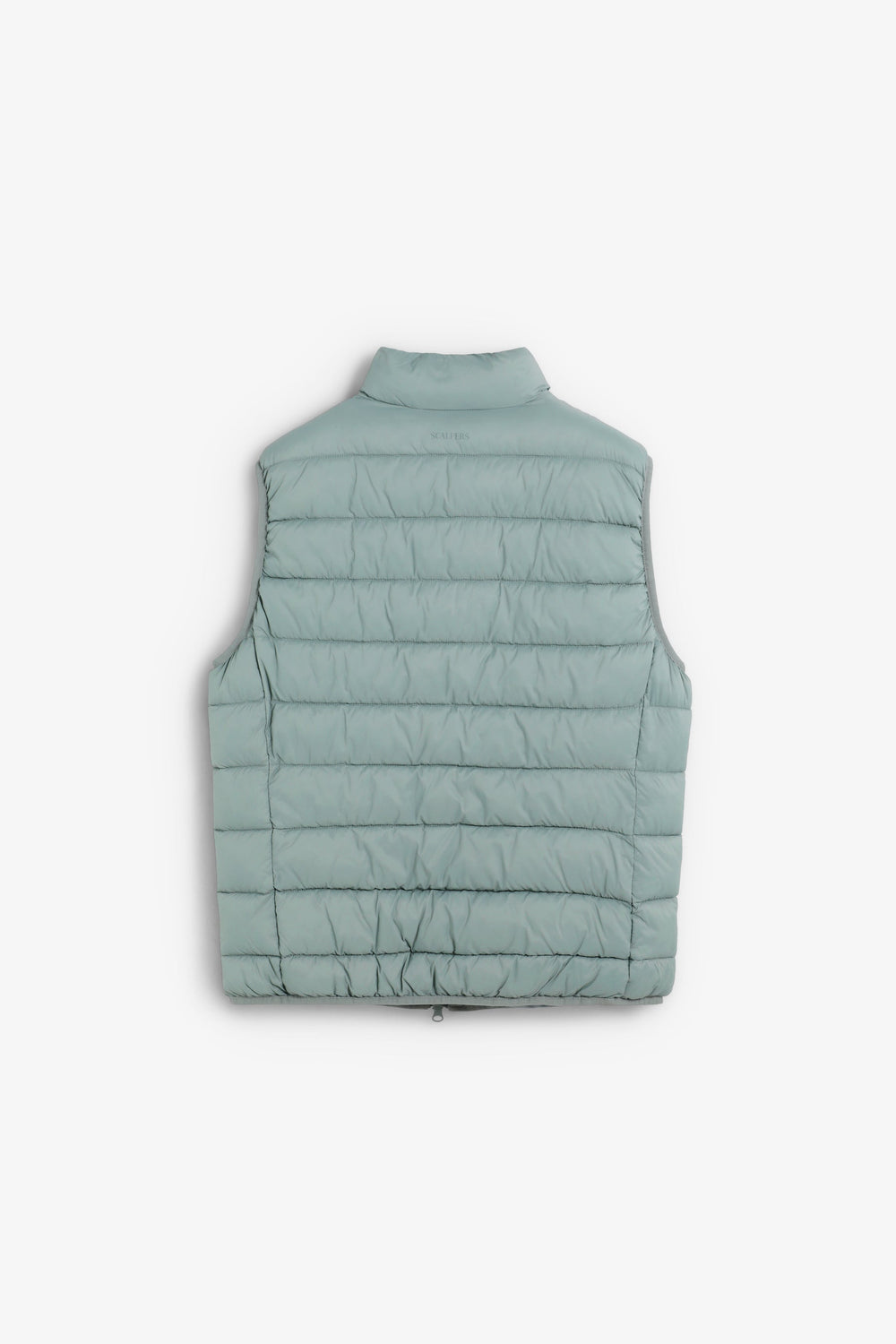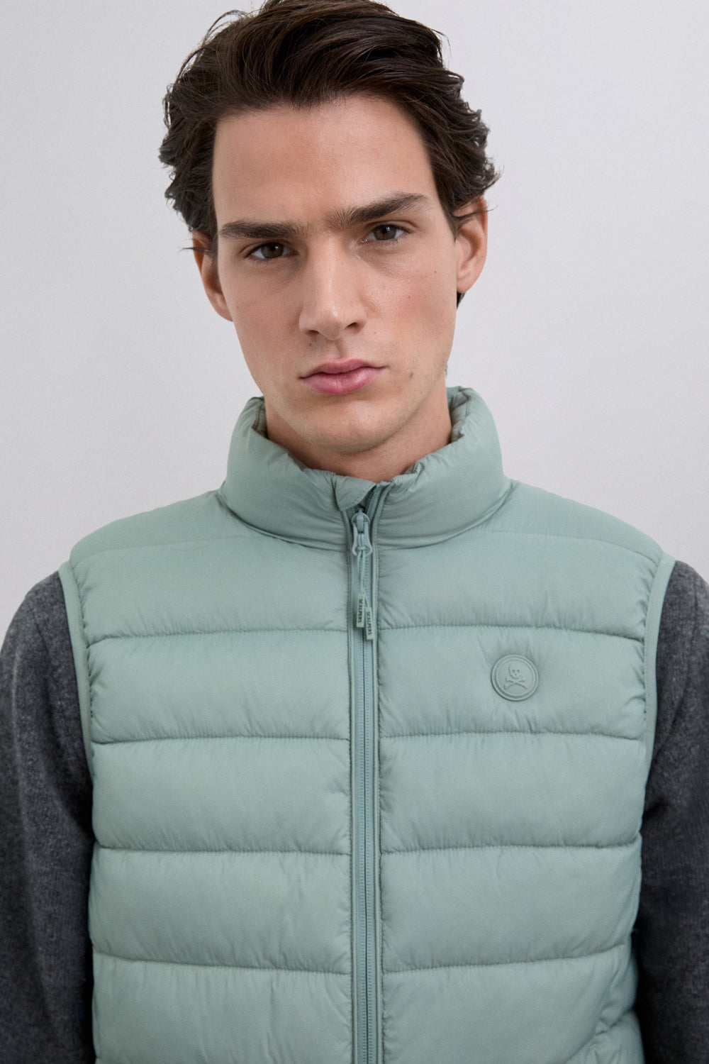 Puffer vest. Water repellent. Inner lining made of technical fabric. Concealed side pockets with fleece lining. Engraved double slider zip fastening. Rubberised patch with matching logo on chest.