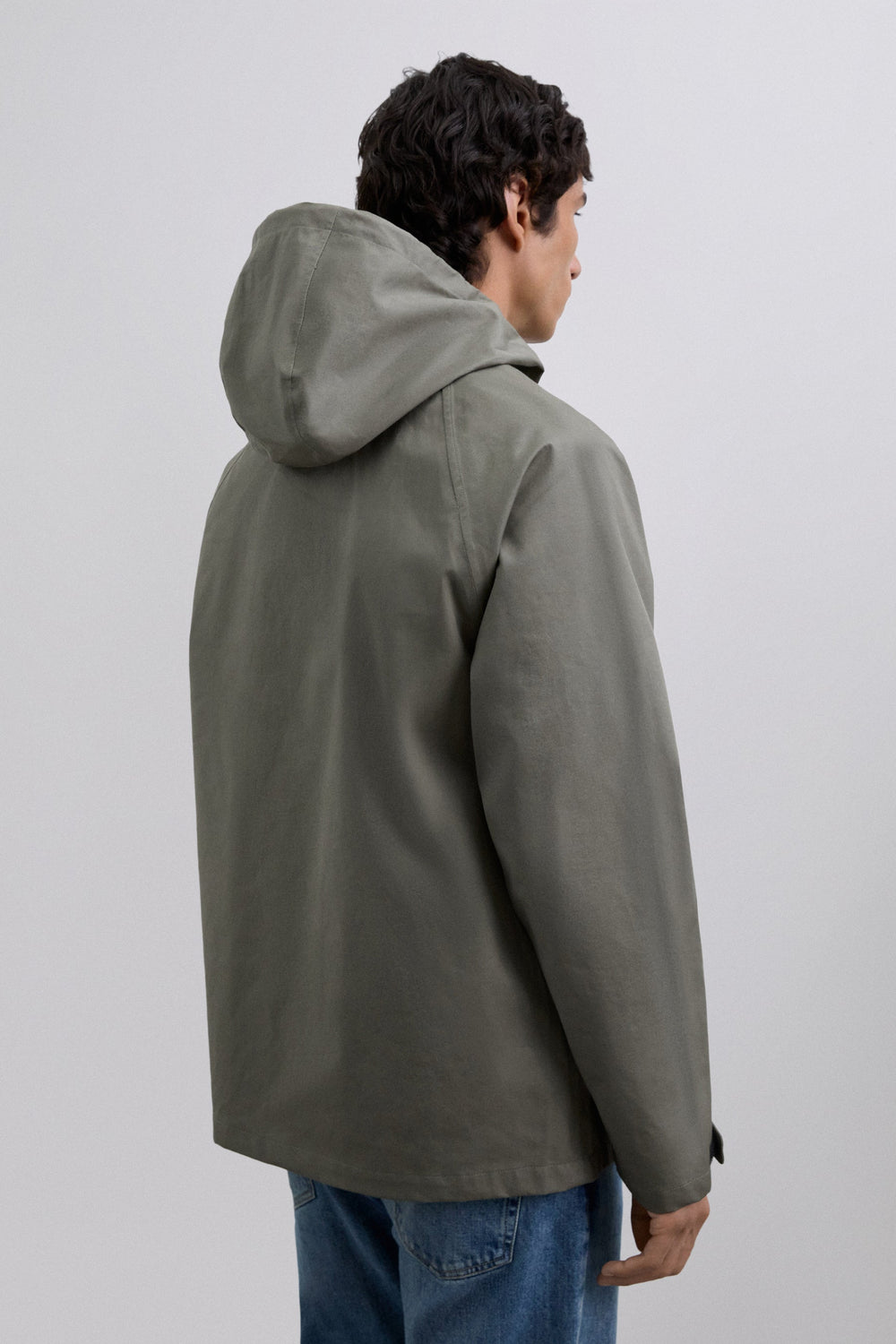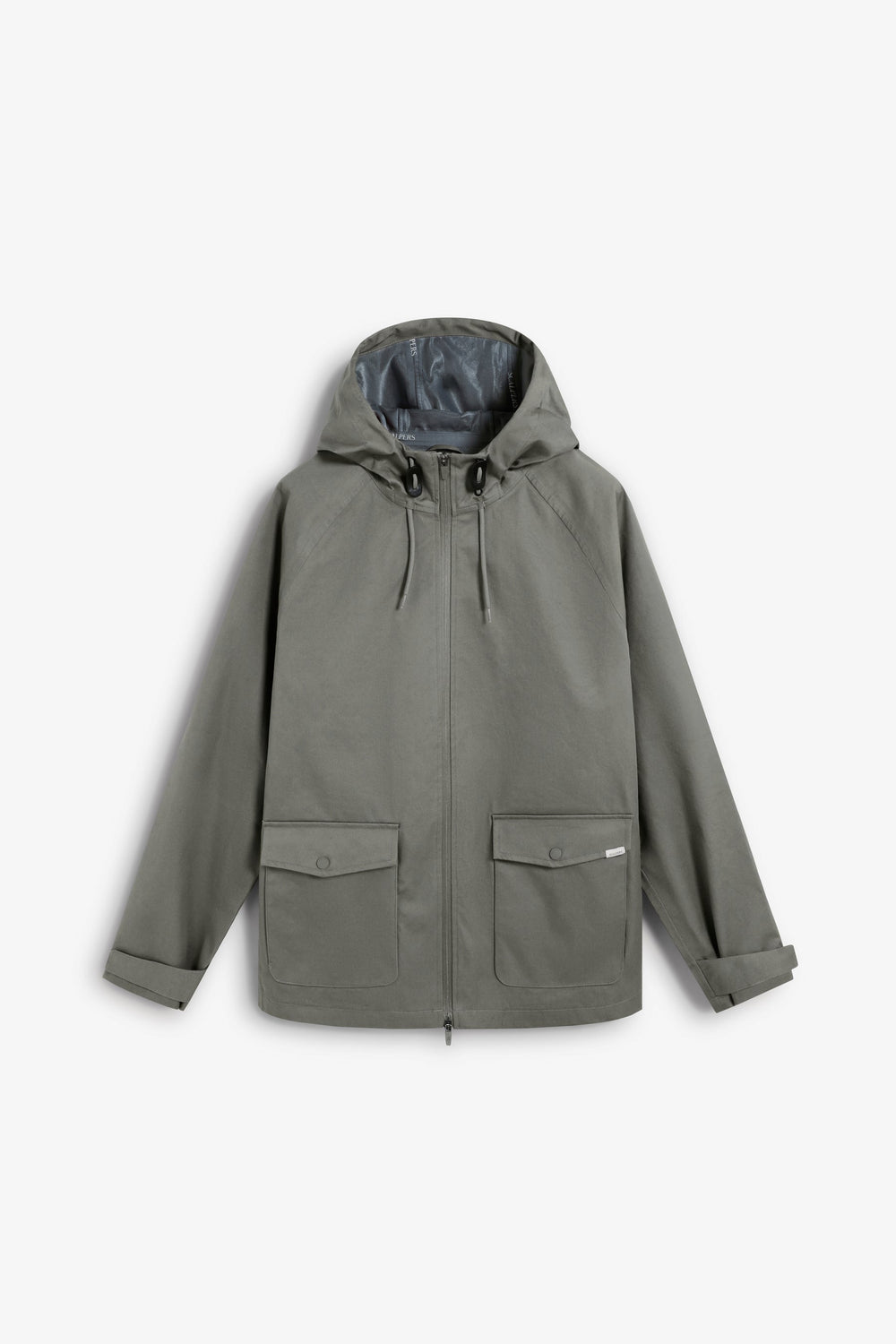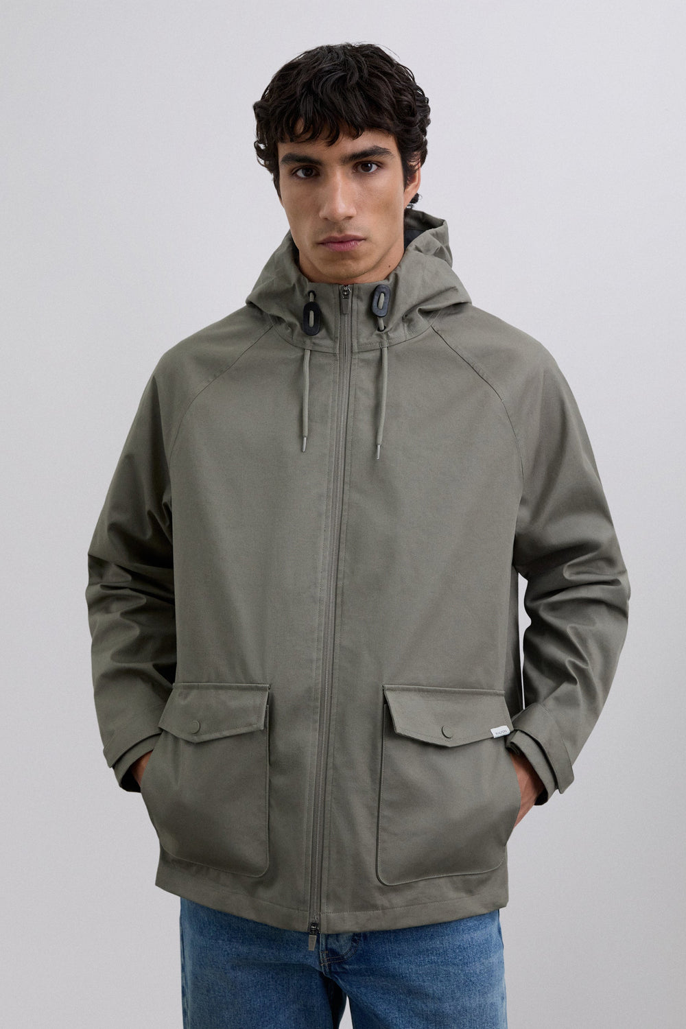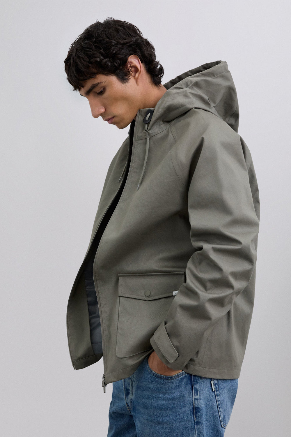 Waterproof technical jacket made of 100% cotton. Adjustable drawstring hood with leather detail. Raglan sleeves. Velcro cuff adjusters. Front fastening with double slider thermo-sealed zip and customised snaps. Two front-flap double-entry pockets (top and side access) with snap fasteners. Logo label detail on the front pocket.