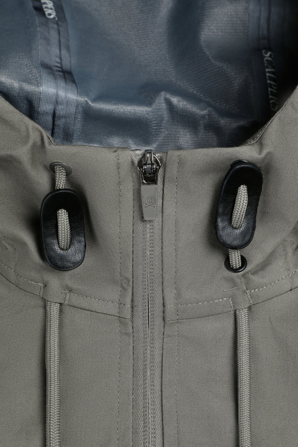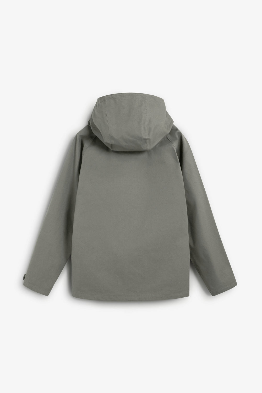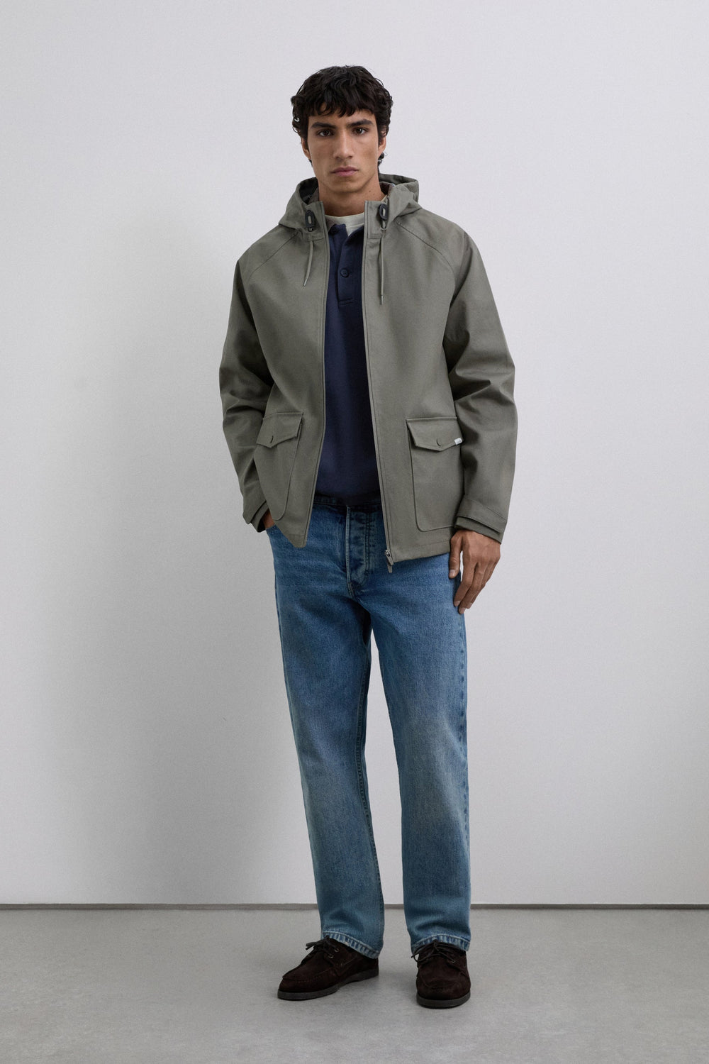 Waterproof technical jacket made of 100% cotton. Adjustable drawstring hood with leather detail. Raglan sleeves. Velcro cuff adjusters. Front fastening with double slider thermo-sealed zip and customised snaps. Two front-flap double-entry pockets (top and side access) with snap fasteners. Logo label detail on the front pocket.