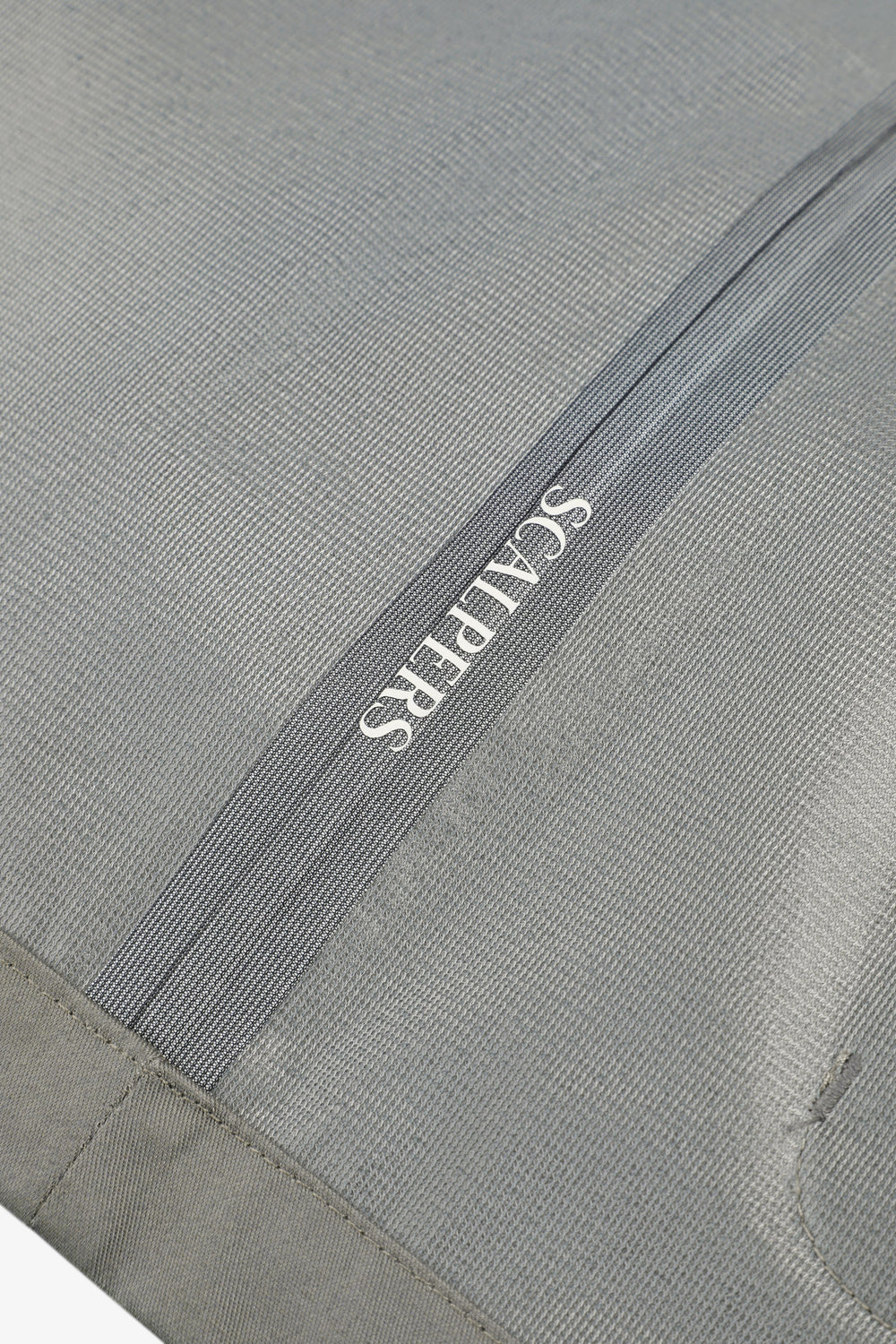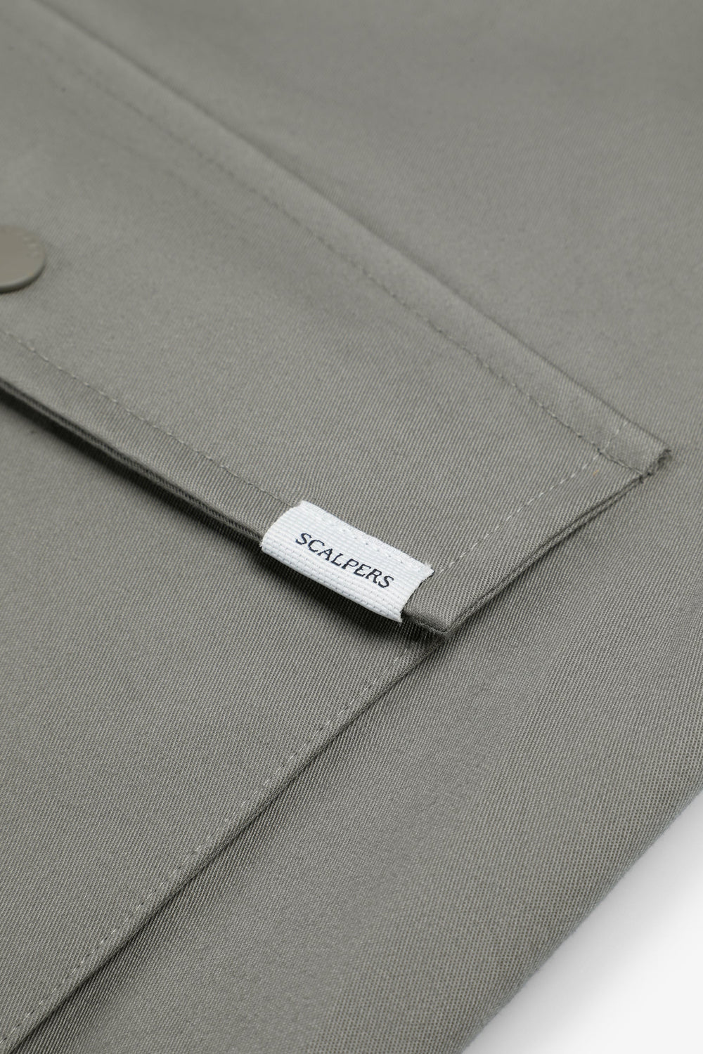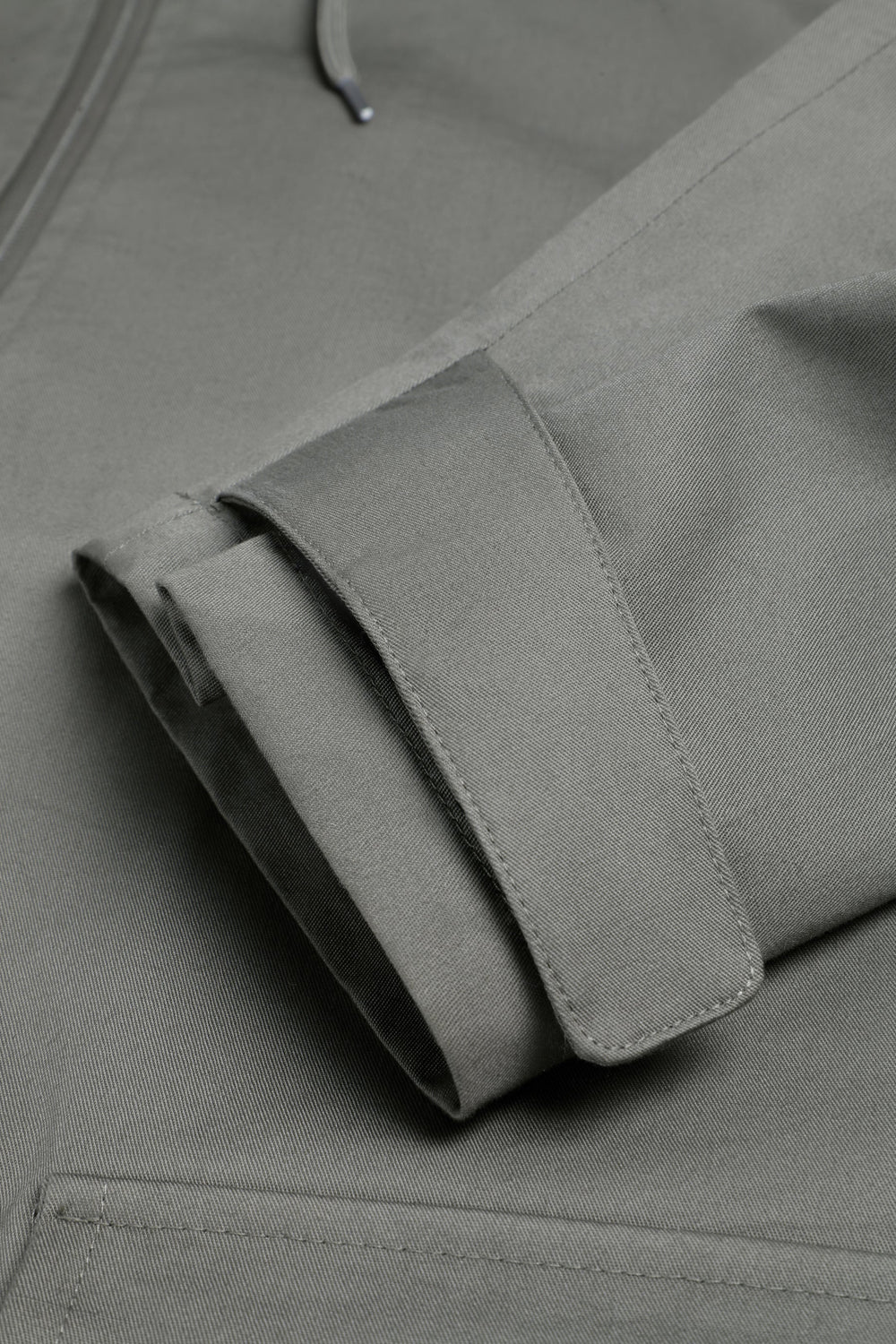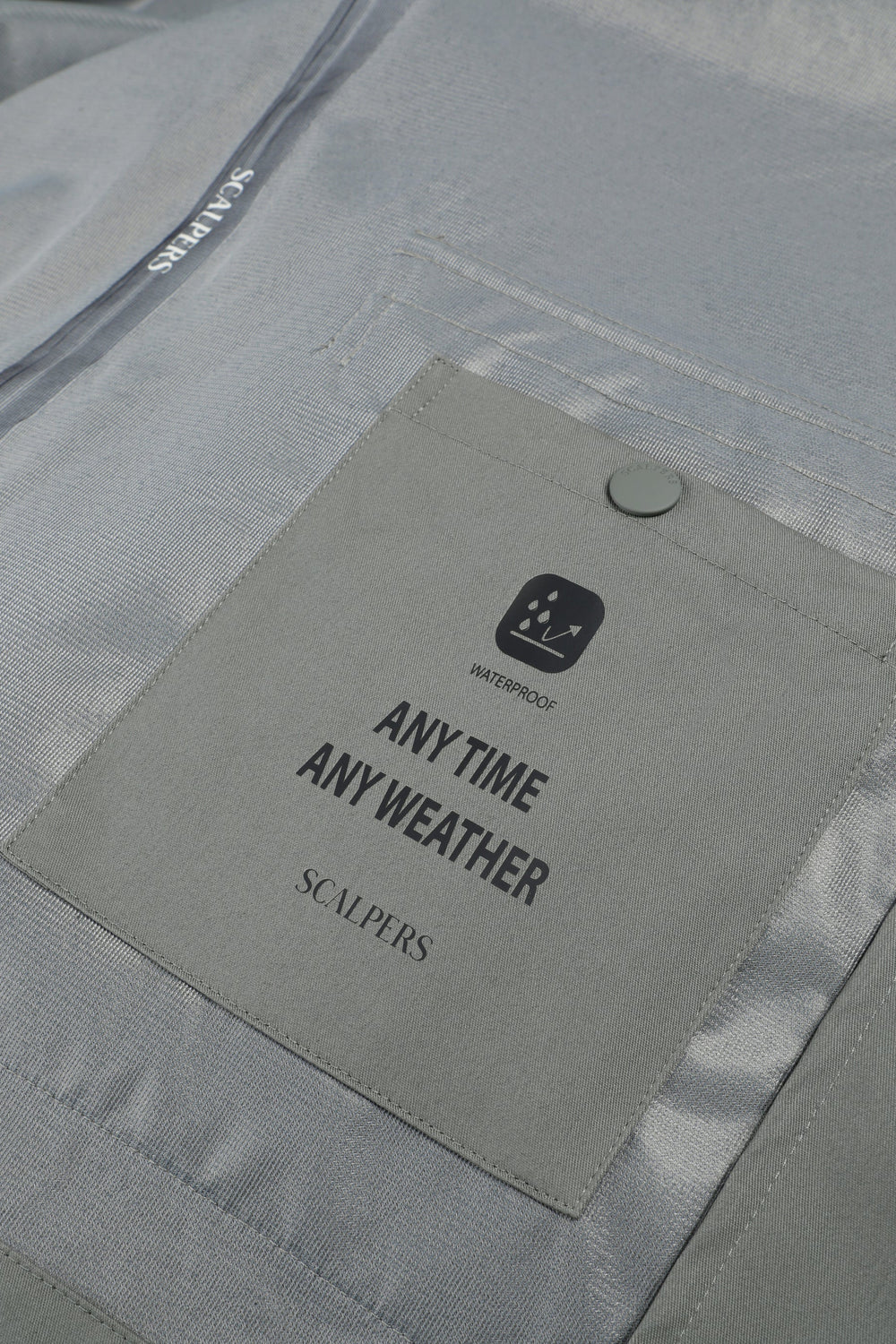 Waterproof technical jacket made of 100% cotton. Adjustable drawstring hood with leather detail. Raglan sleeves. Velcro cuff adjusters. Front fastening with double slider thermo-sealed zip and customised snaps. Two front-flap double-entry pockets (top and side access) with snap fasteners. Logo label detail on the front pocket.