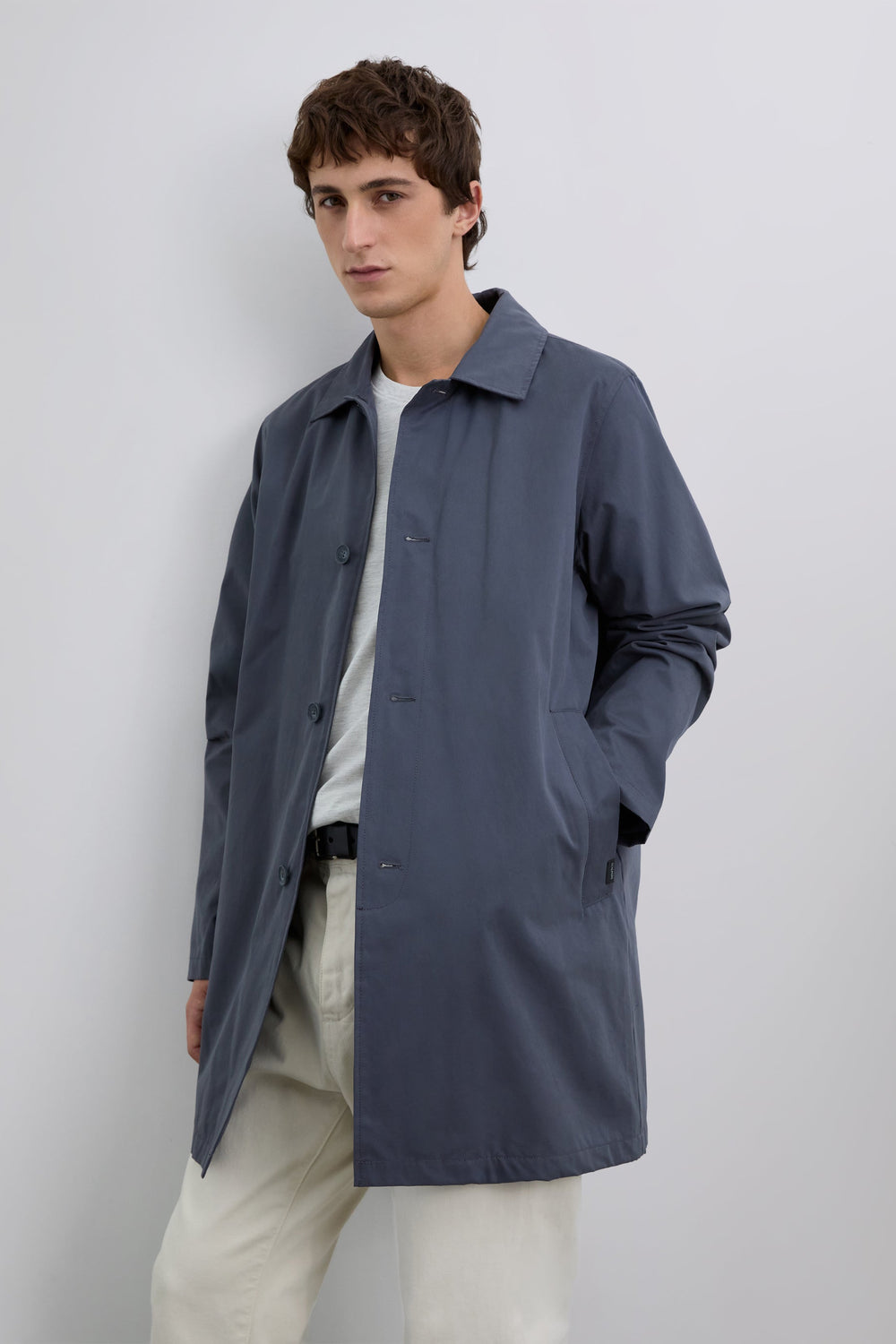 Trench coat with front button fastening. Shirt collar. Two front slant pockets. Stitching details along the length of the garment. Front button fastening. Checked lining. Logo label detail on pocket and inside pocket and skull print on sleeve.