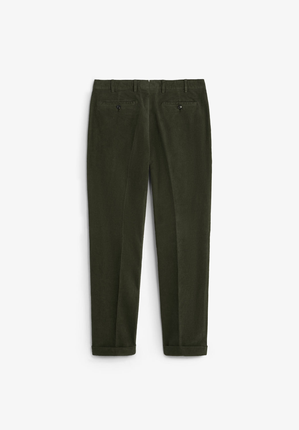 Corduroy chino trousers made of cotton. Loose fit with darts. Concealed zip fastening with an extended button at the waist. Side and back pockets.