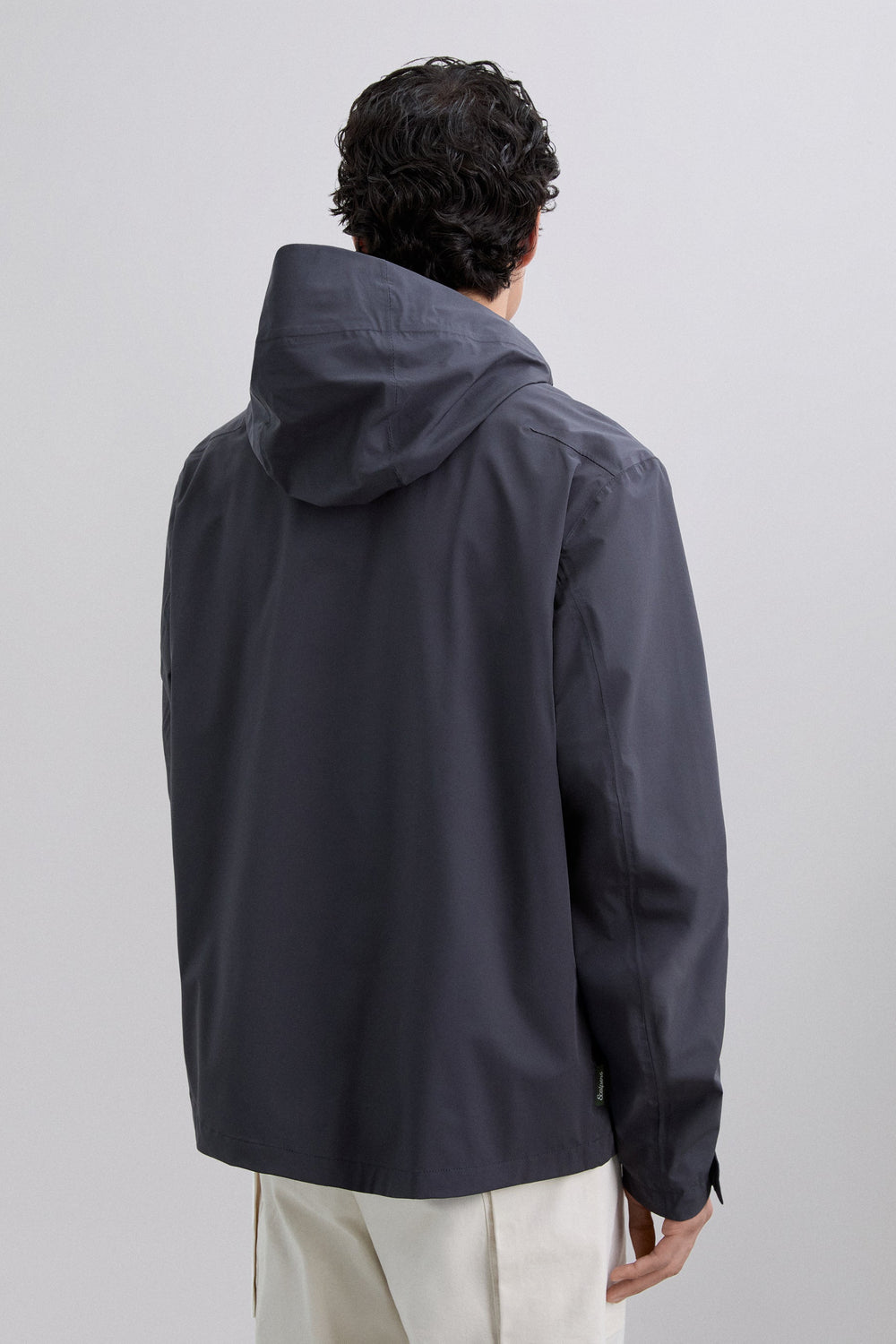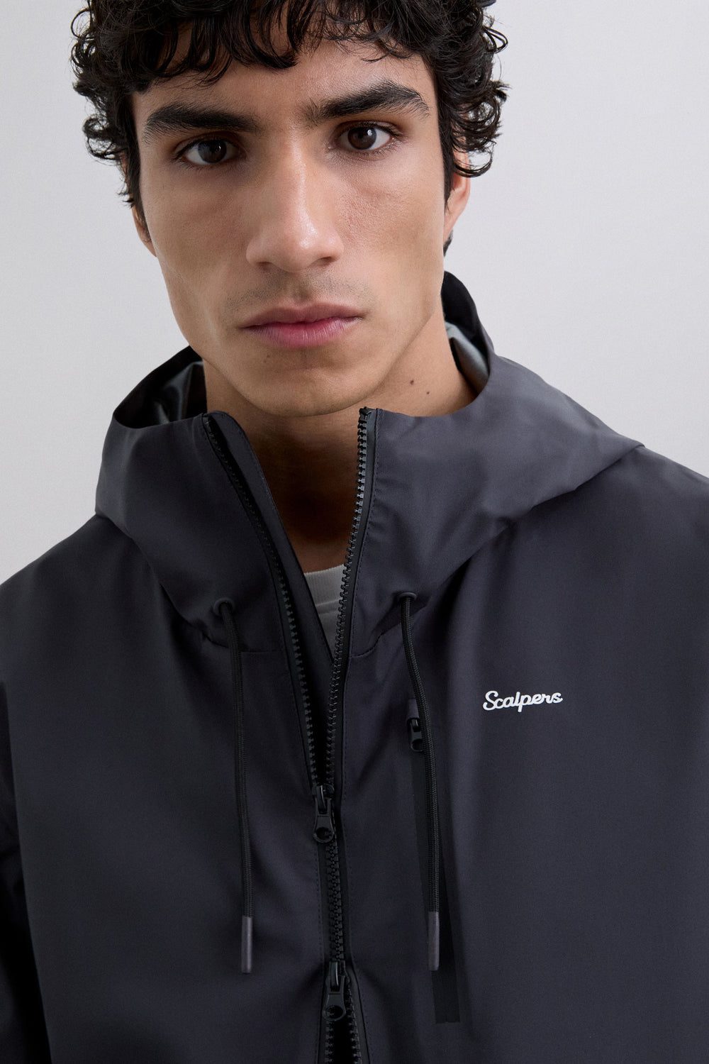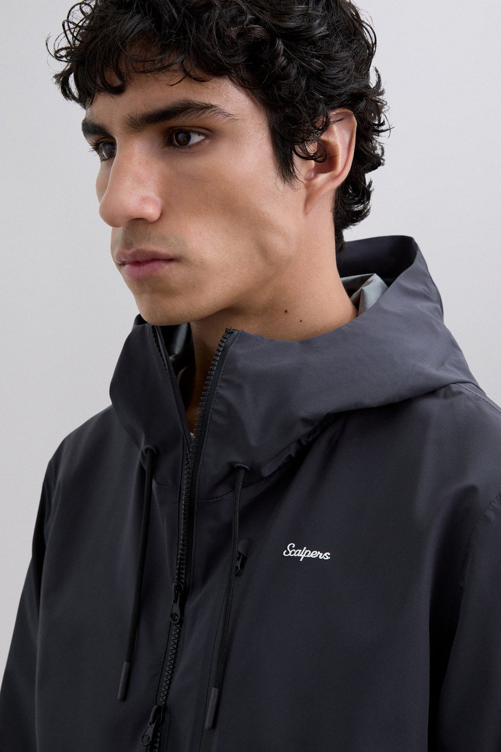 Waterproof jacket featuring an adjustable hood with drawstring. Heat-sealed zip fastening. Long sleeves. Chest pocket with heat-sealed zip and side flap pockets with snap closure. Contrast logo detail on the front and skull motif on the back of the hood.