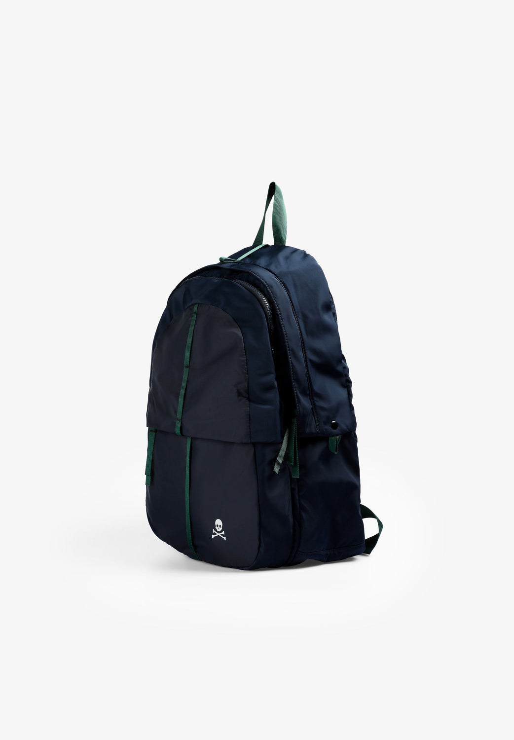 Technical backpack with zipped outer pocket, adjustable side pockets, padded mesh handles and back. Inner zipped pocket at back. Contrast logo on the front.