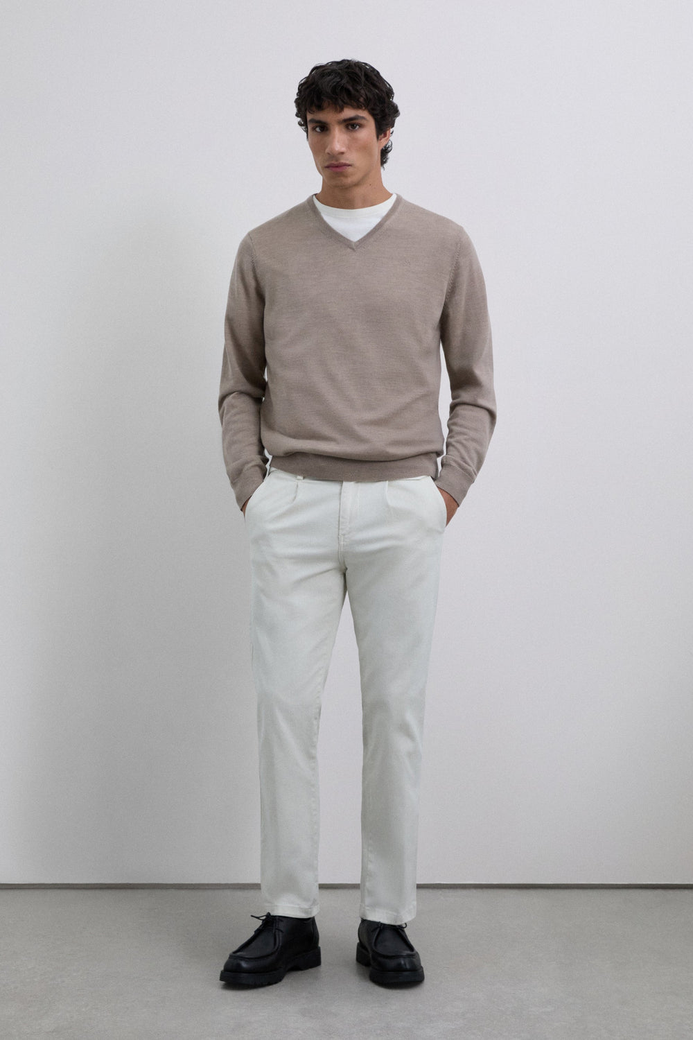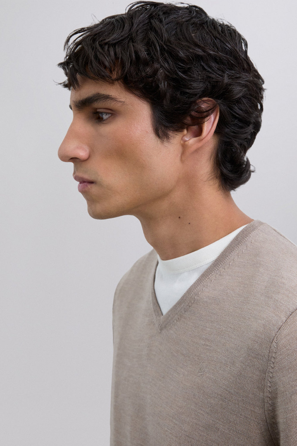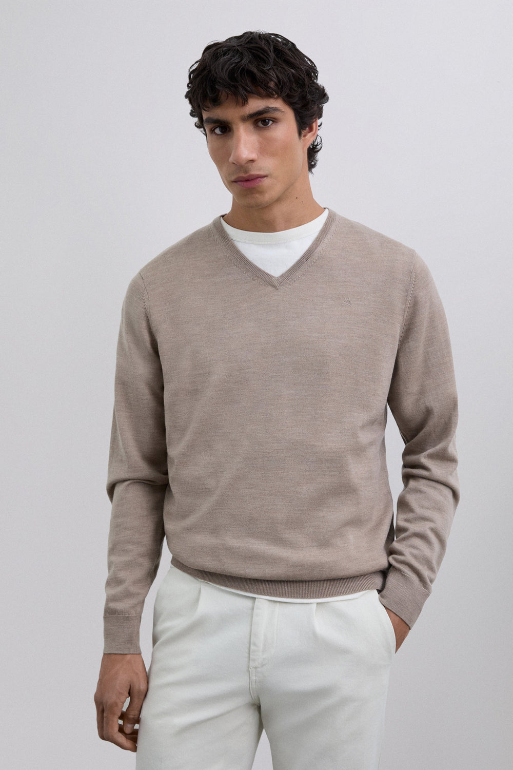 Sweater made of 100% wool. Regular Fit. V-neck. Long sleeves. Matching embroidered skull detail on the chest. Ribbed trim.
