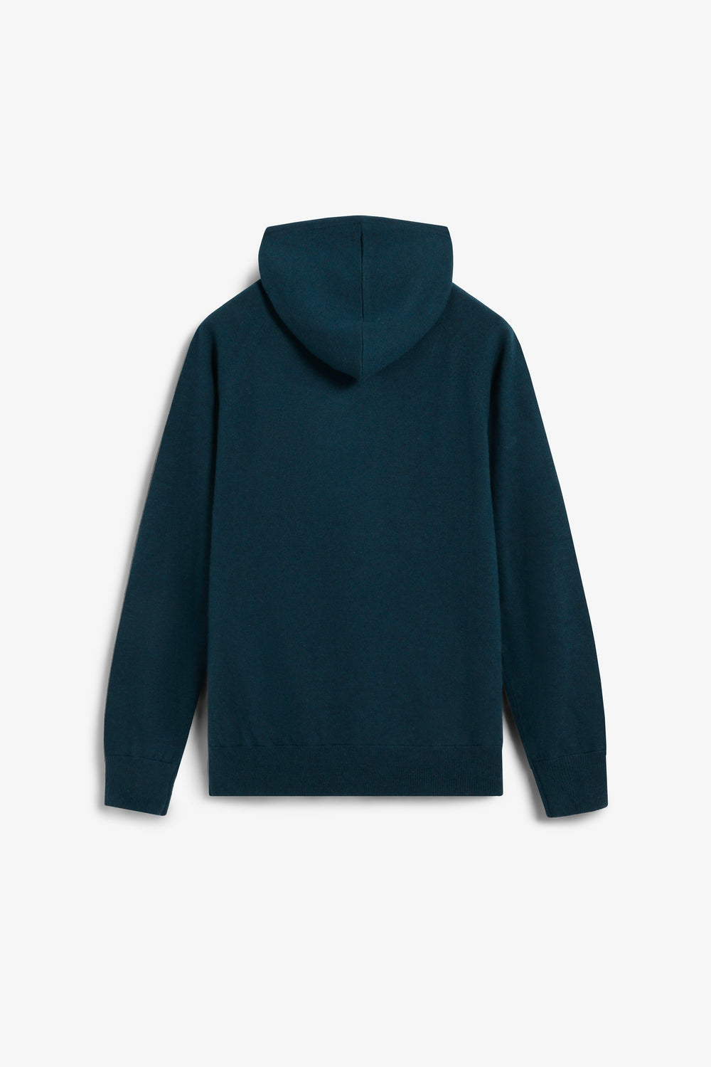 Sweater made of 100% wool. Adjustable drawstring hood. Long sleeves. Pouch pocket on the front. Ribbed cuffs and waistband.