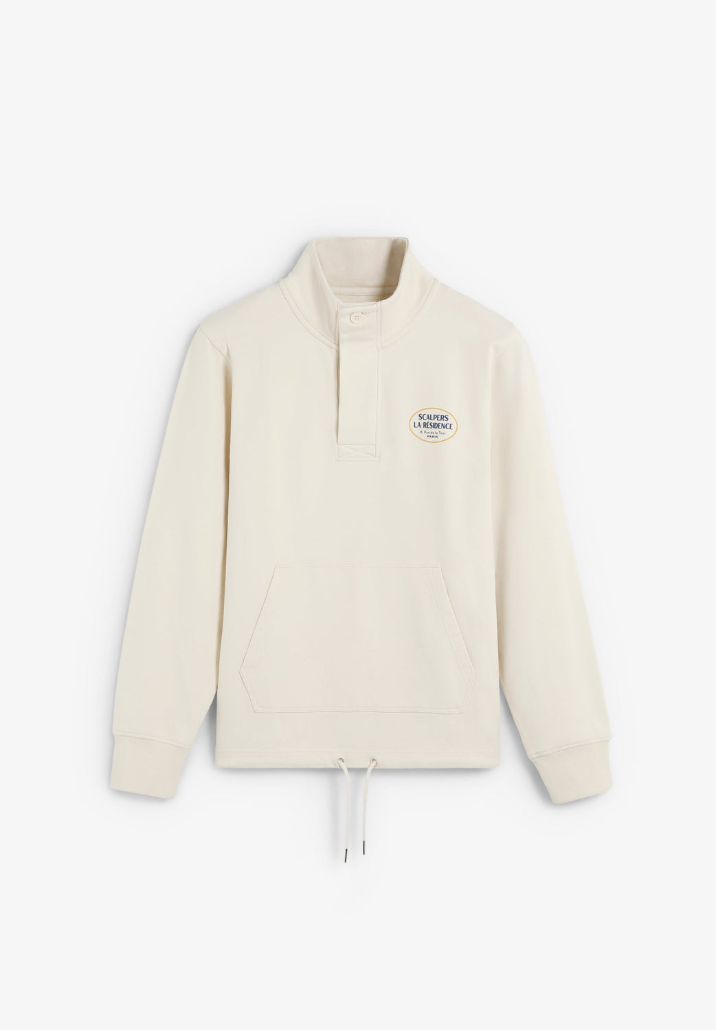 Sweatshirt made of 100% BCI cotton. Long sleeves. High collar and button fastening. Print logo on the chest. Pouch pocket on the front. Adjustable fastening with drawstring at the waist.