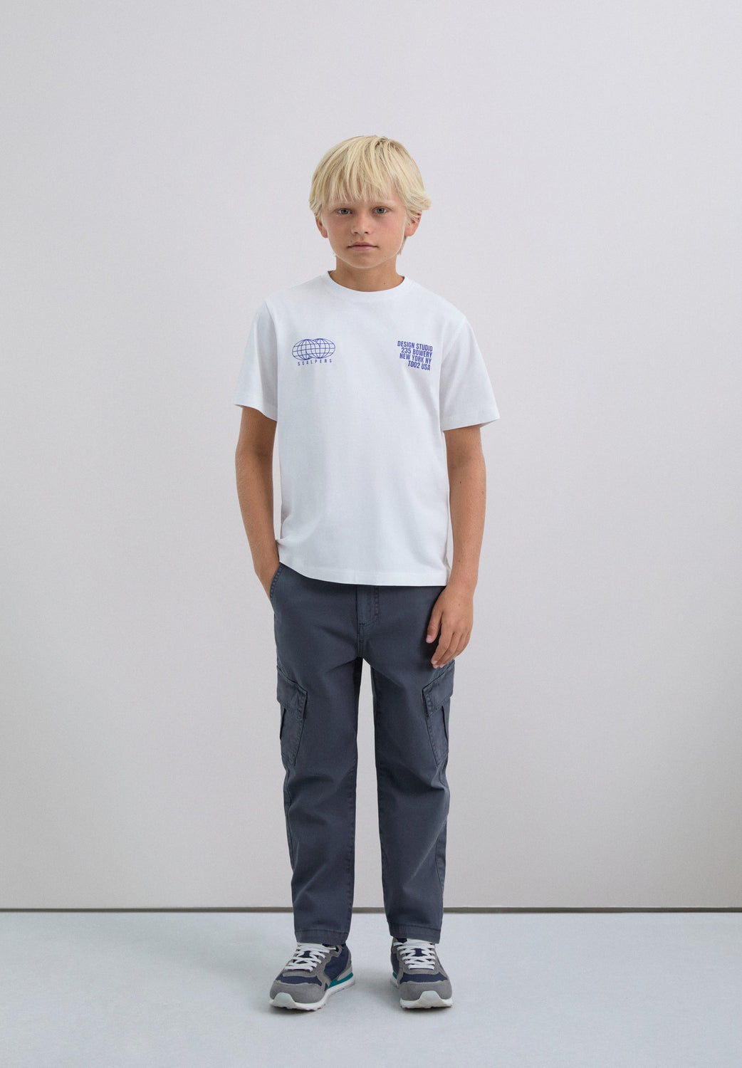 Cargo trousers made of slightly stretch BCI cotton. Regular fit, top button and zip fastening and side pockets. Belt loops at the waist and flap pockets on the leg.