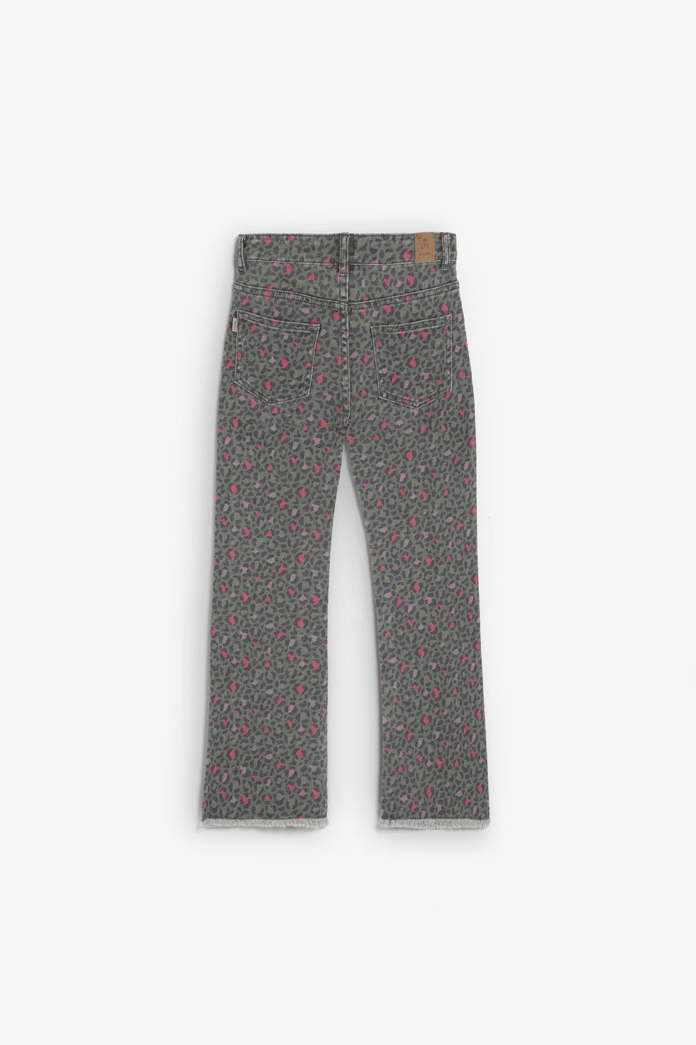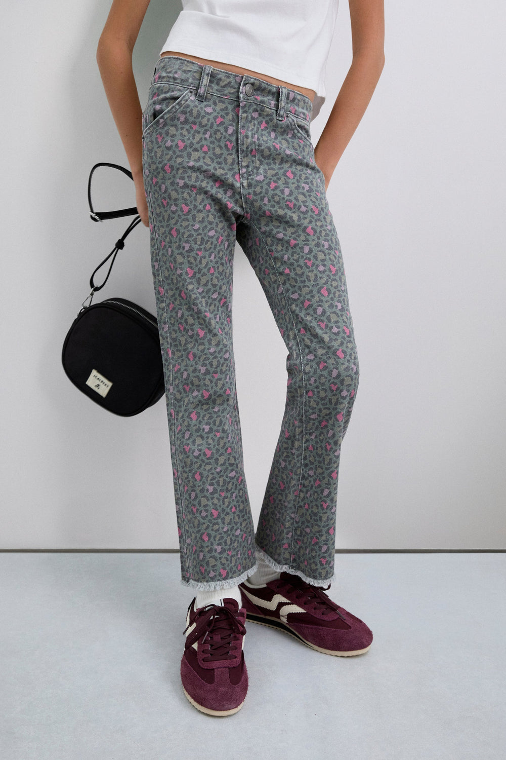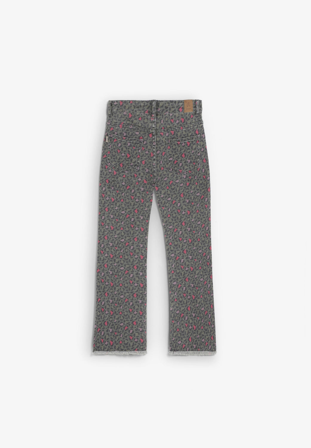 Denim jeans. Two front pockets. Two back pockets with skull and logo label detail. Frayed motif on the hems. Belt loops at the waist. Button and zip fastening. Animal print.