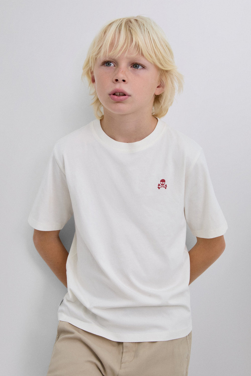 T-shirt made of 100% BCI cotton. Regular fit, short sleeves and round neck. Skull on chest and print on back.