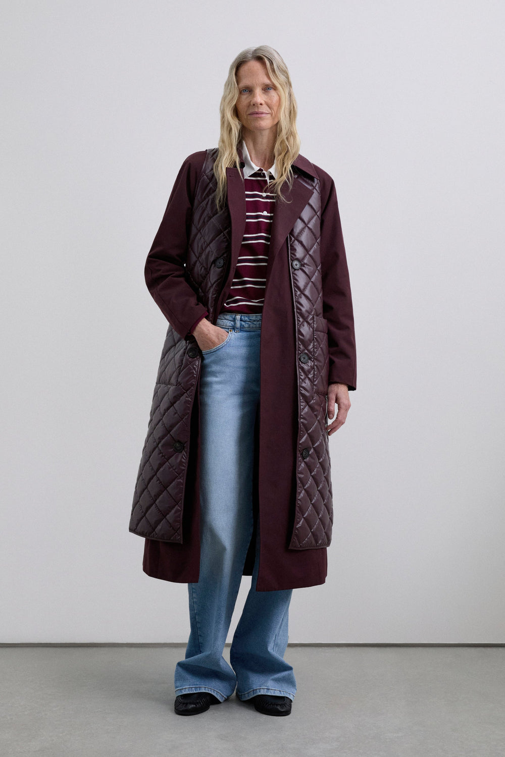 Waterproof trench coat. Slightly oversize. Collar with button fastening and front fastening with buttons and belt. Long sleeves. Detachable puffer vest.